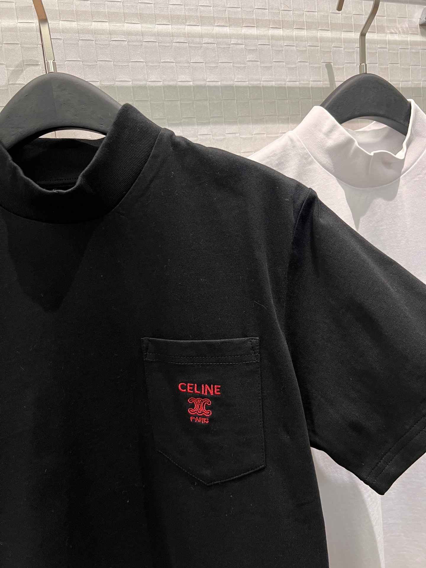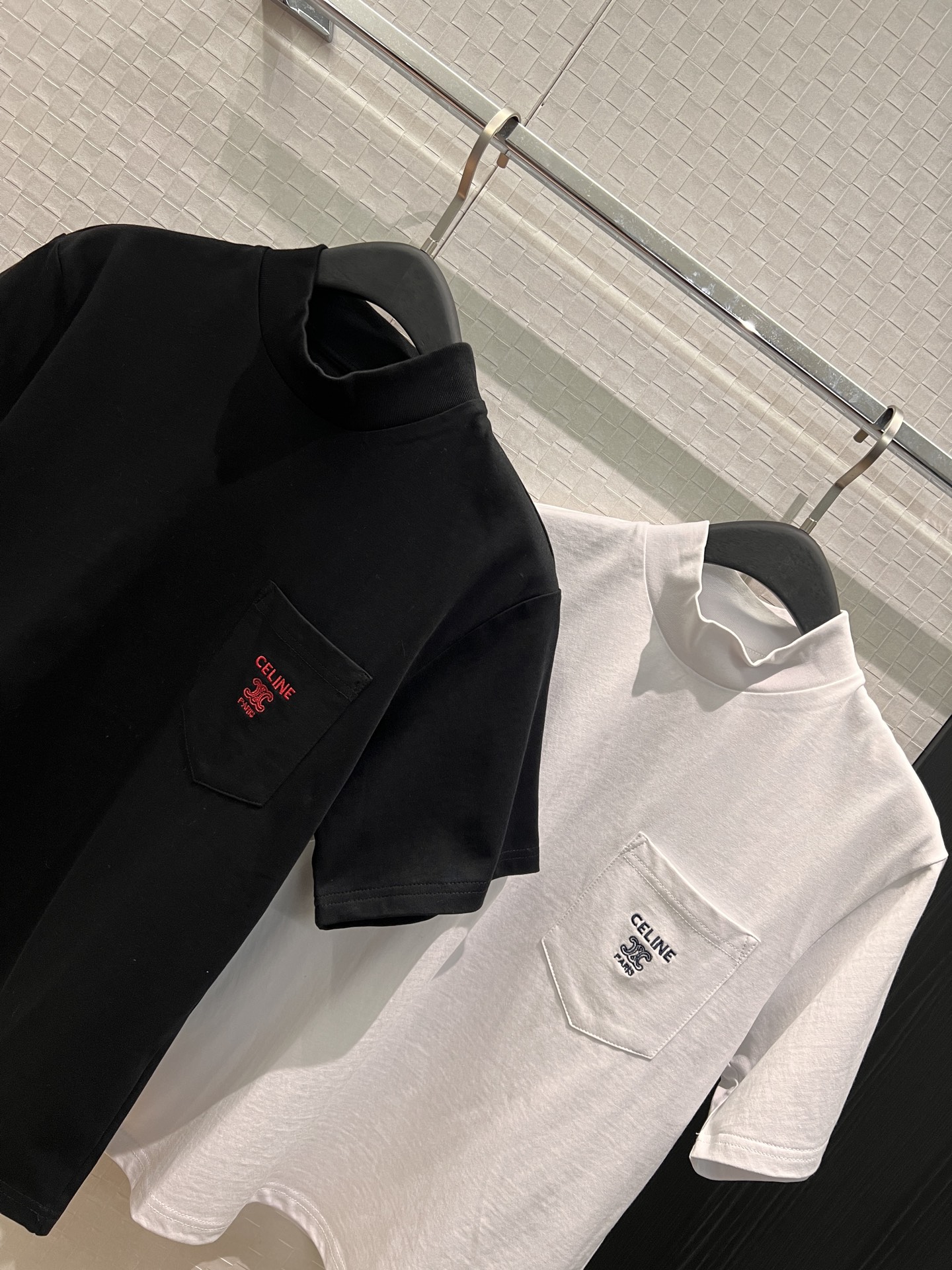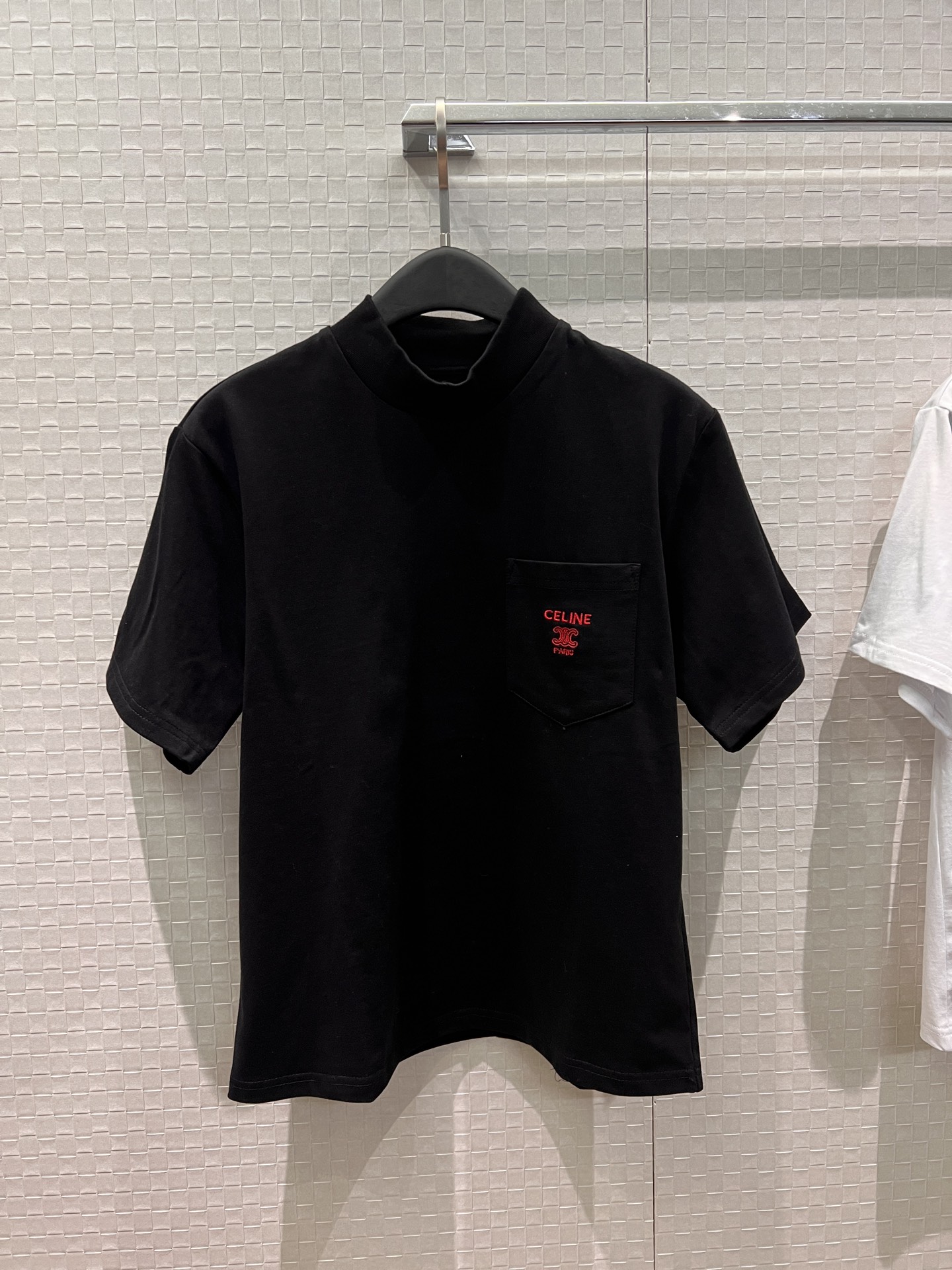 Details: New high-neck T-shirt with arch embroidery pocket, simple and casual.