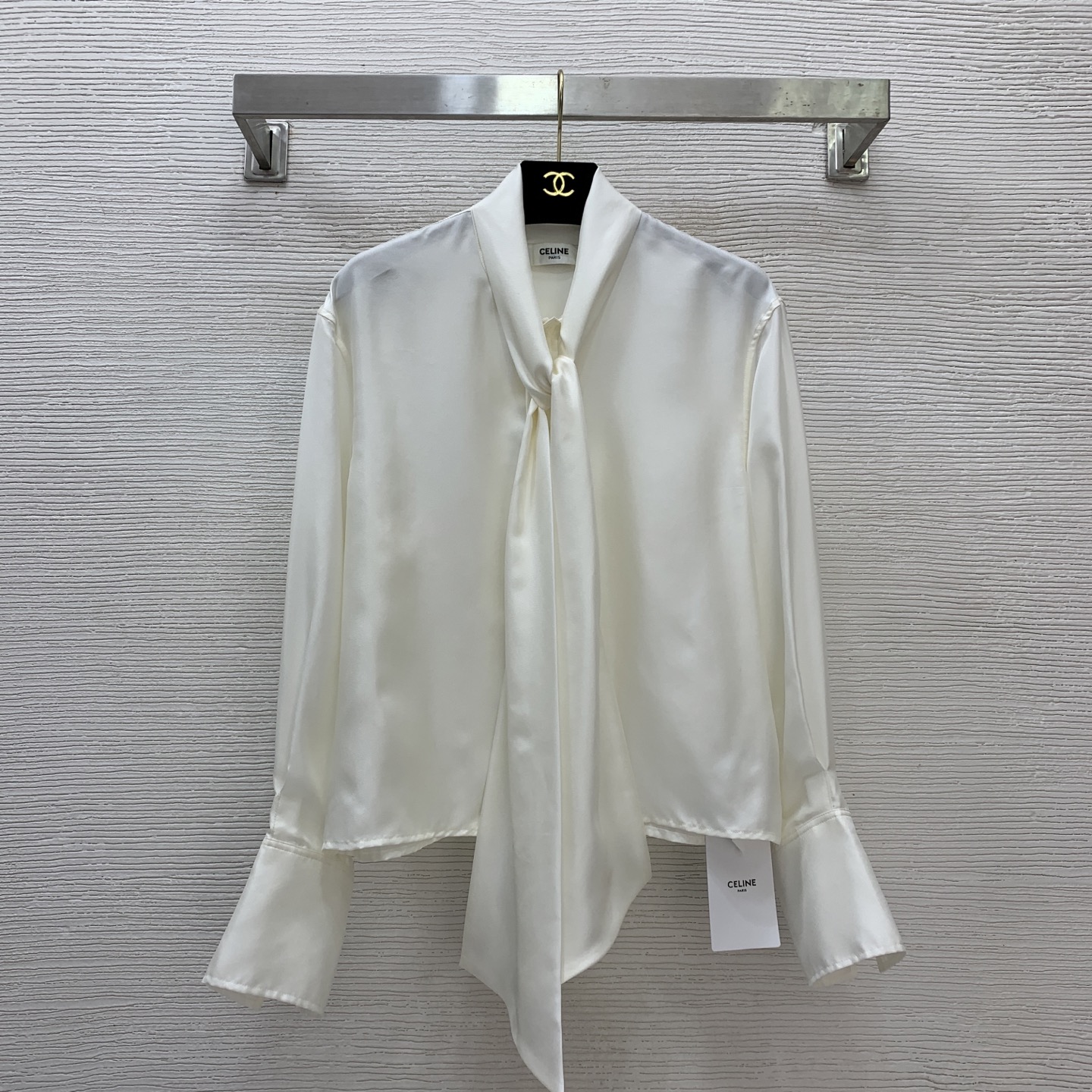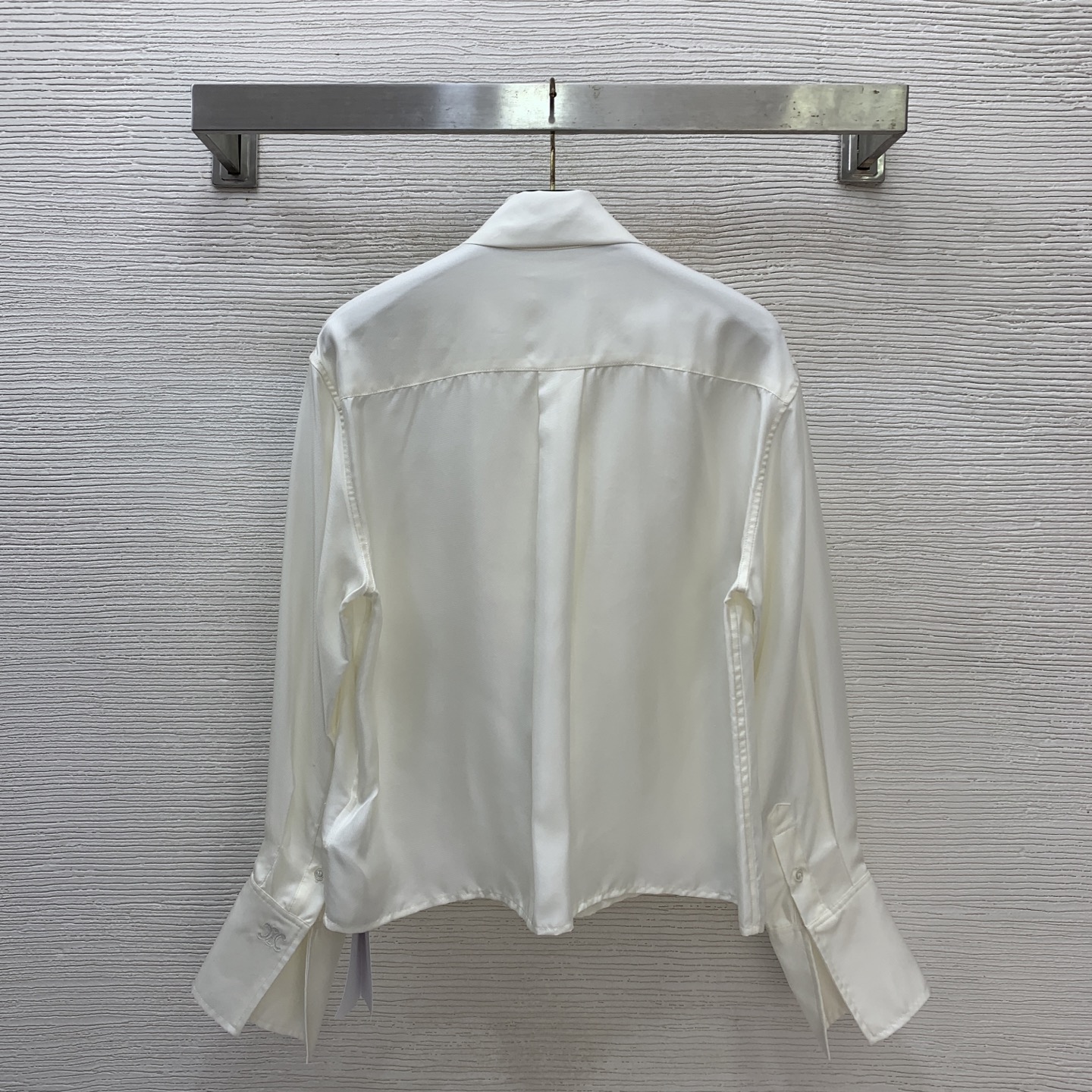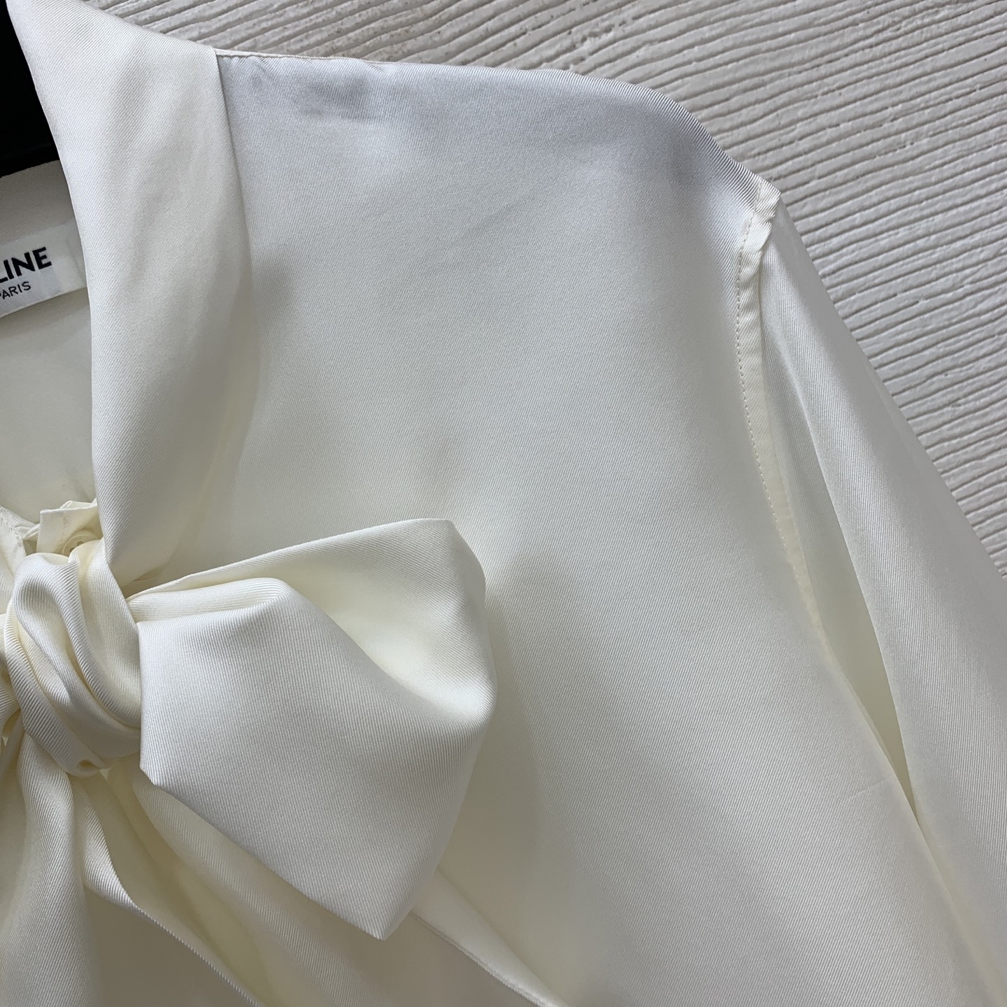 Details: Off-white early spring silk blouse featuring a tie neckline and branded button accents. Finest craftsmanship, bespoke high-end creation, ensuring original-like quality.