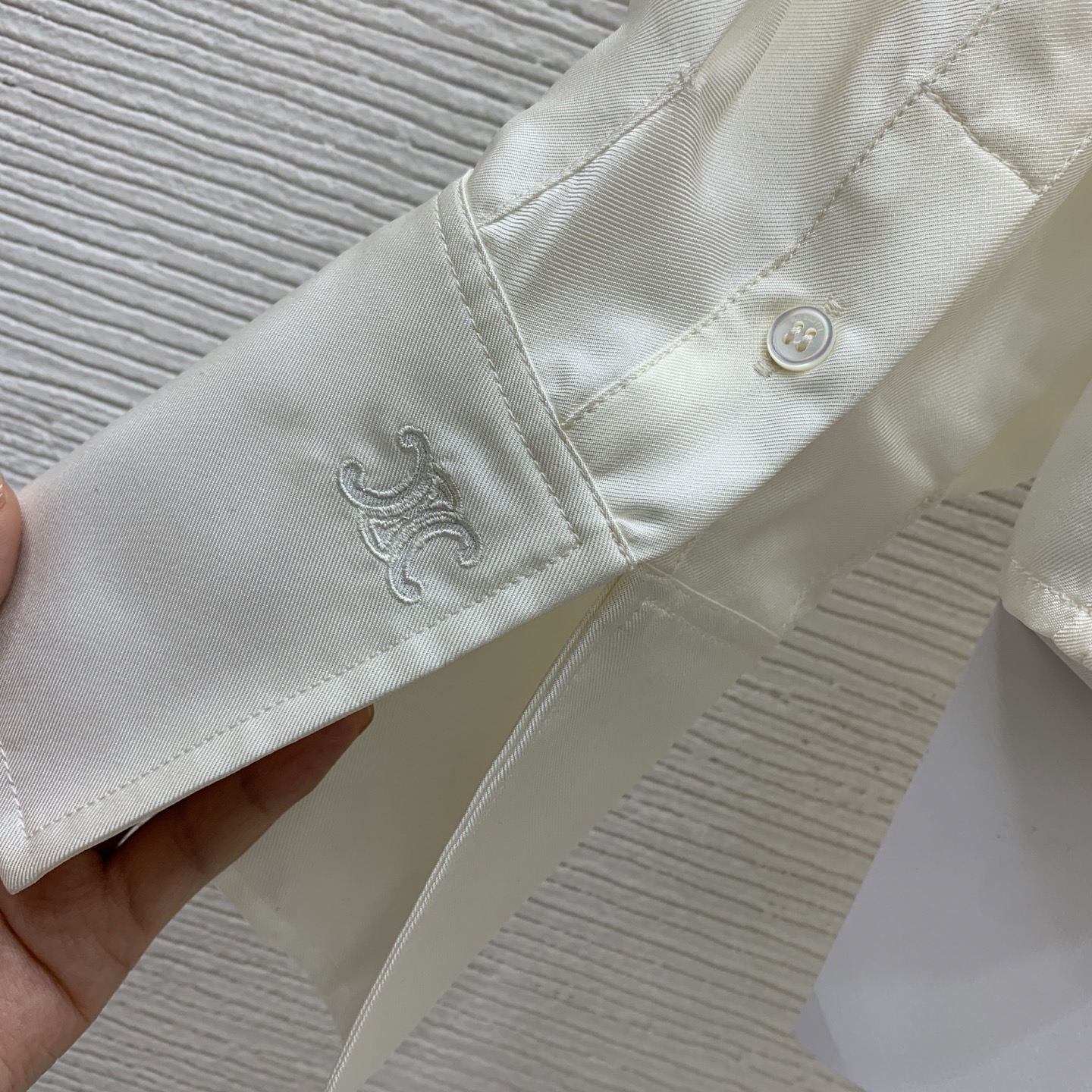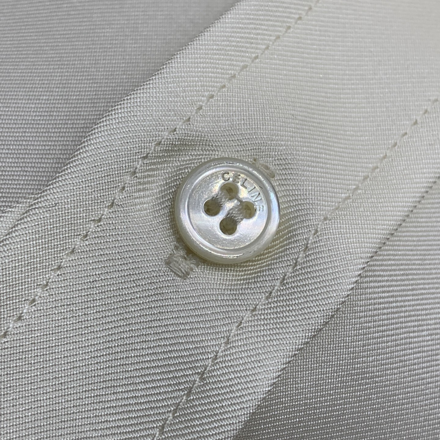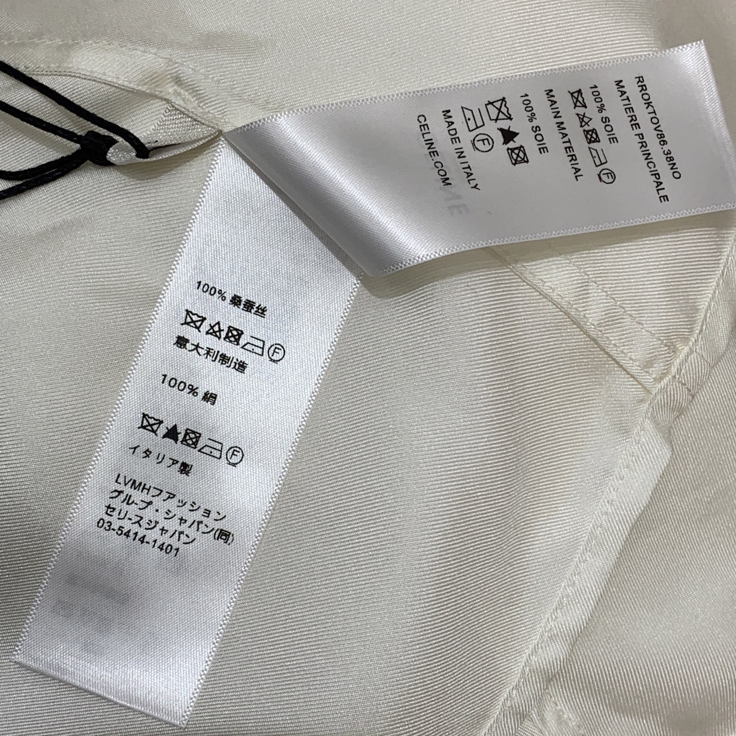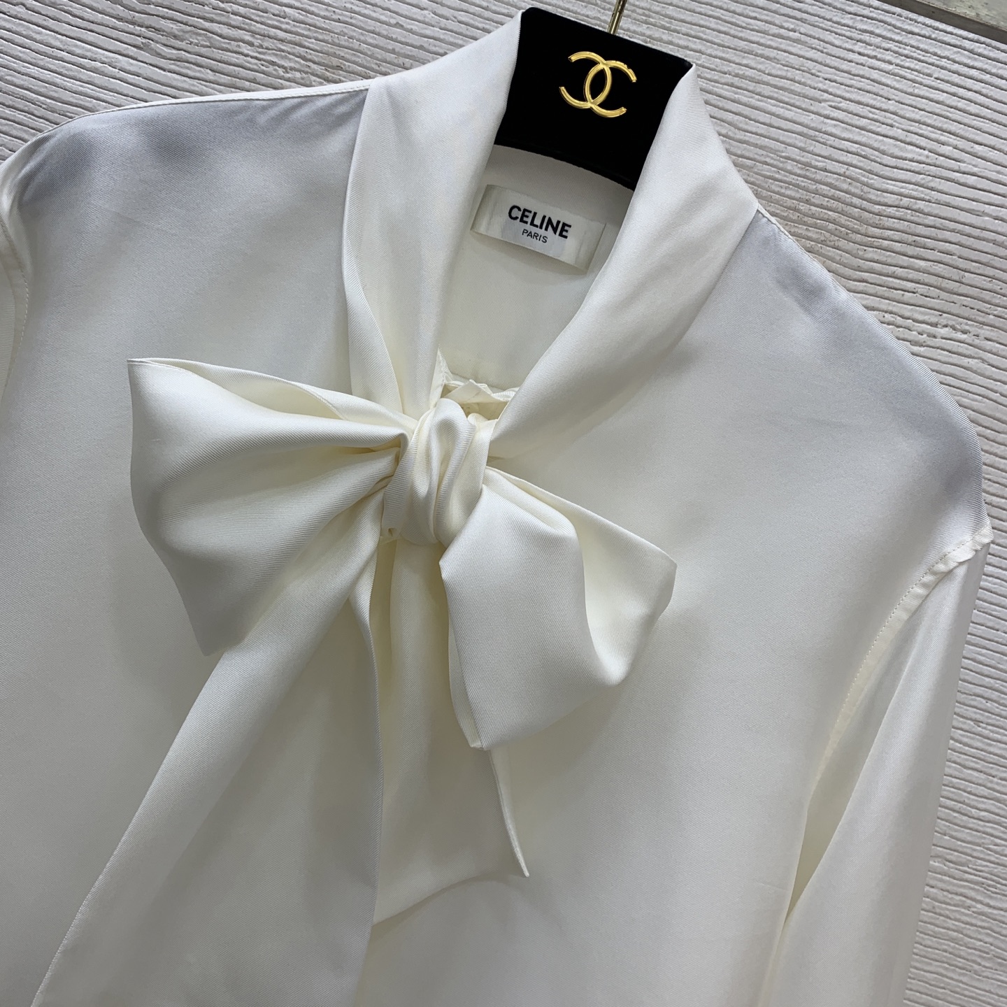 Details: Off-white early spring silk blouse featuring a tie neckline and branded button accents. Finest craftsmanship, bespoke high-end creation, ensuring original-like quality.