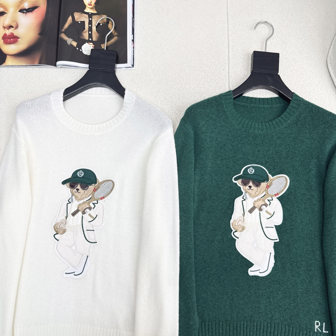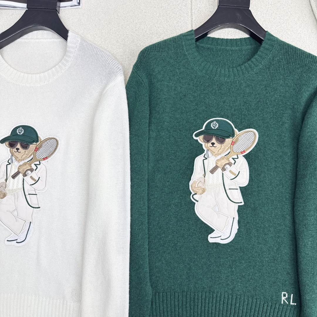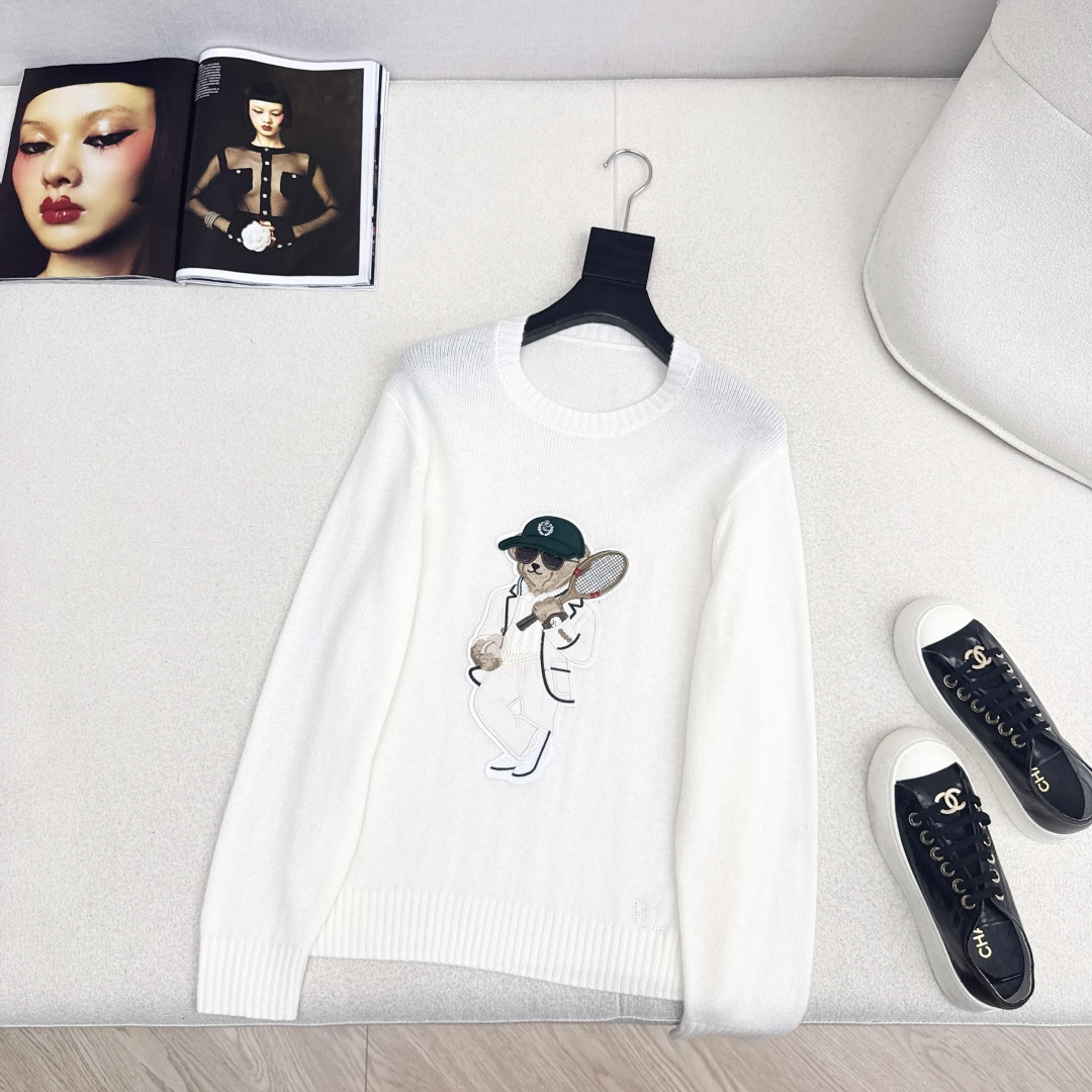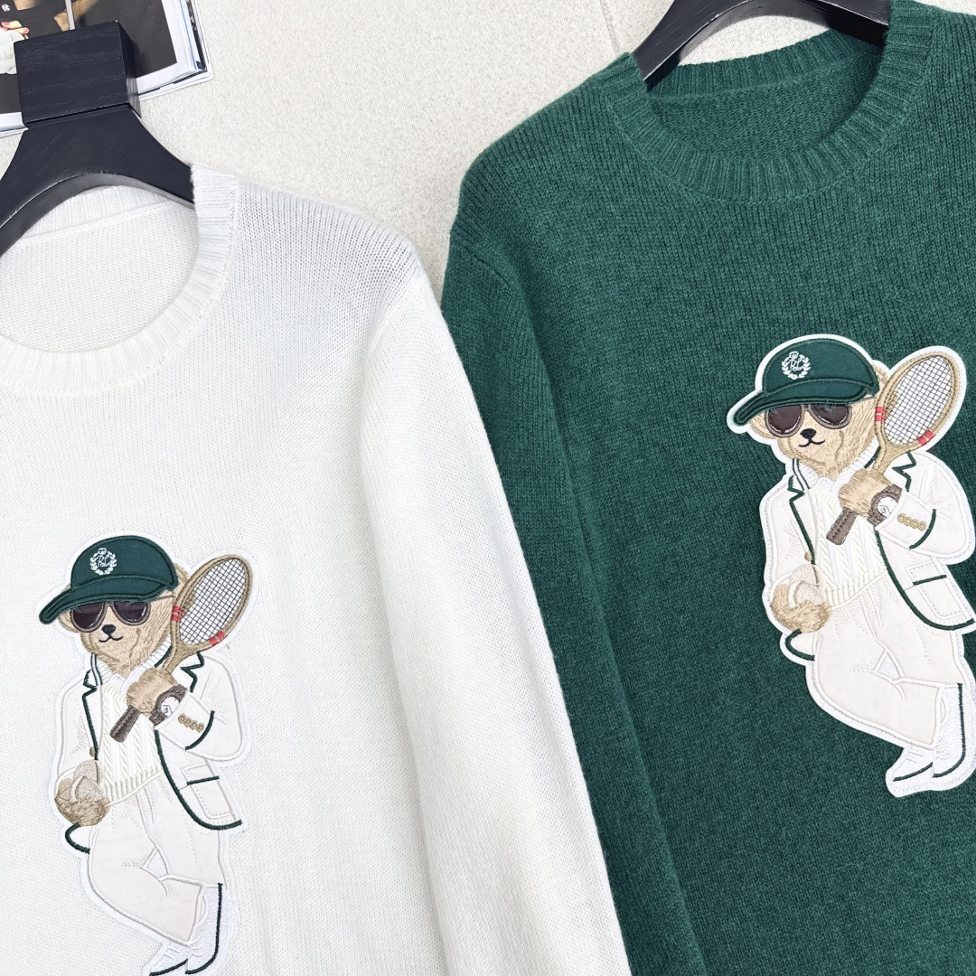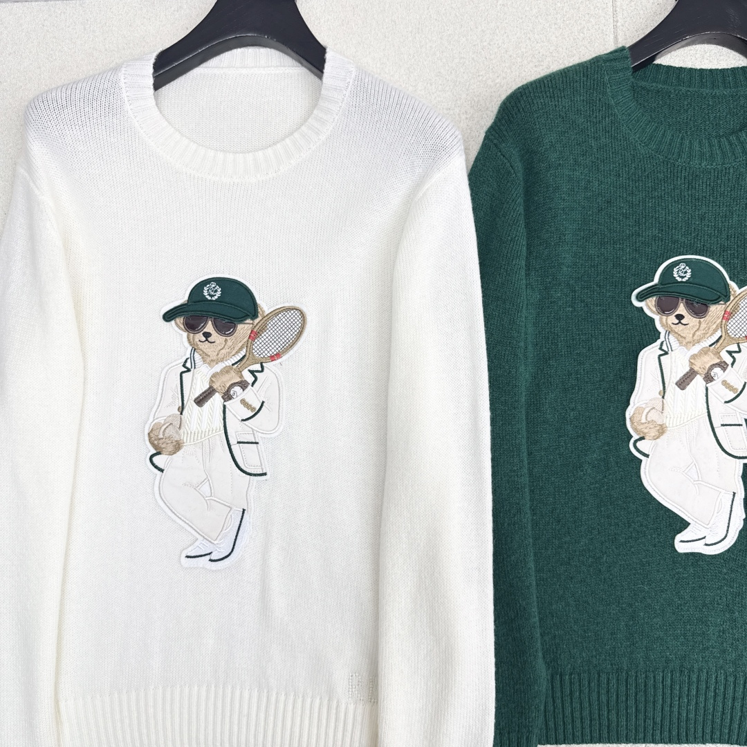 Details: Autumn and winter tennis hat paired with a bear-embroidered sweater, crafted from imported yarn, available in two colors.