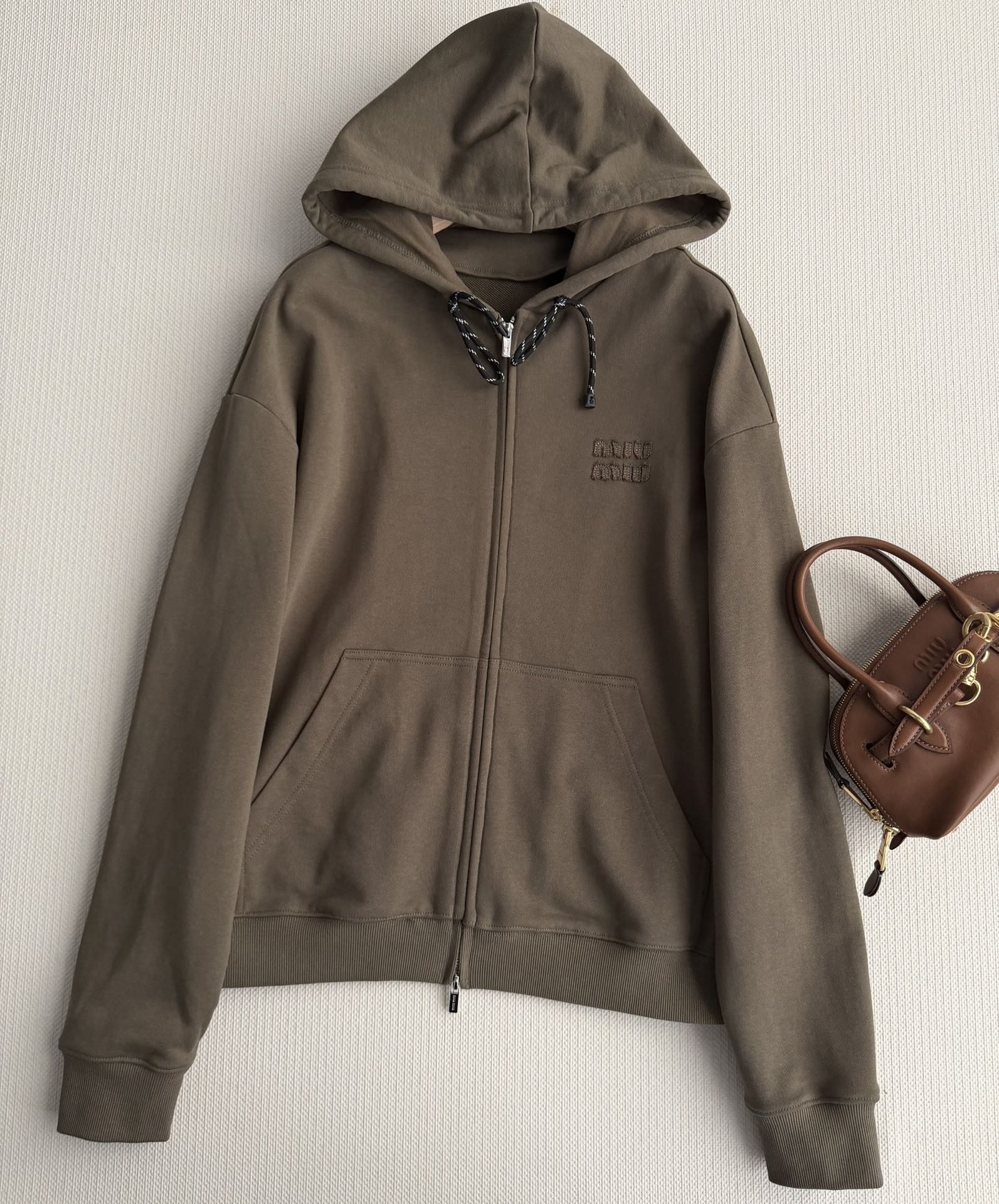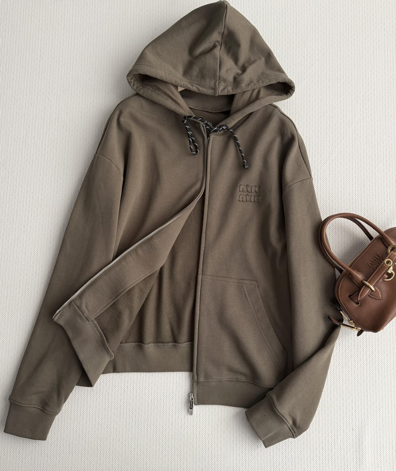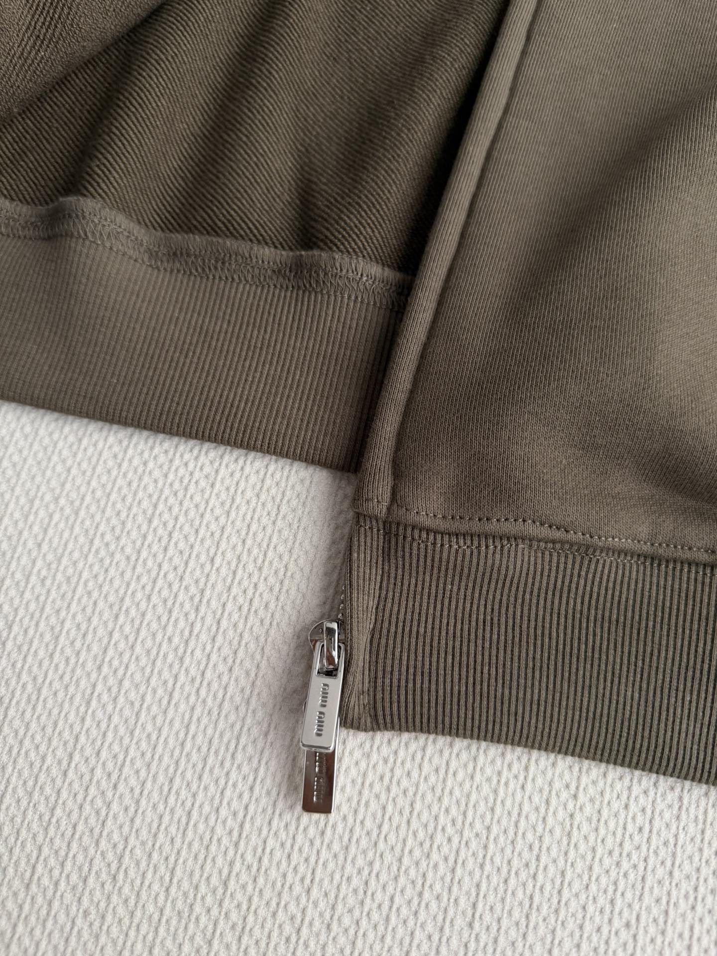 Details: Miu Miu s new olive green hoodie, with a loose fit and crafted from pure cotton, features a zipper and drawstring hood for casual outings.