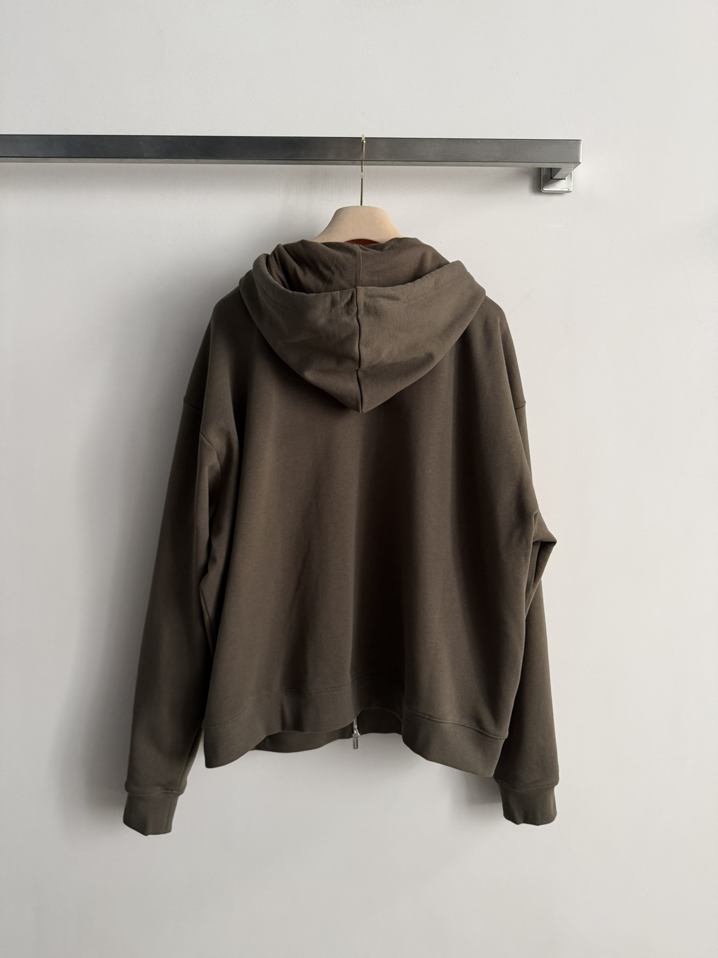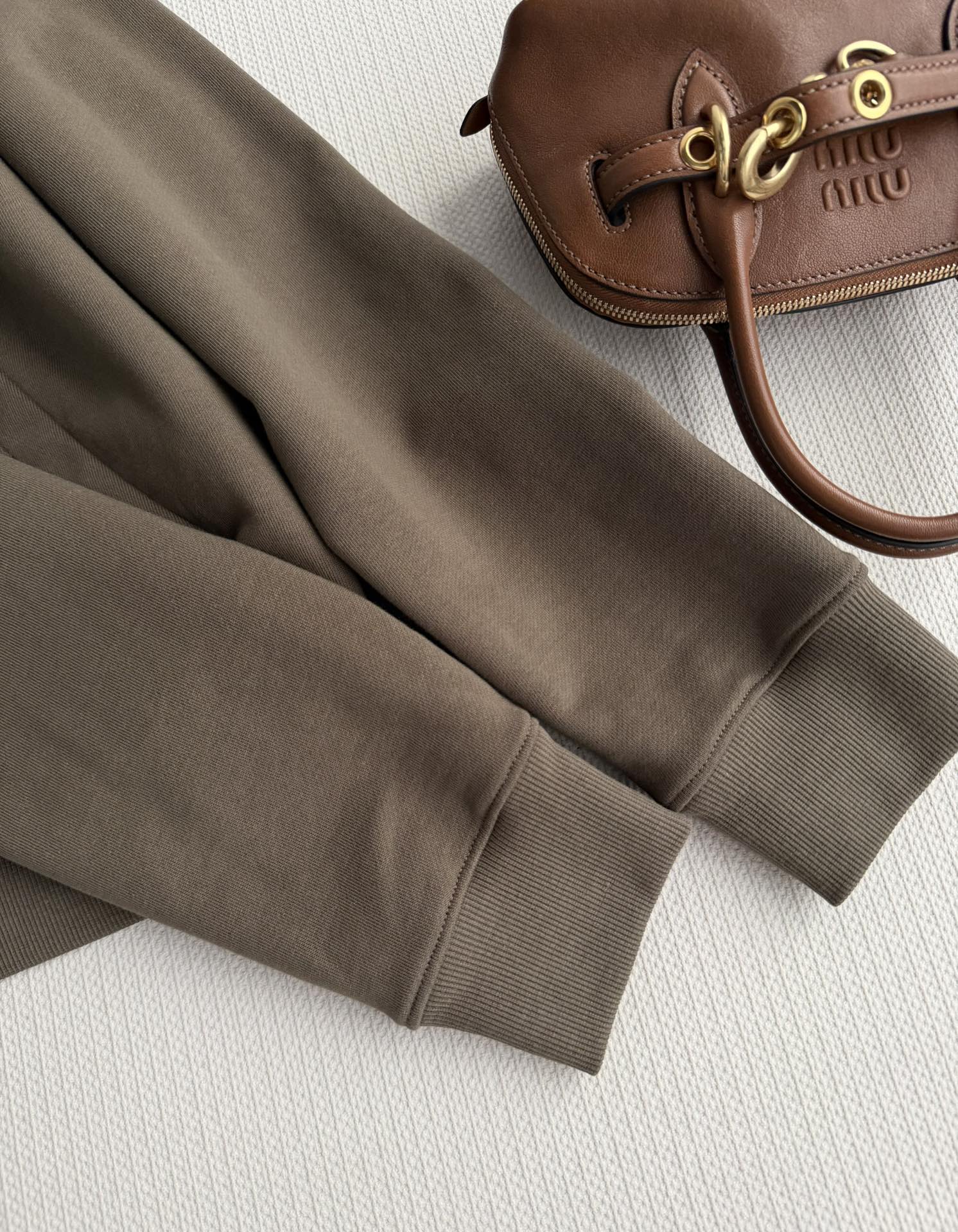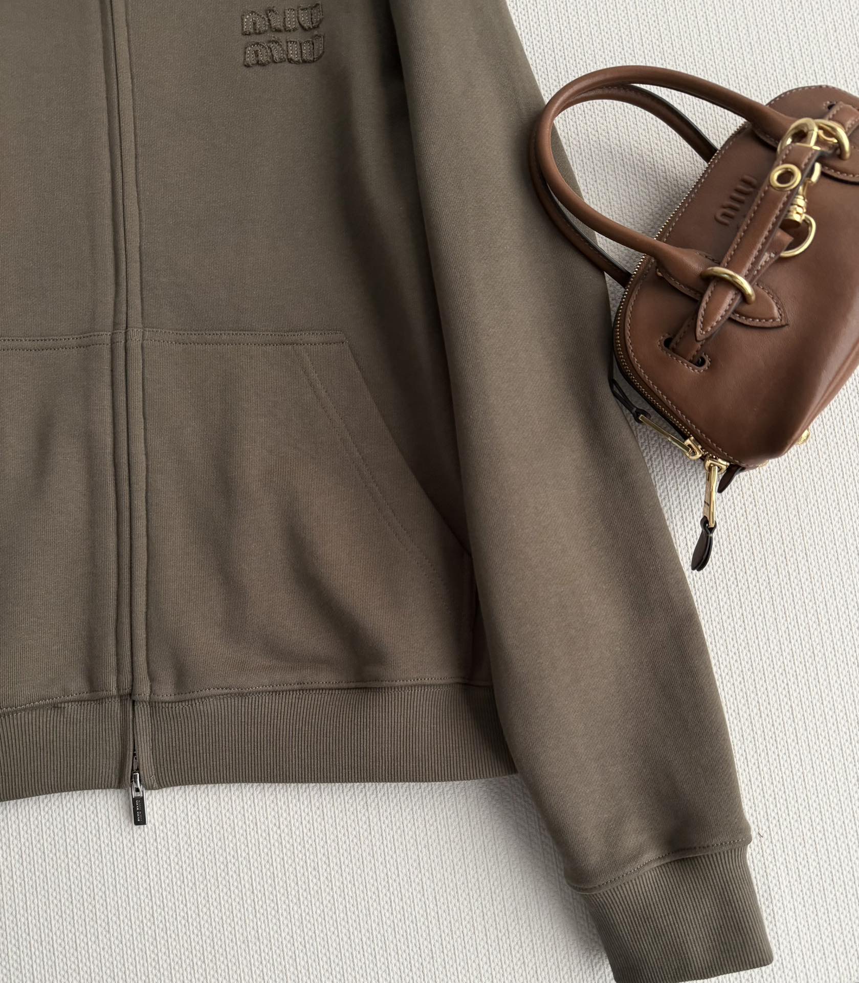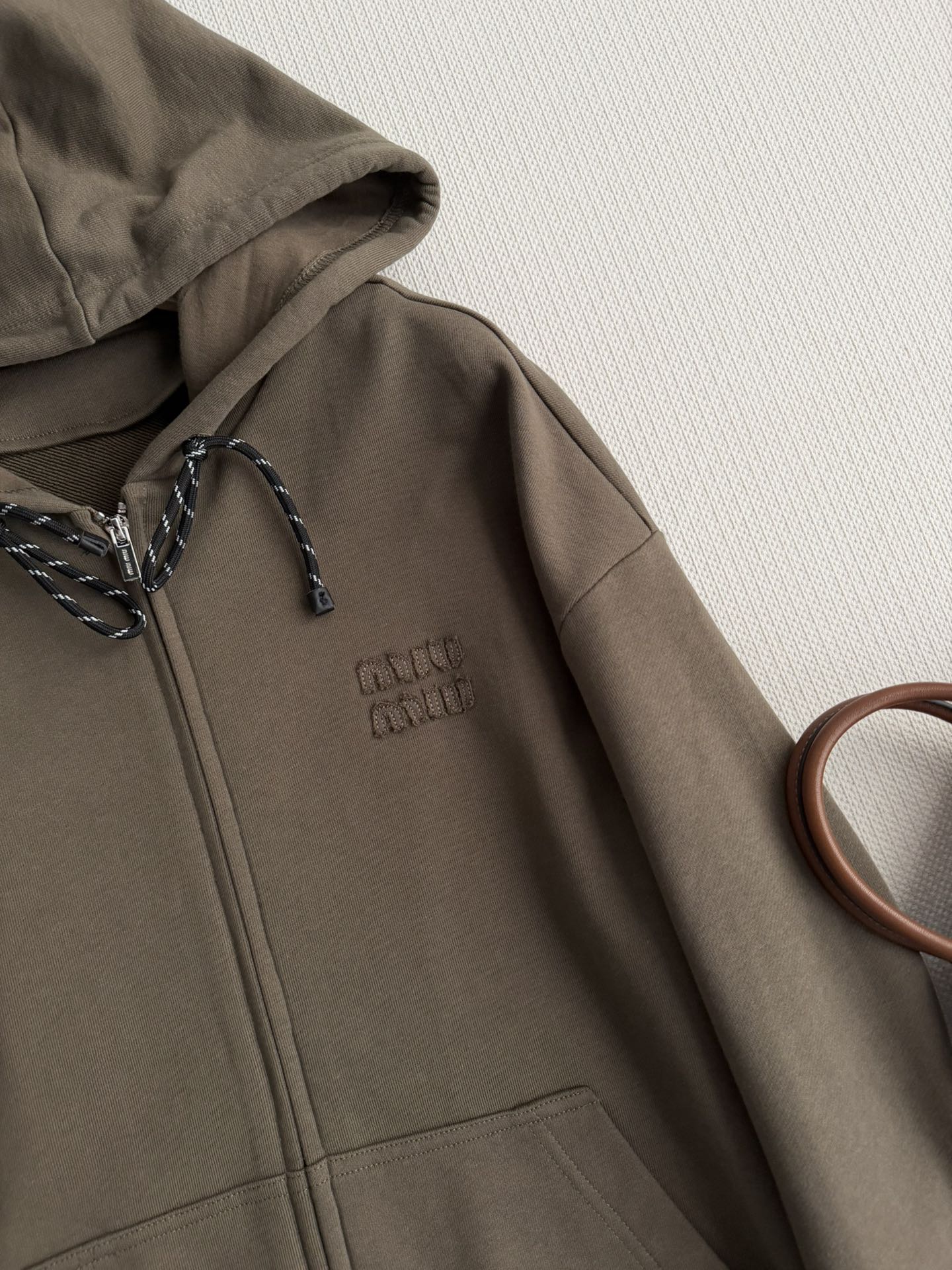 Details: Miu Miu s new olive green hoodie, with a loose fit and crafted from pure cotton, features a zipper and drawstring hood for casual outings.