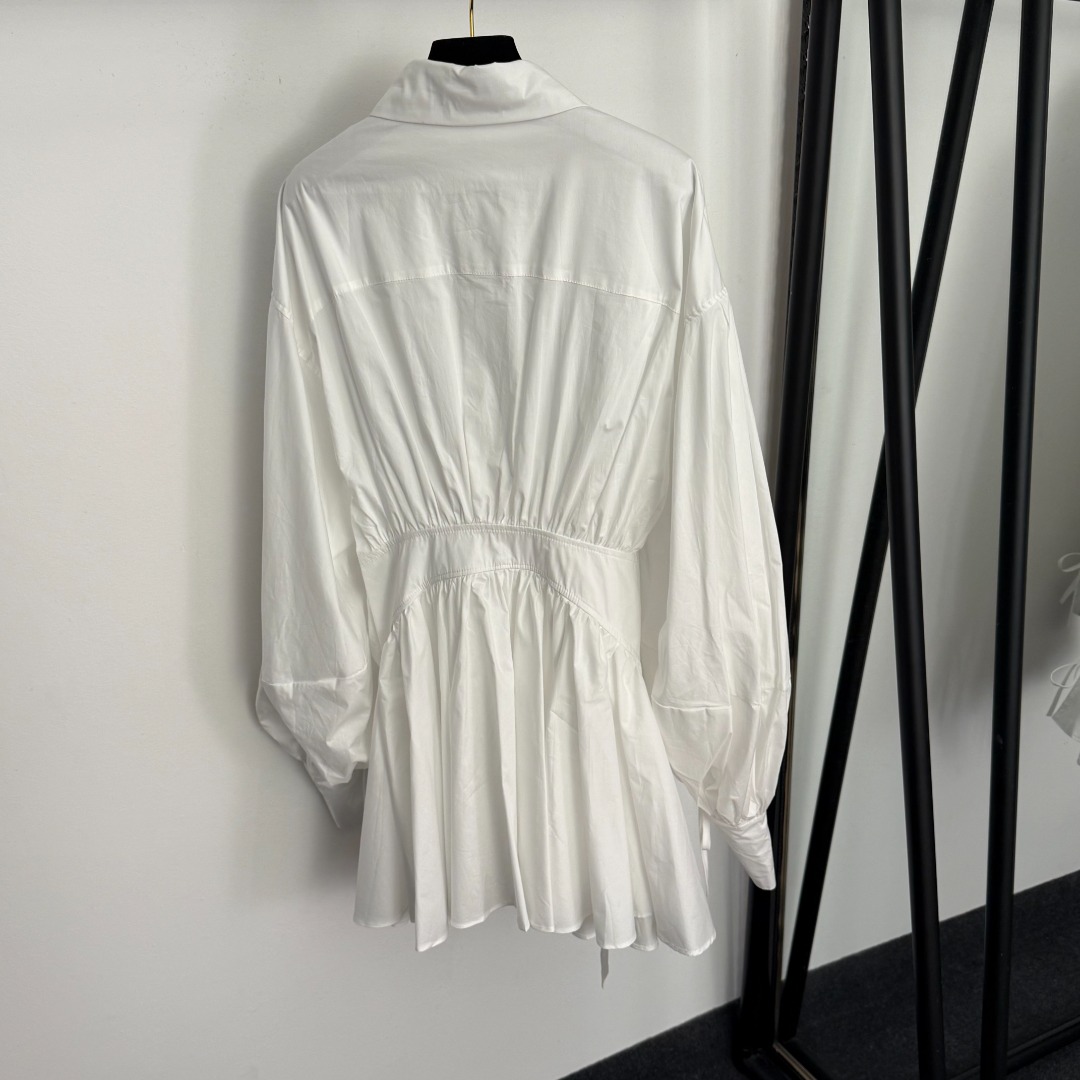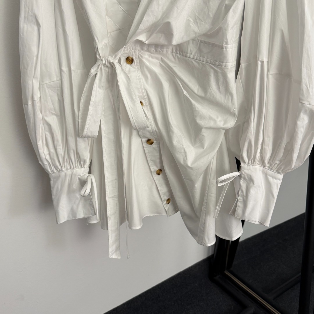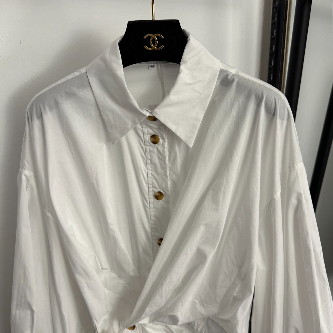 Details: New side-laced waist irregular single-breasted lantern sleeve shirt dress in white, available in S XL M sizes.