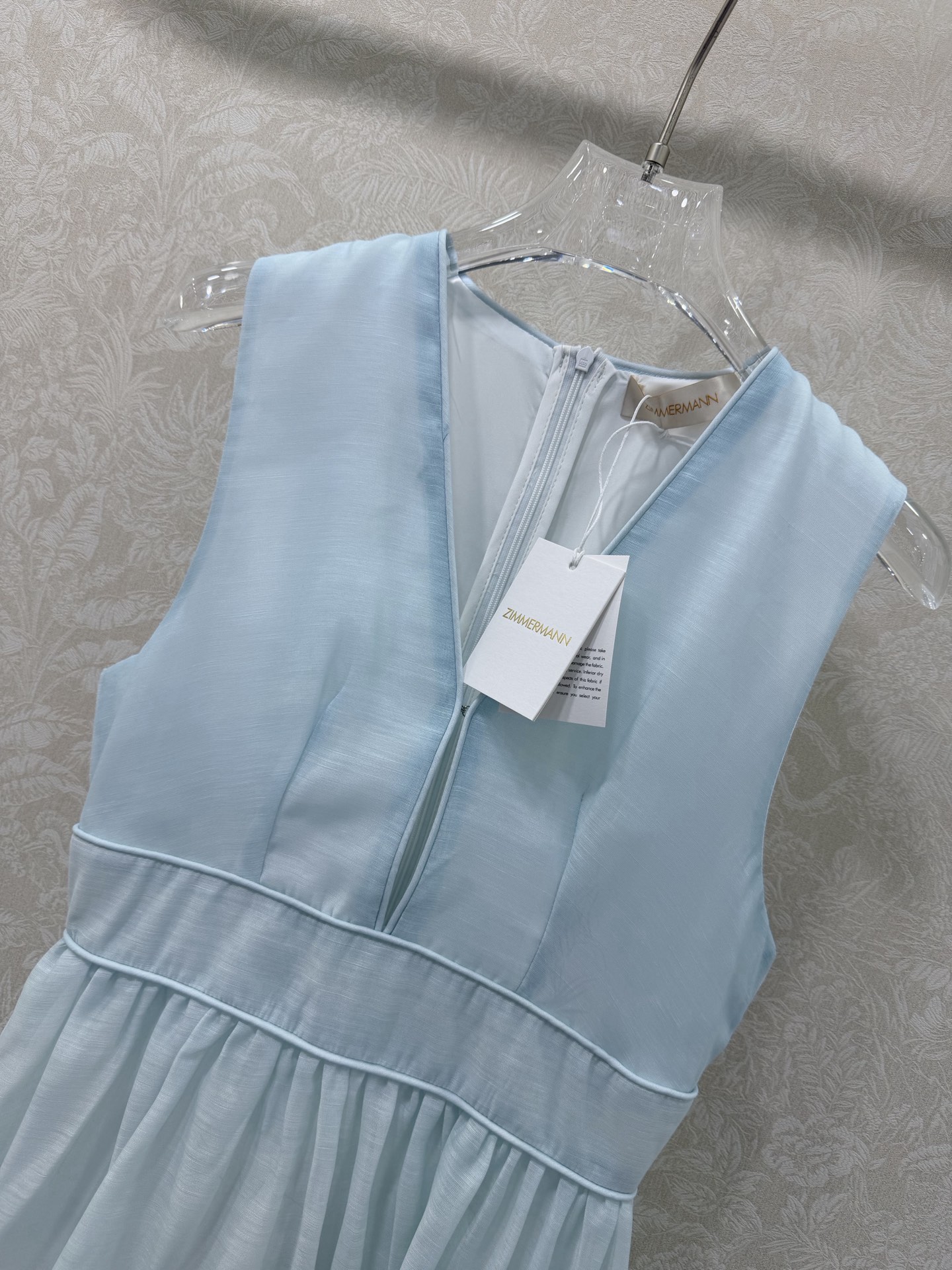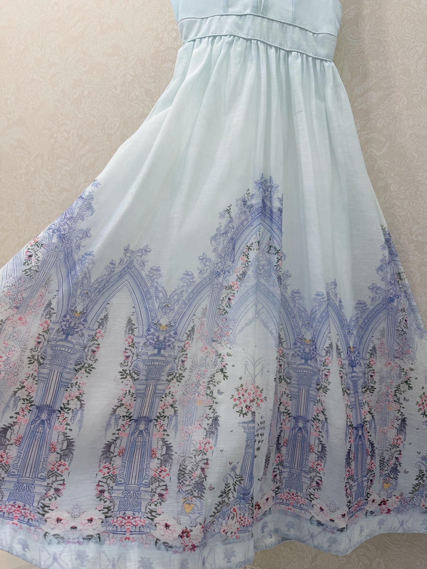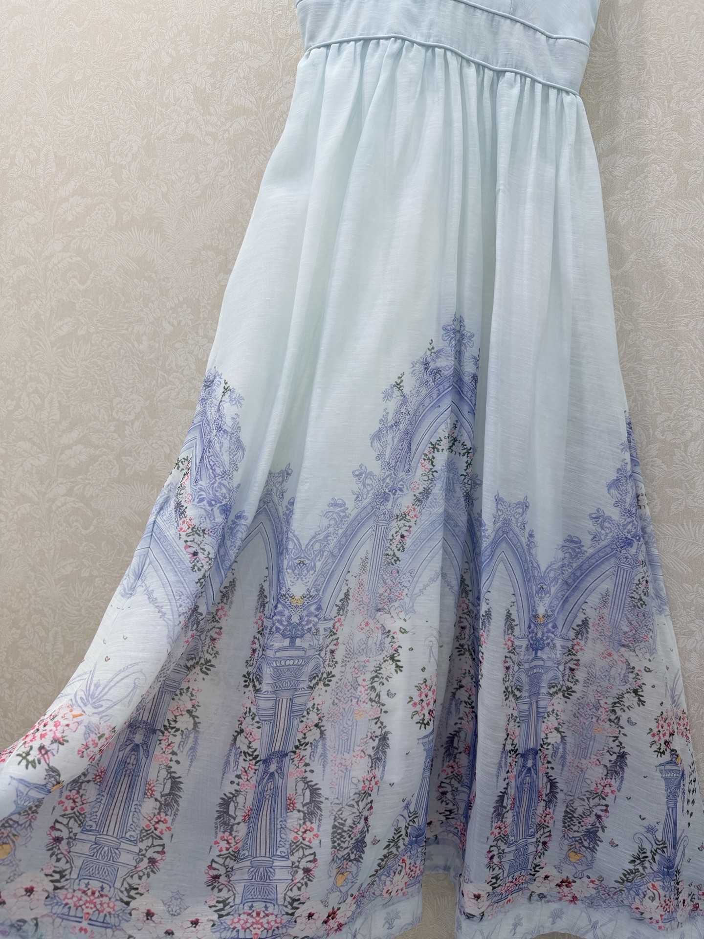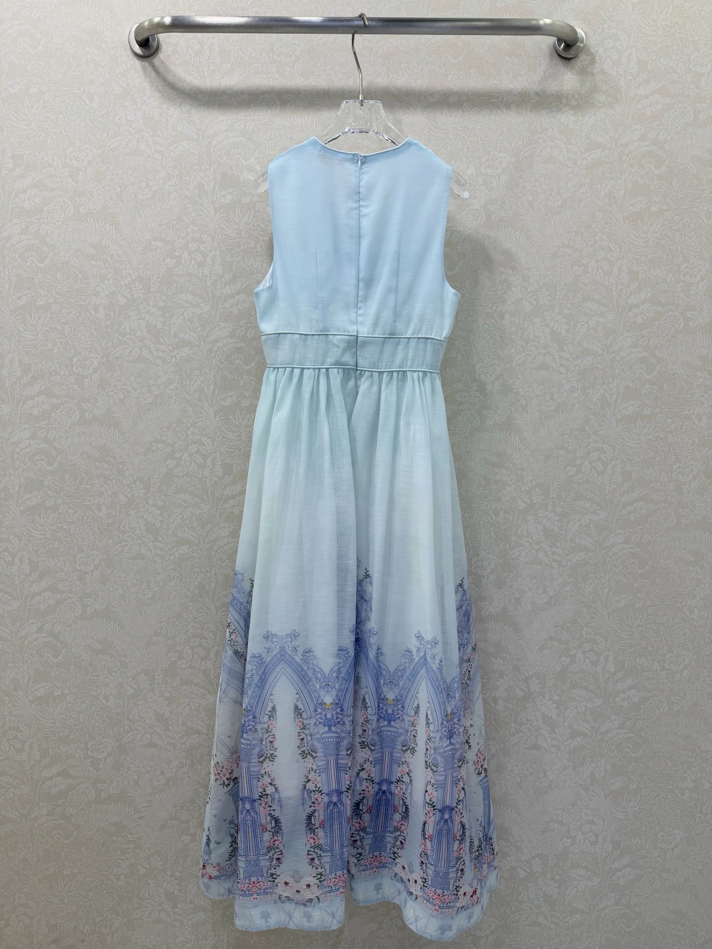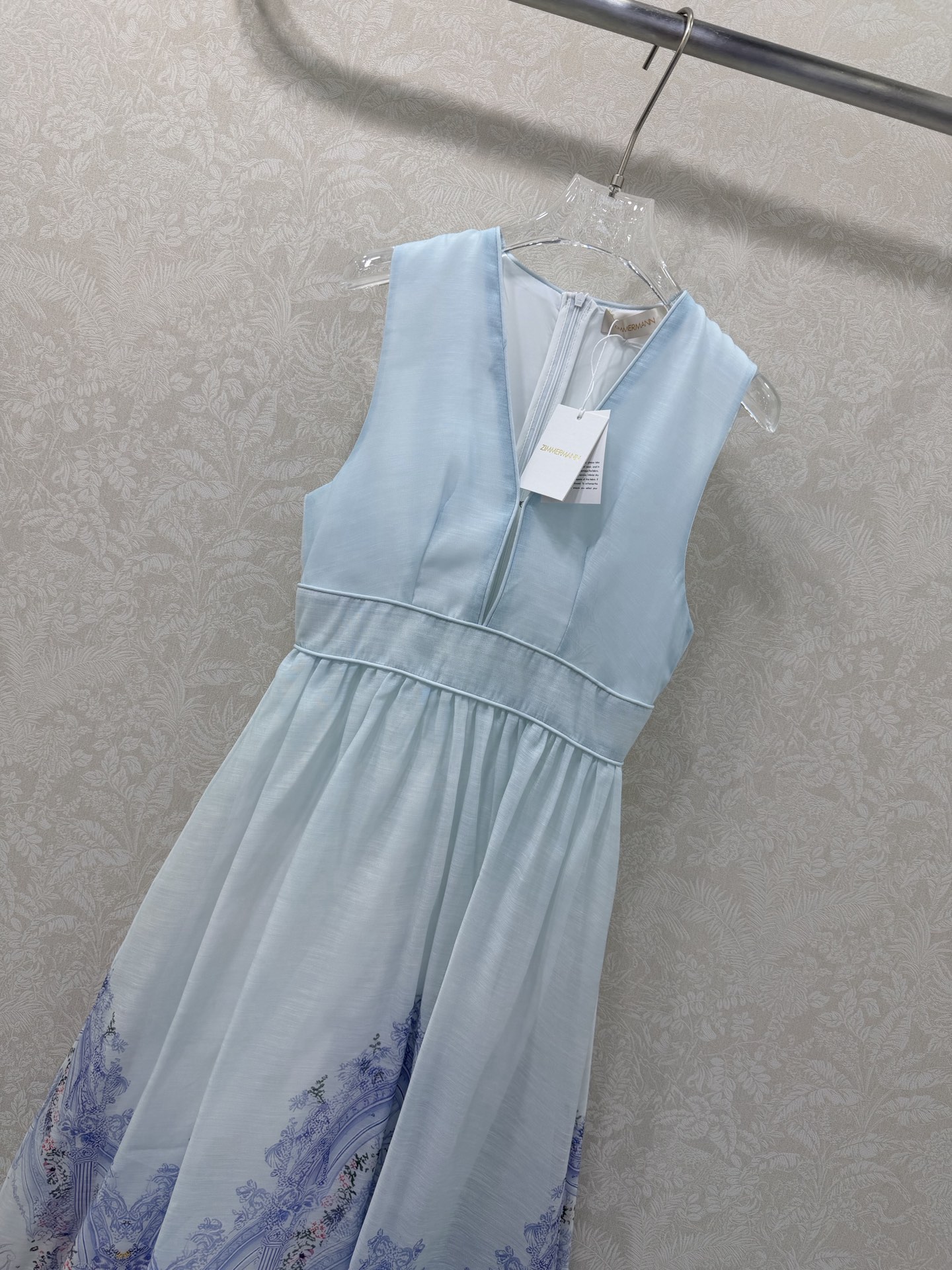 Details: New long dress with blue floral print, V-neck, waist-cinched. High-end customization, fine workmanship