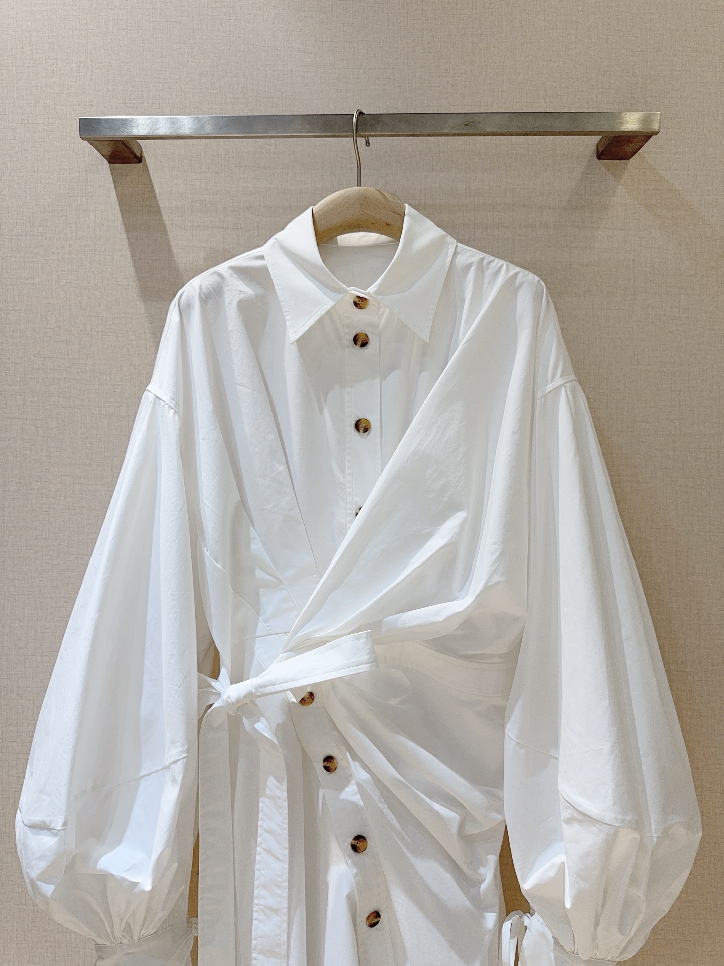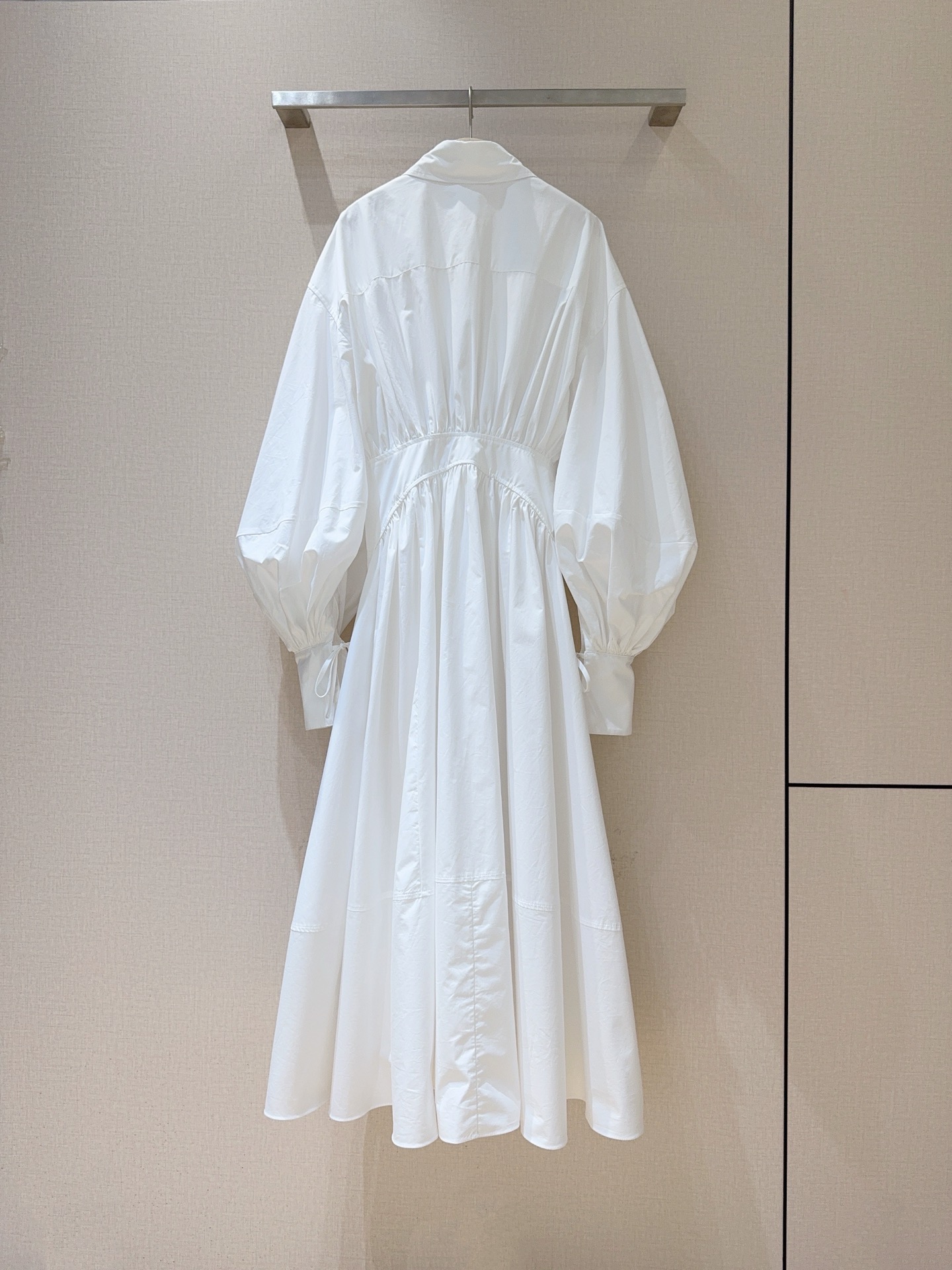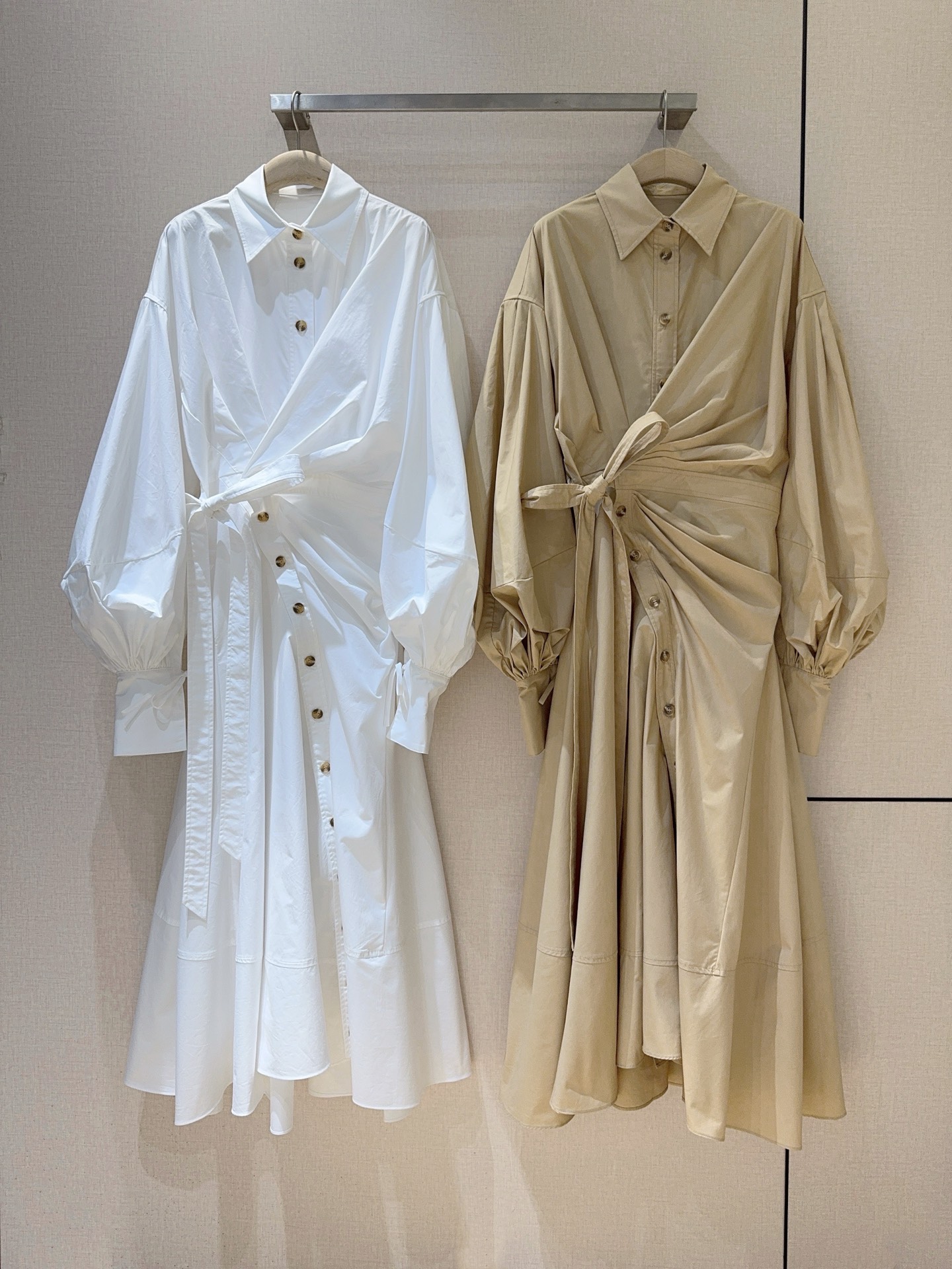 Details: Shirt-dress with shirt collar, single-row buttons, drawstring waist, bubble sleeves and A-line skirt.