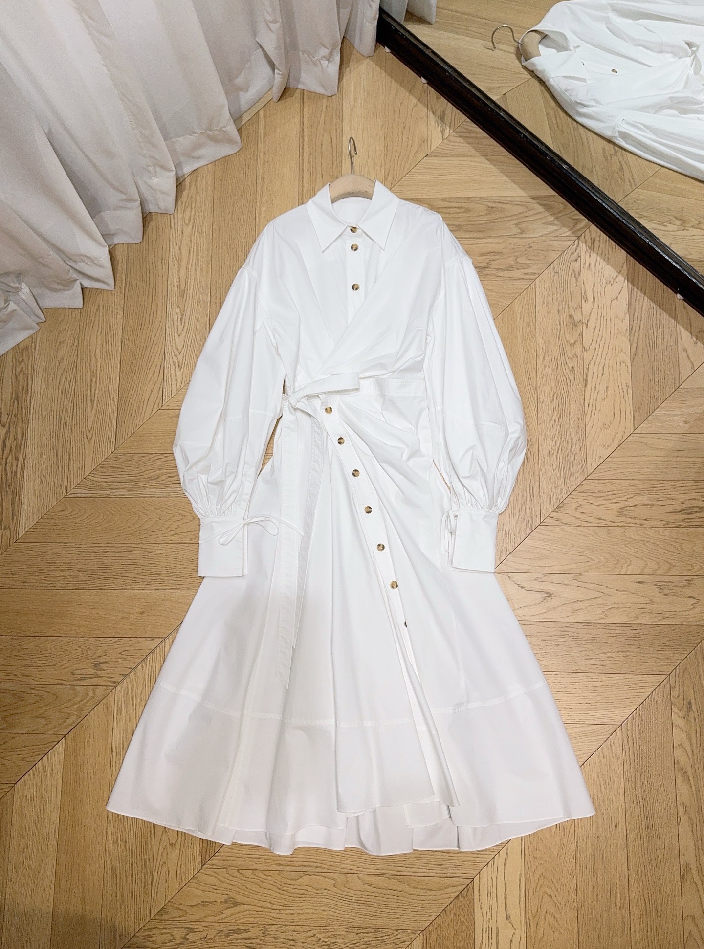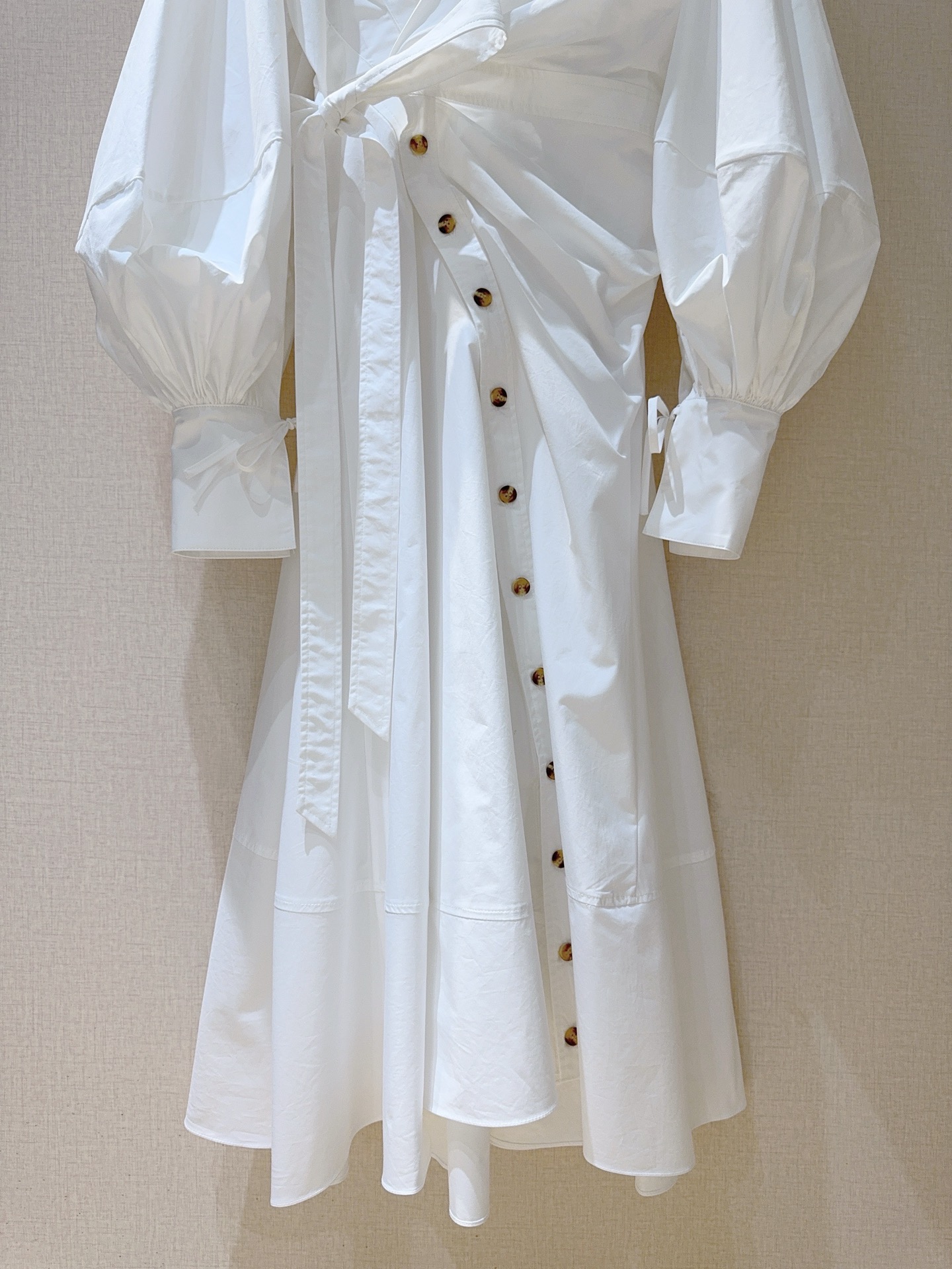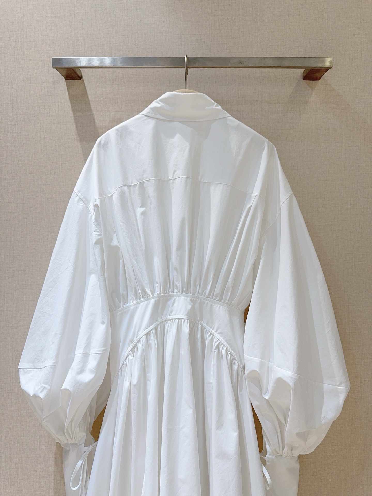 Details: Shirt-dress with shirt collar, single-row buttons, drawstring waist, bubble sleeves and A-line skirt.