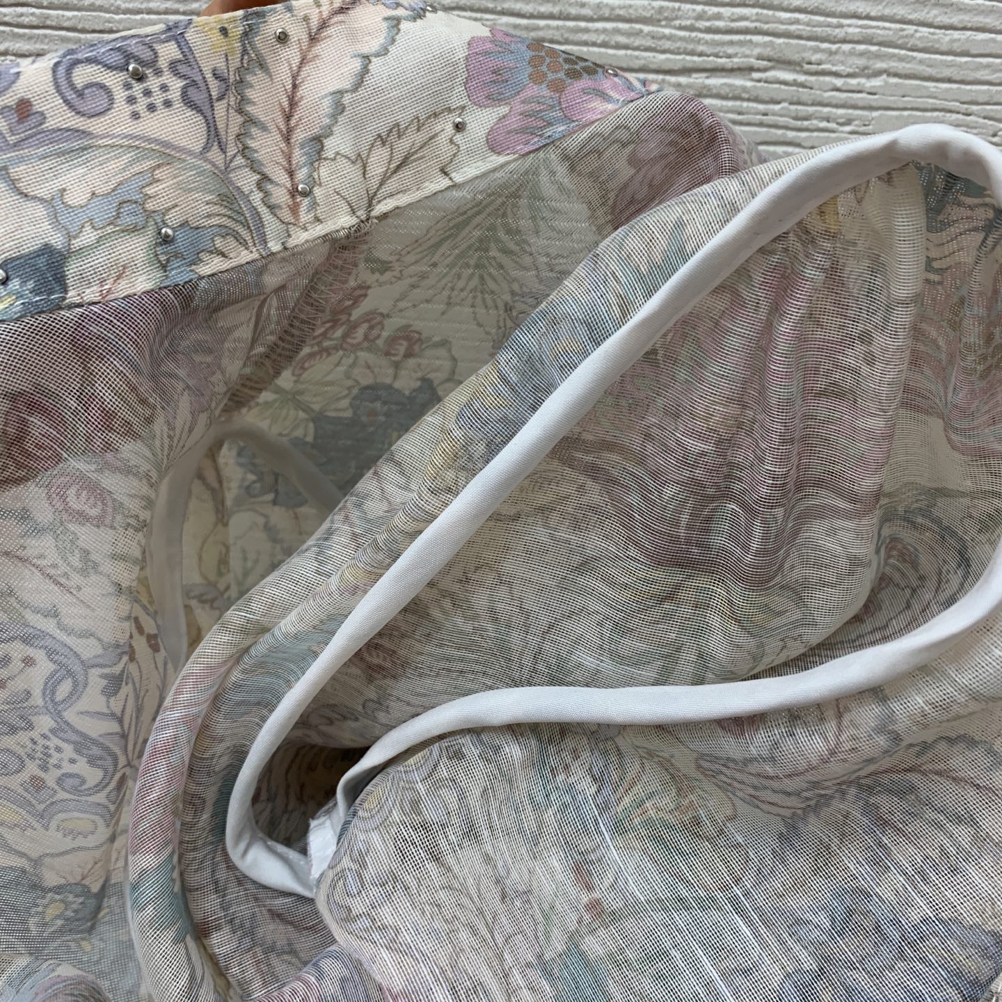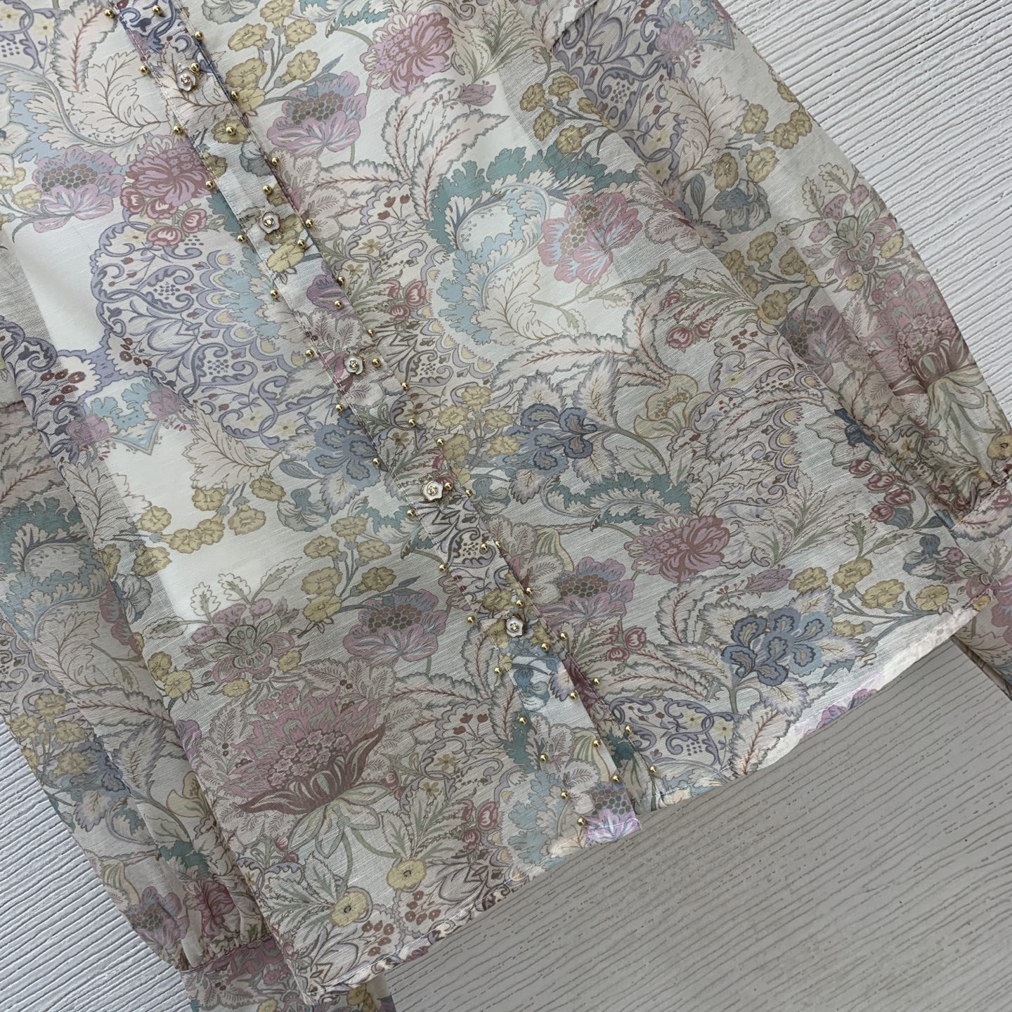 Details: Floral 3 - piece suit with beadwork, collar shirt and ruffled skirt, size M. High - end custom, fine workmanship