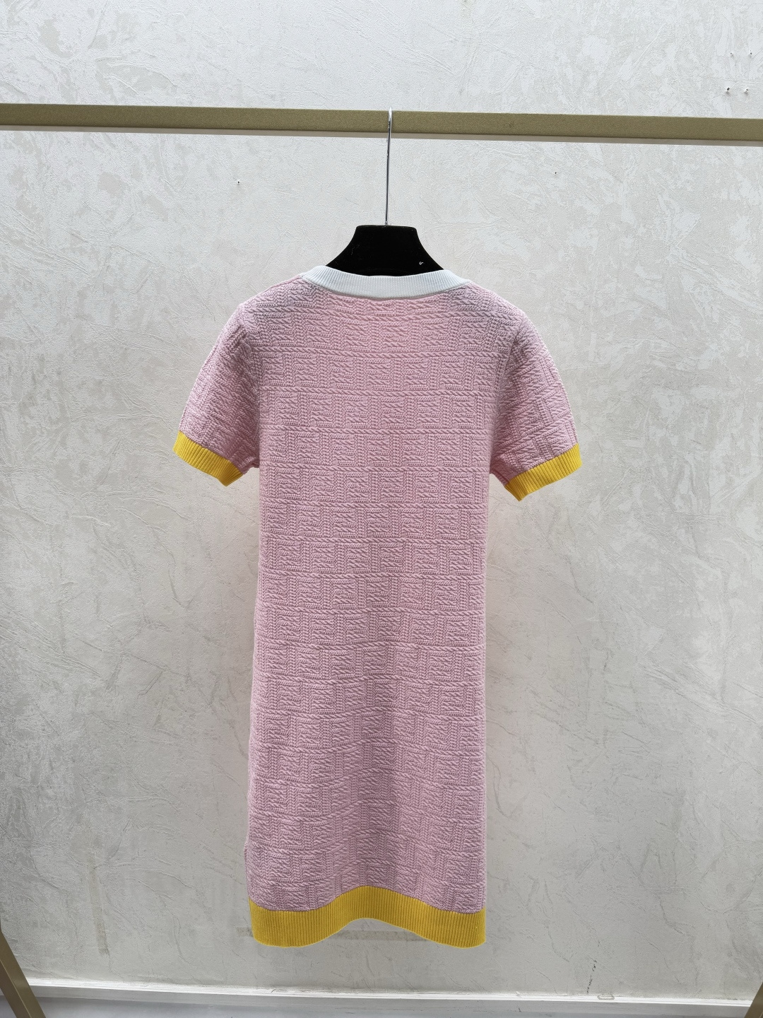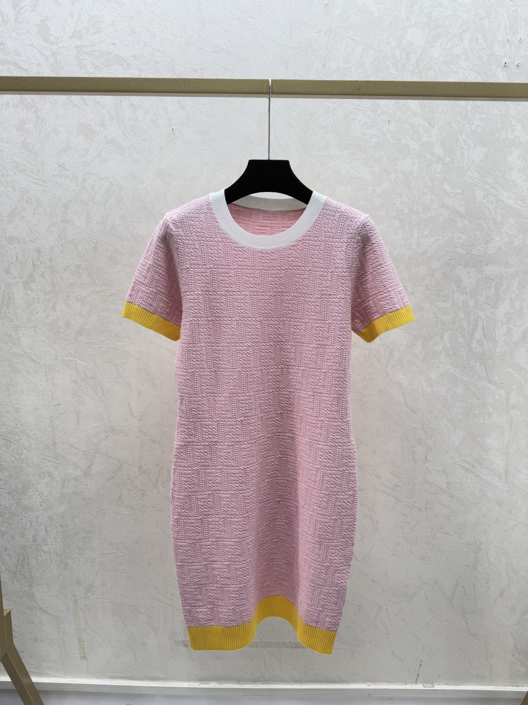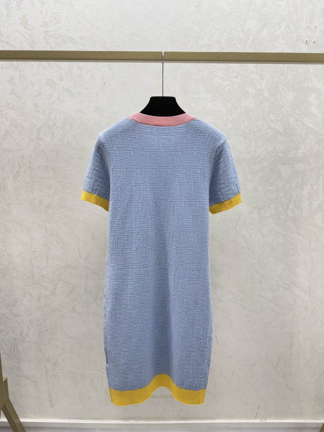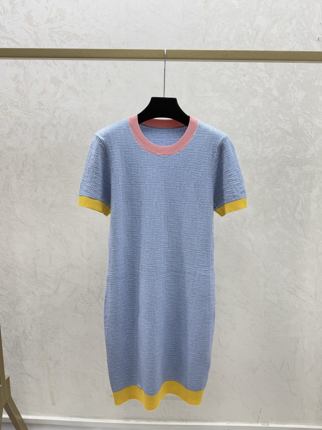 Details: Early spring knitted short-sleeved dress with monogram in pink and blue.