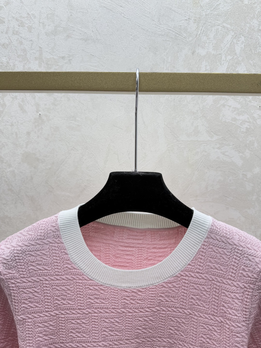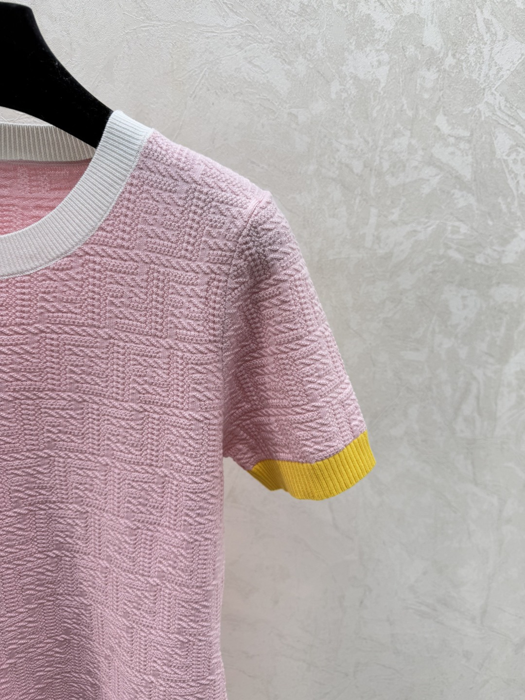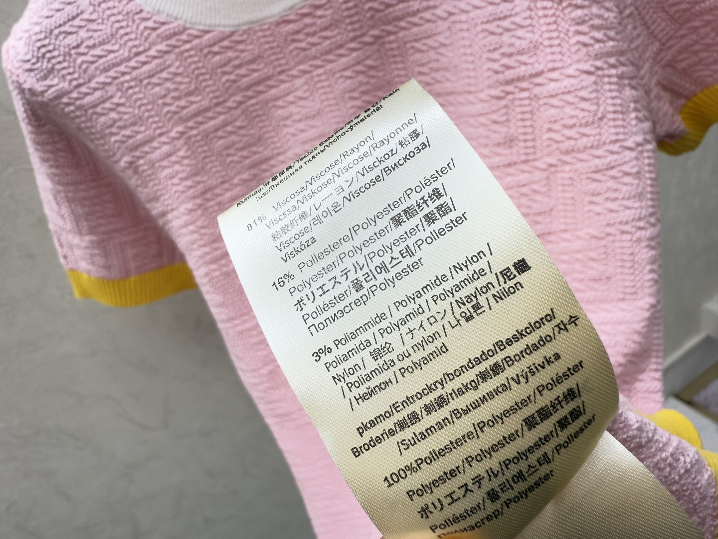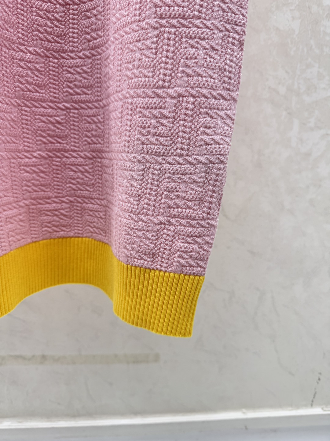 Details: Early spring knitted short-sleeved dress with monogram in pink and blue.