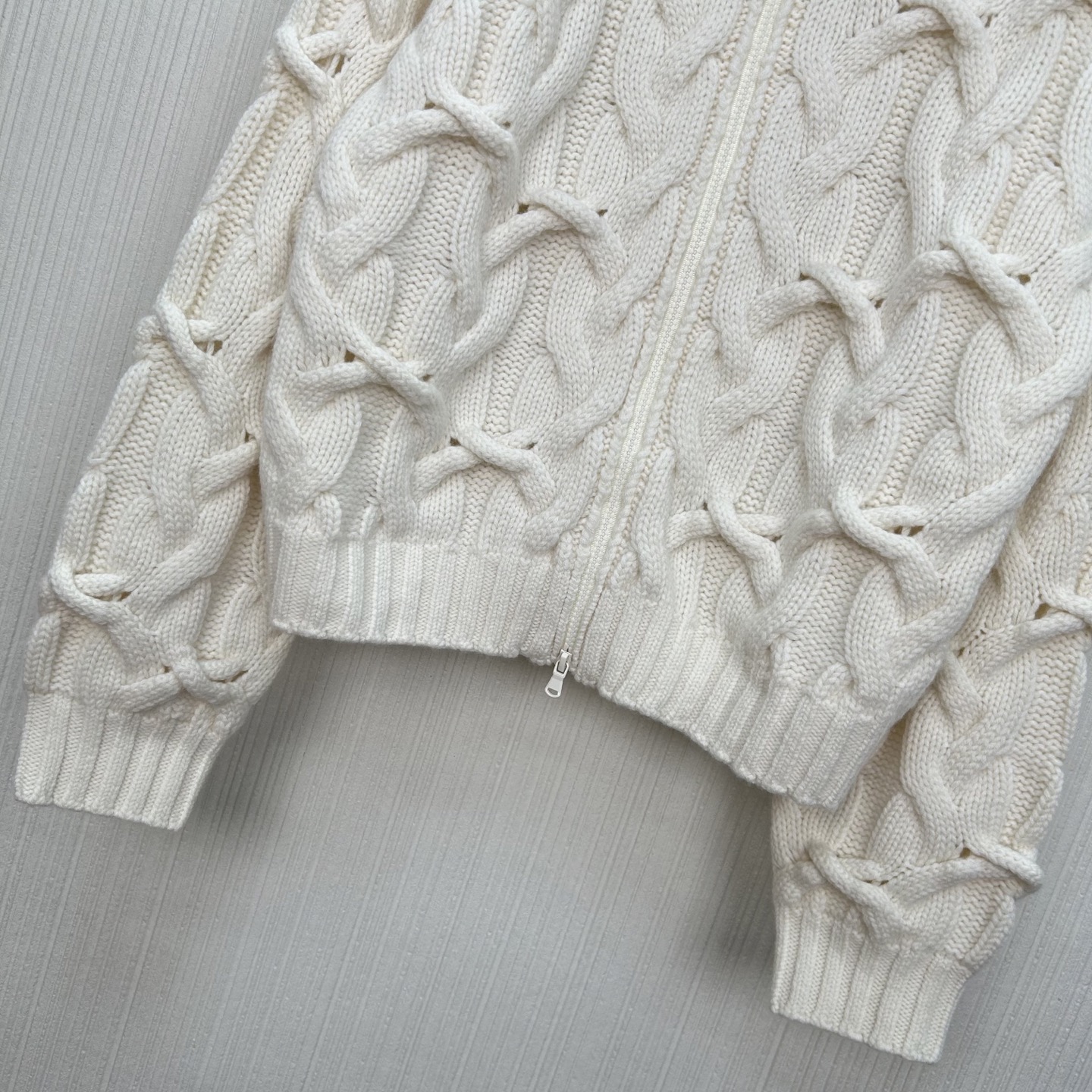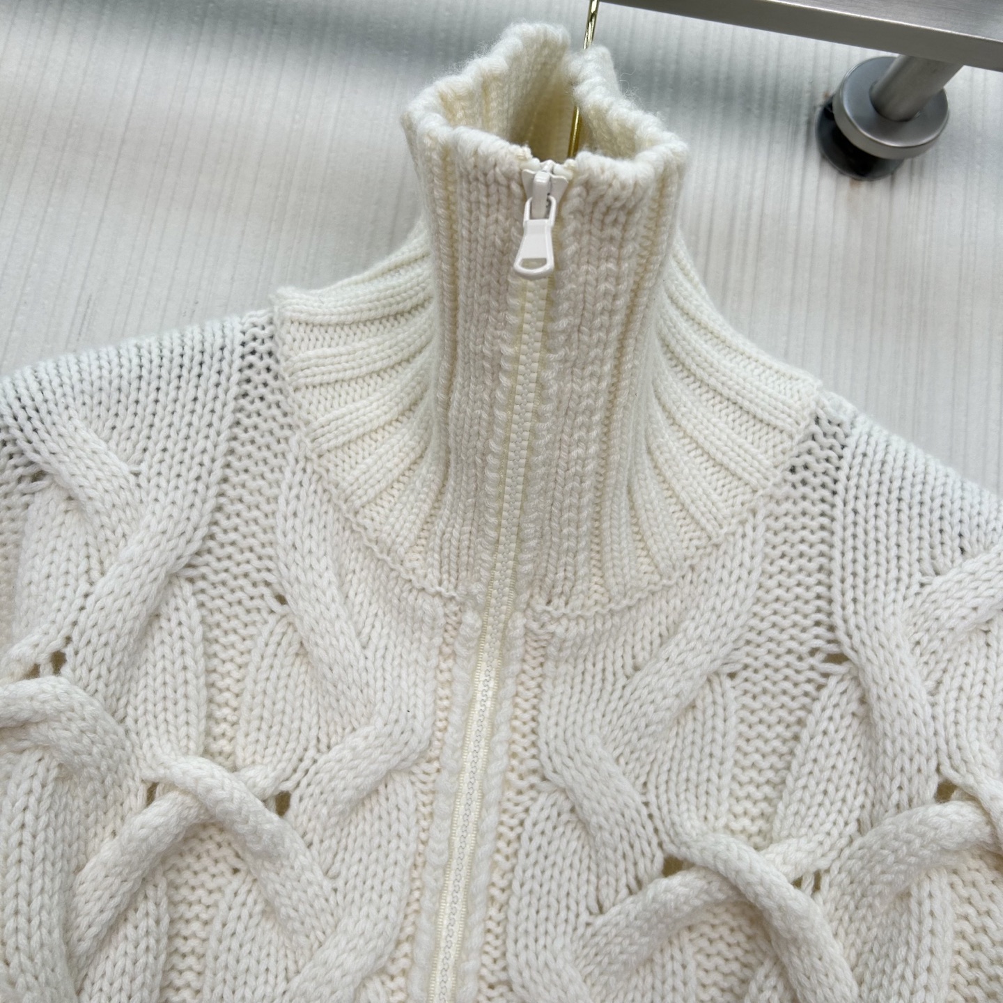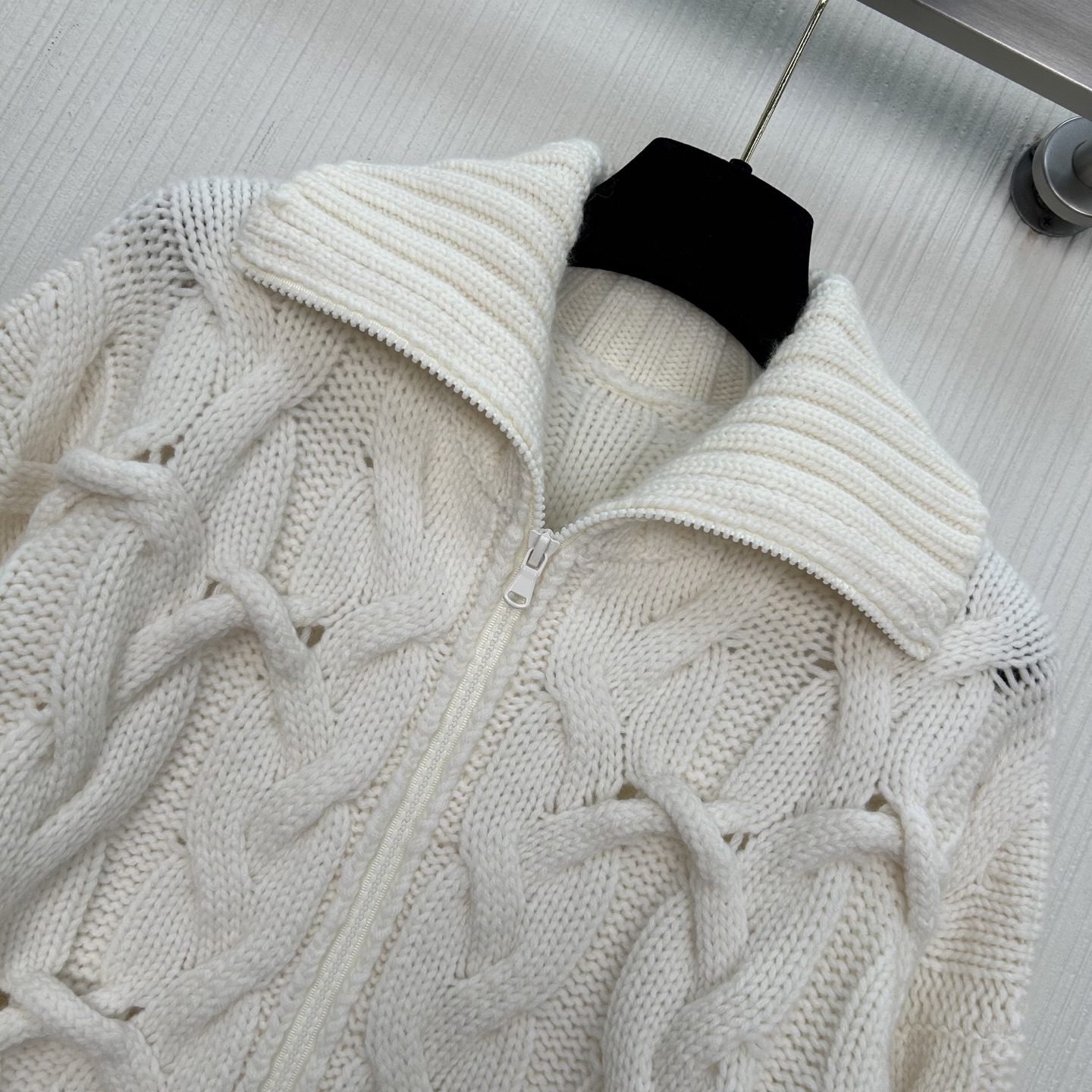Details: High-end hand-knitted cashmere coat with double zippers, creating a low-key luxury look.