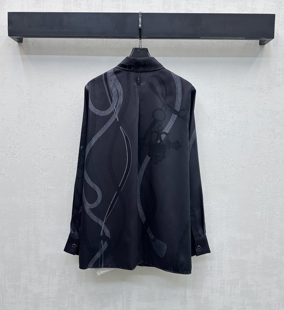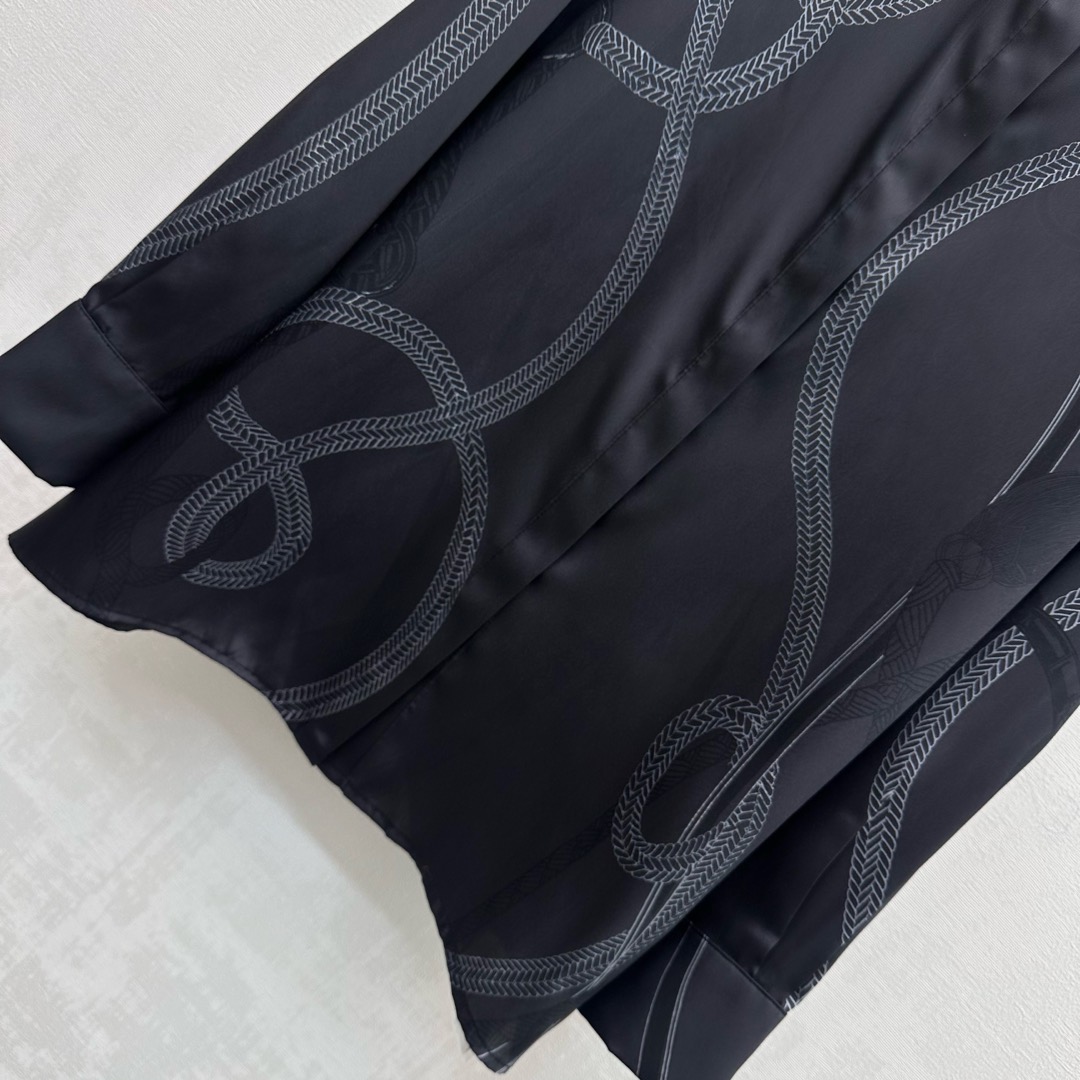 Details: New arrival silk printed long-sleeve shirt, 100% silk, black base with artistic line prints, hidden button placket, loose fit, high-end customization, exquisite workmanship