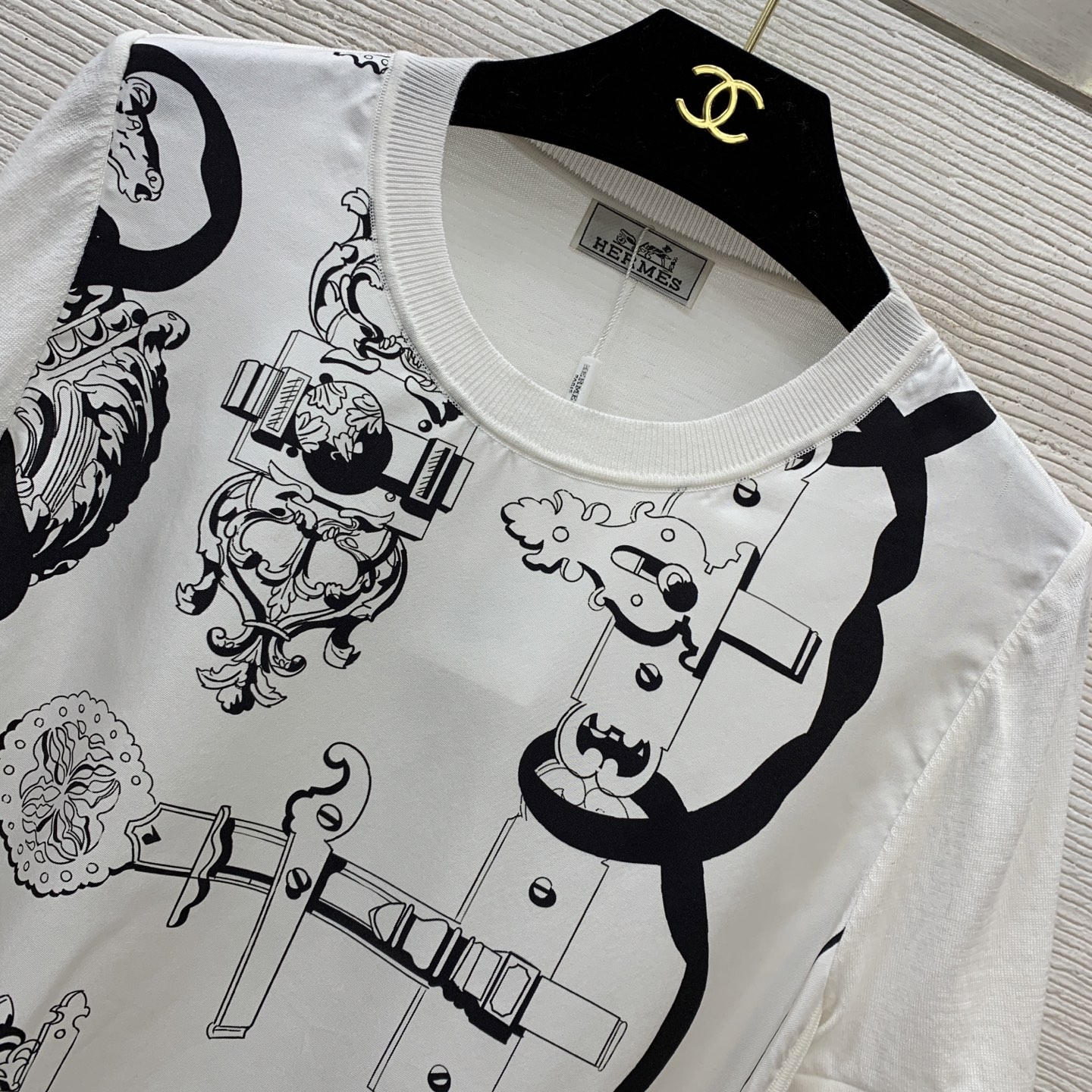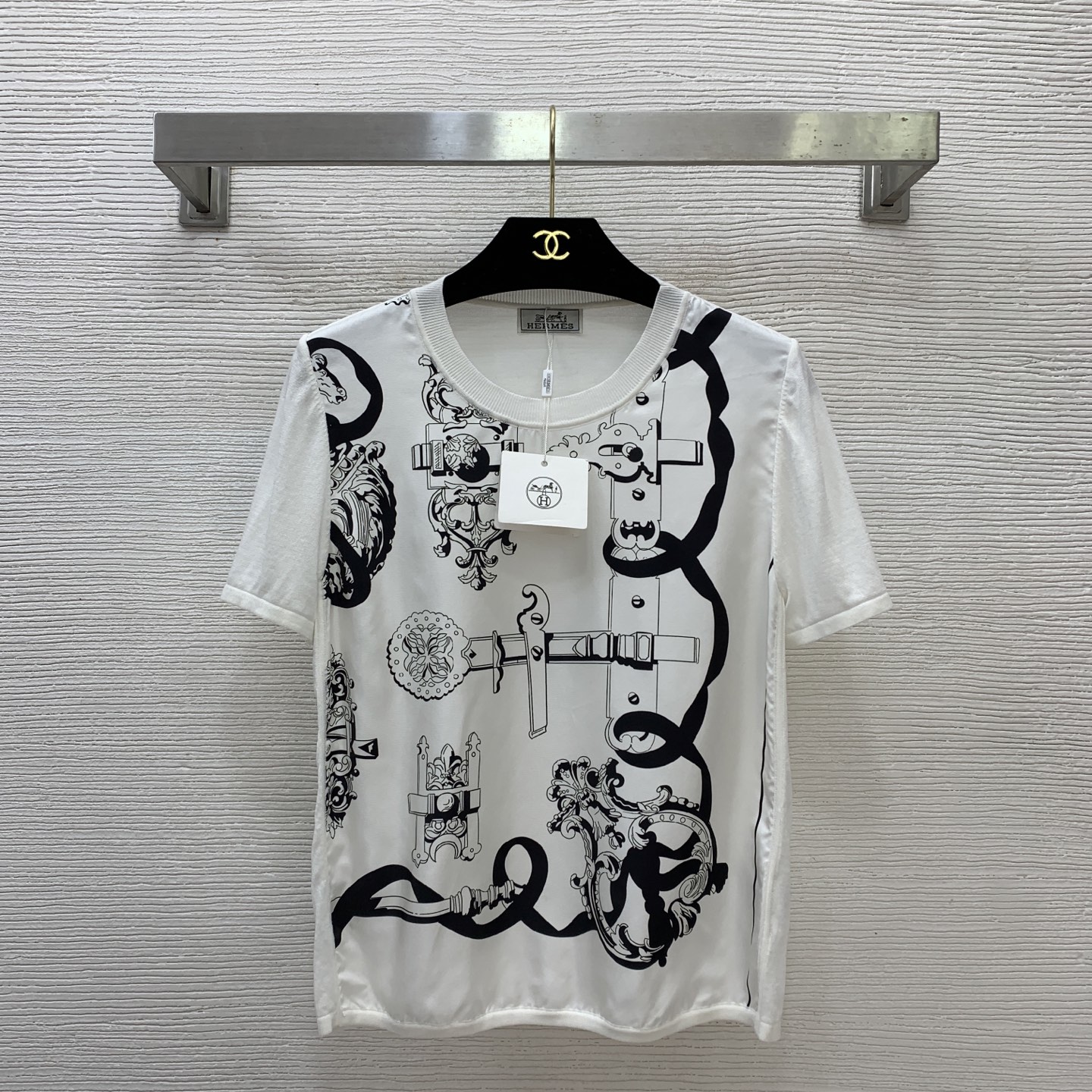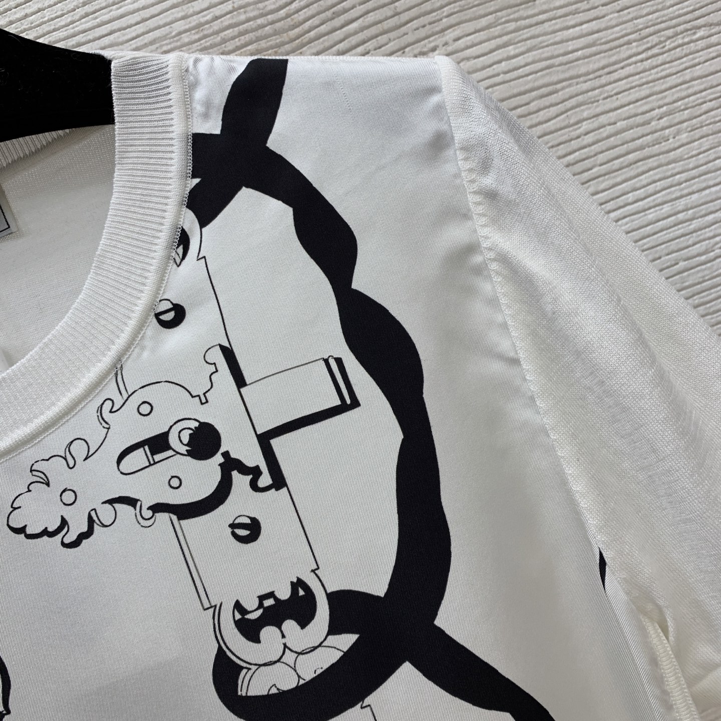 Details: New high-end custom silk and cotton blend knitted top with retro print, available in black and white, S size. High-quality craftsmanship.