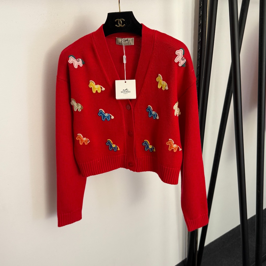 here:home > WOMENS > Hermes > Outerwear Hermes (W) > Hermes Colorful Pony Embroidery V-Neck Wool Knit Cardigan in 3 Colors