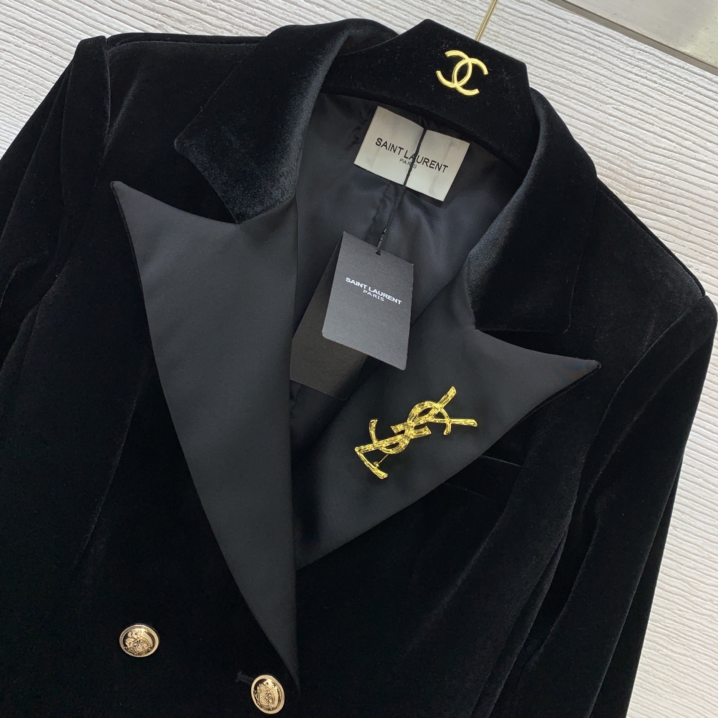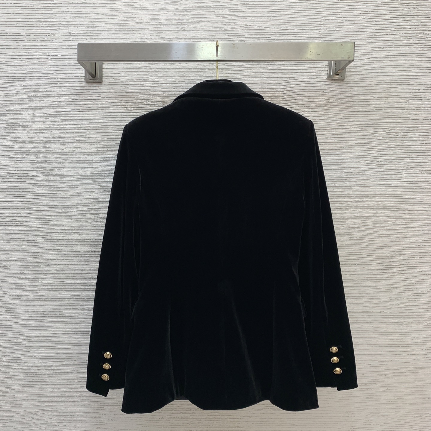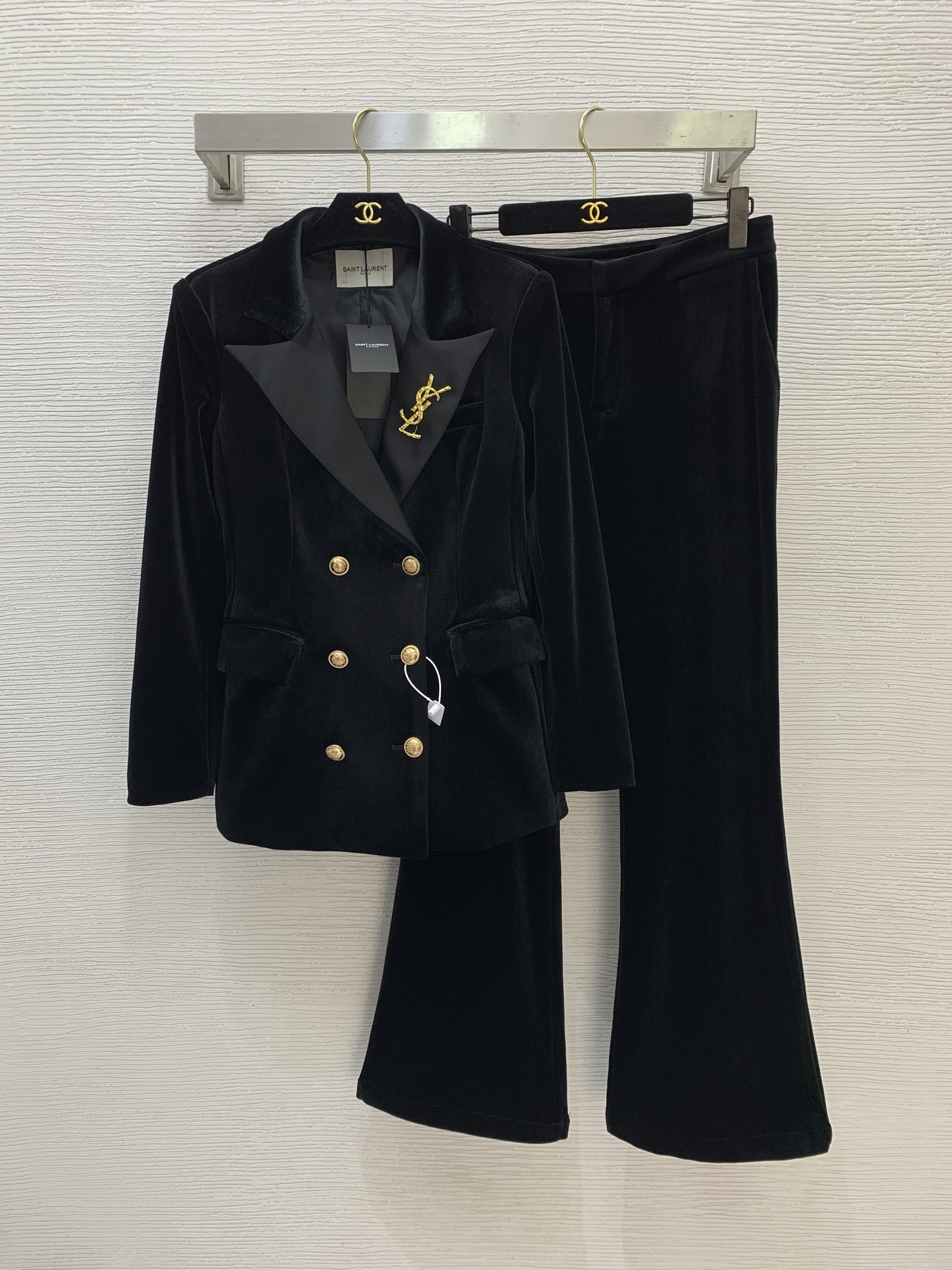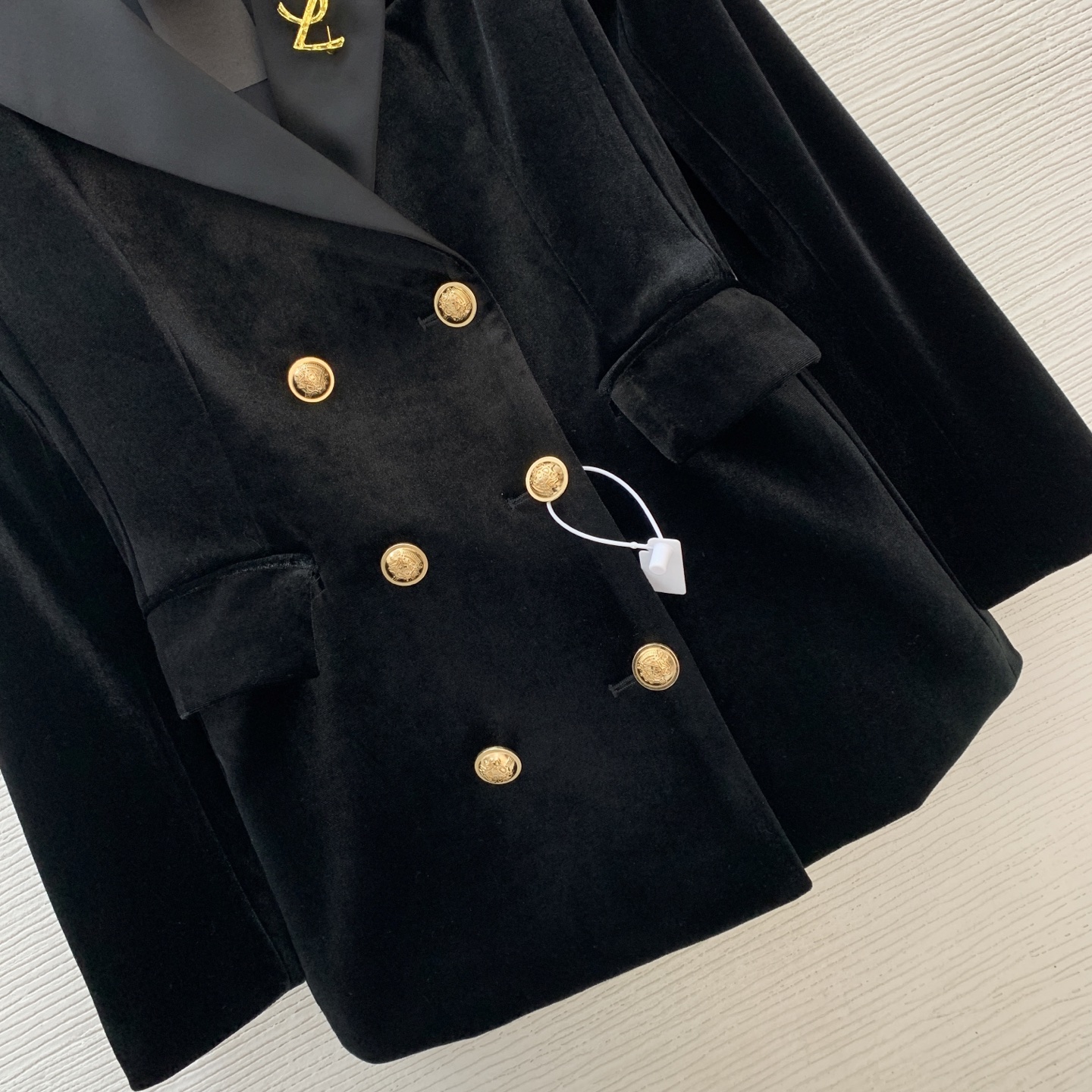 Details: New velvet two - piece suit in black, size M. Gold double - breasted design and slim fit.