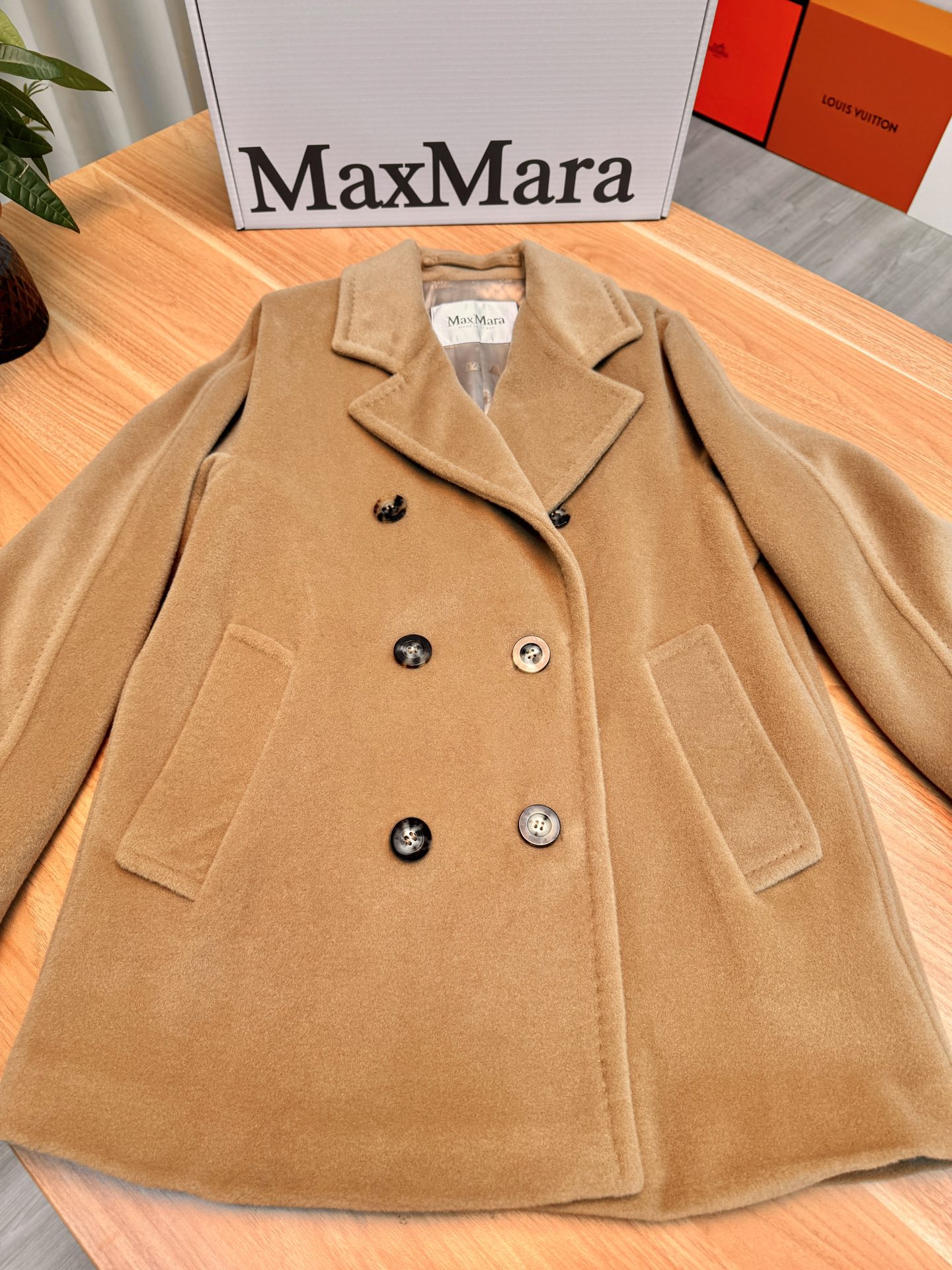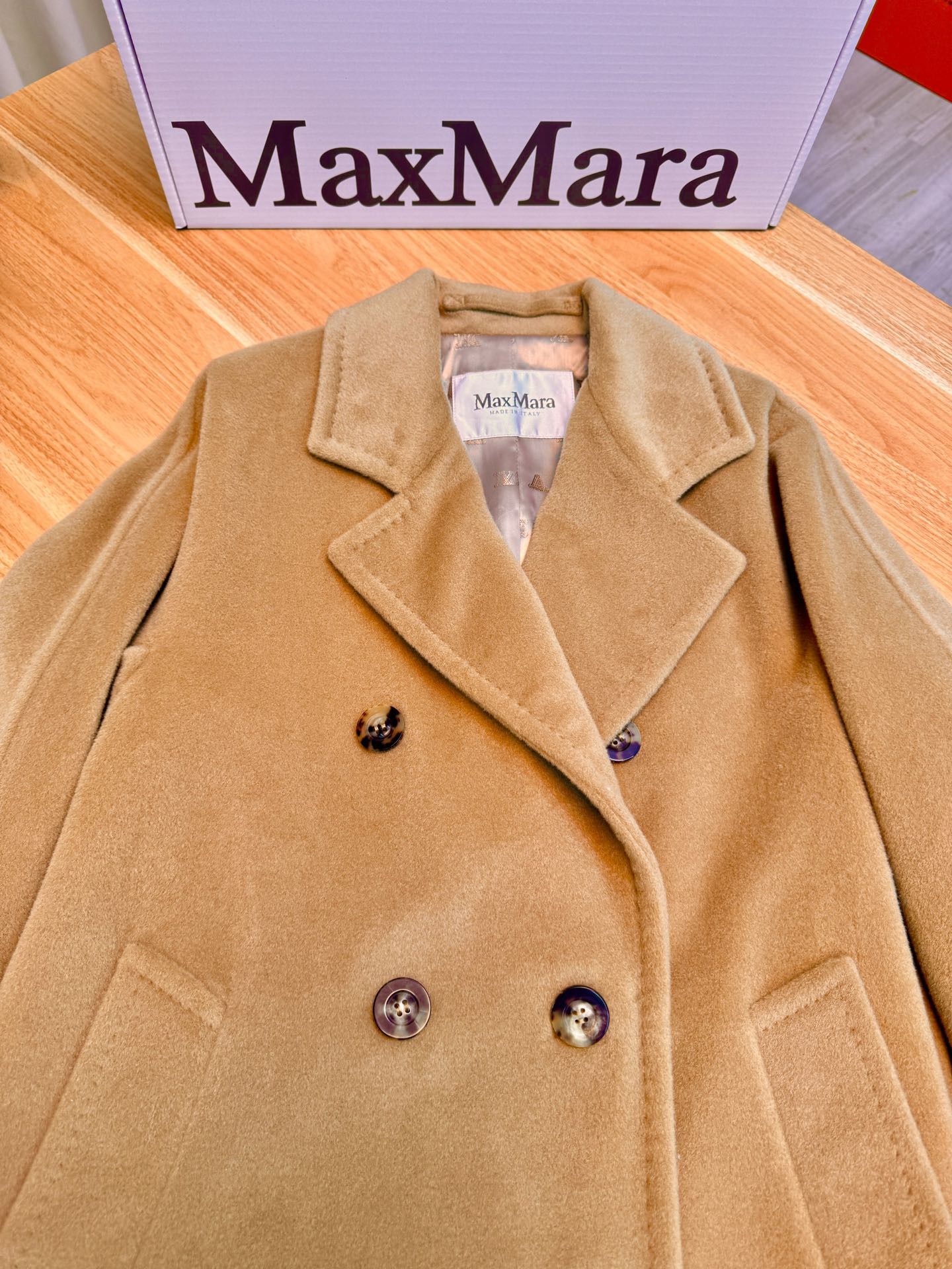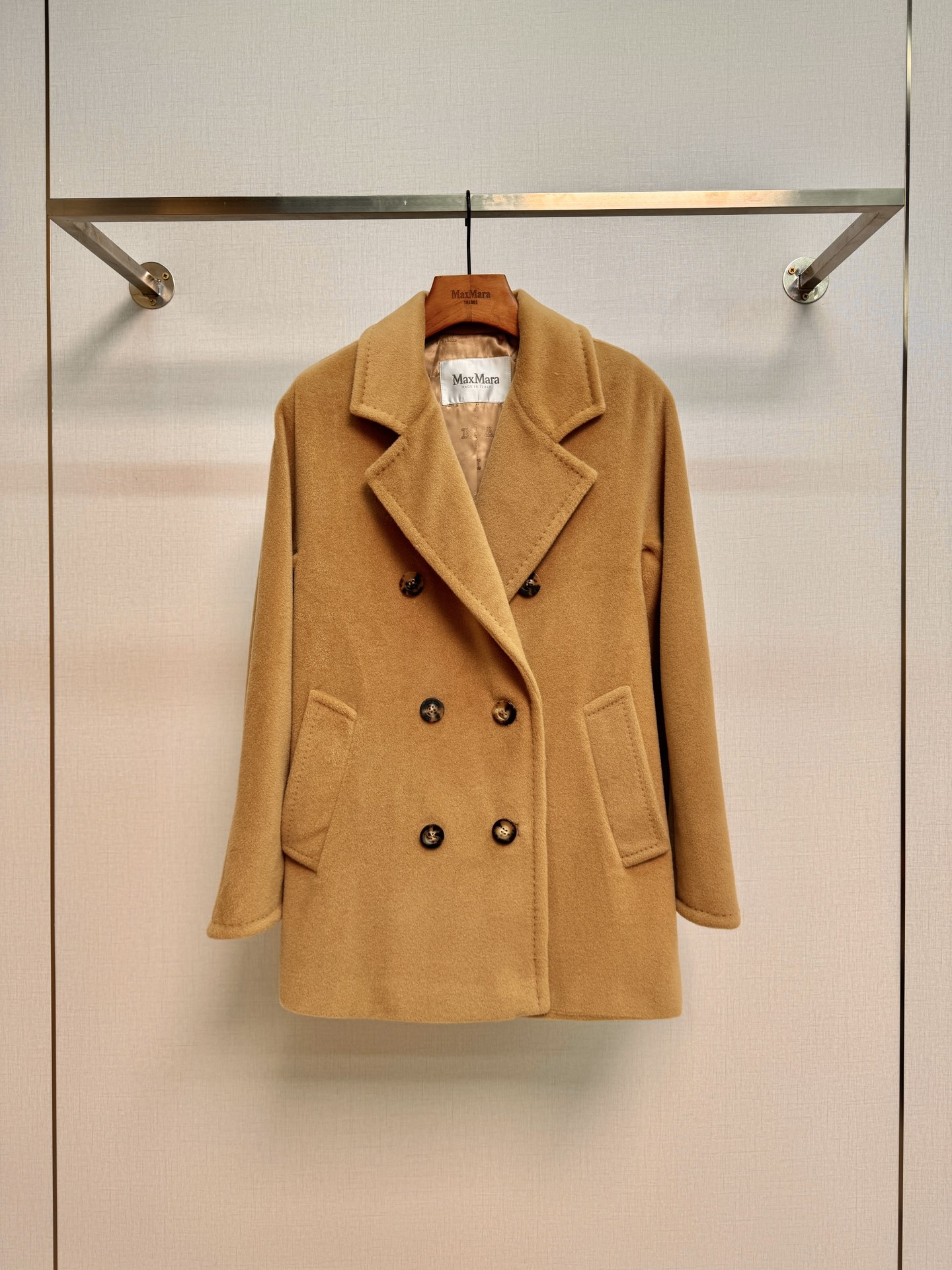 Details: Classic short camel coat, sizes 36 and 40, with hanger, tote bag and dust bag, 10% cashmere and 90% wool.