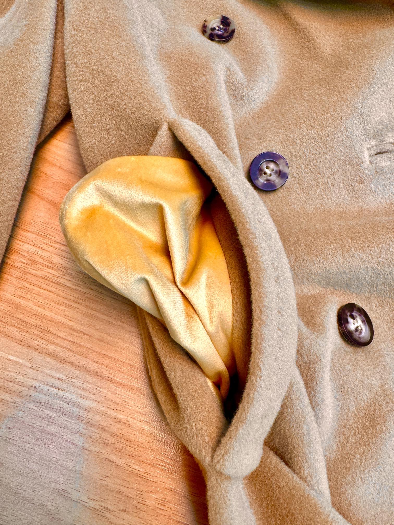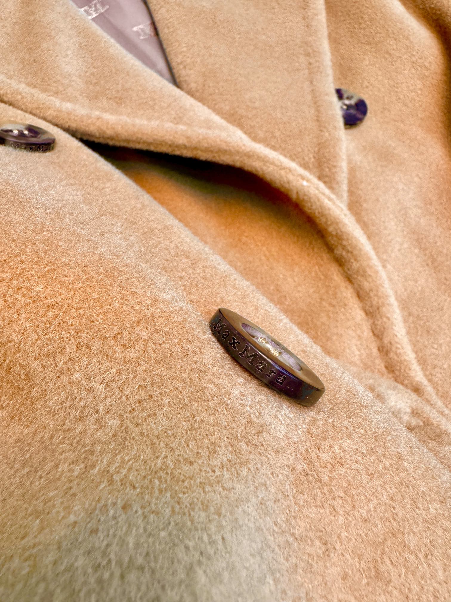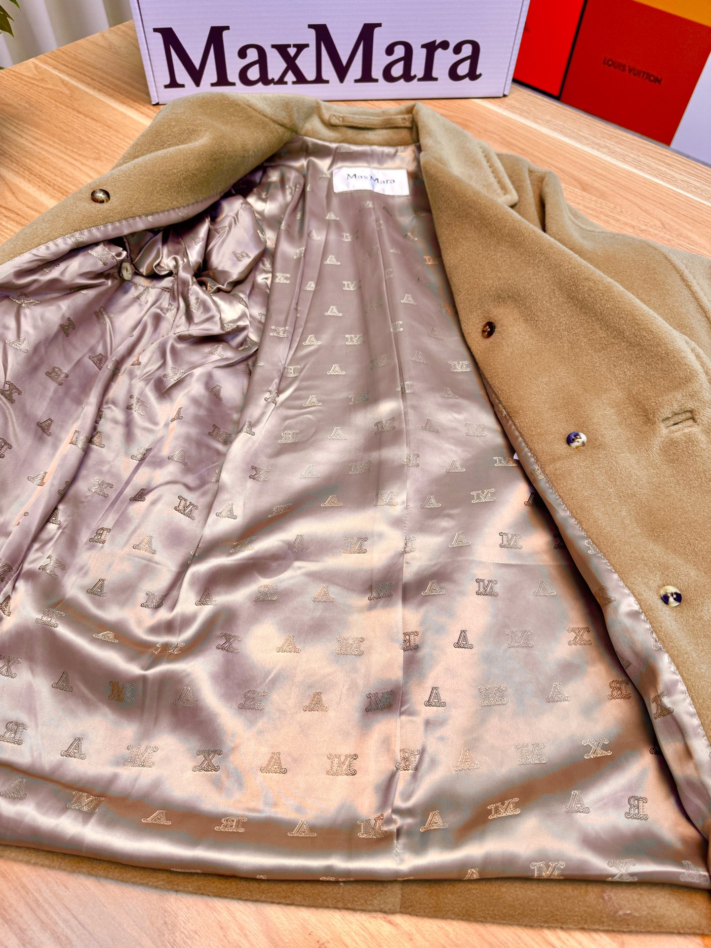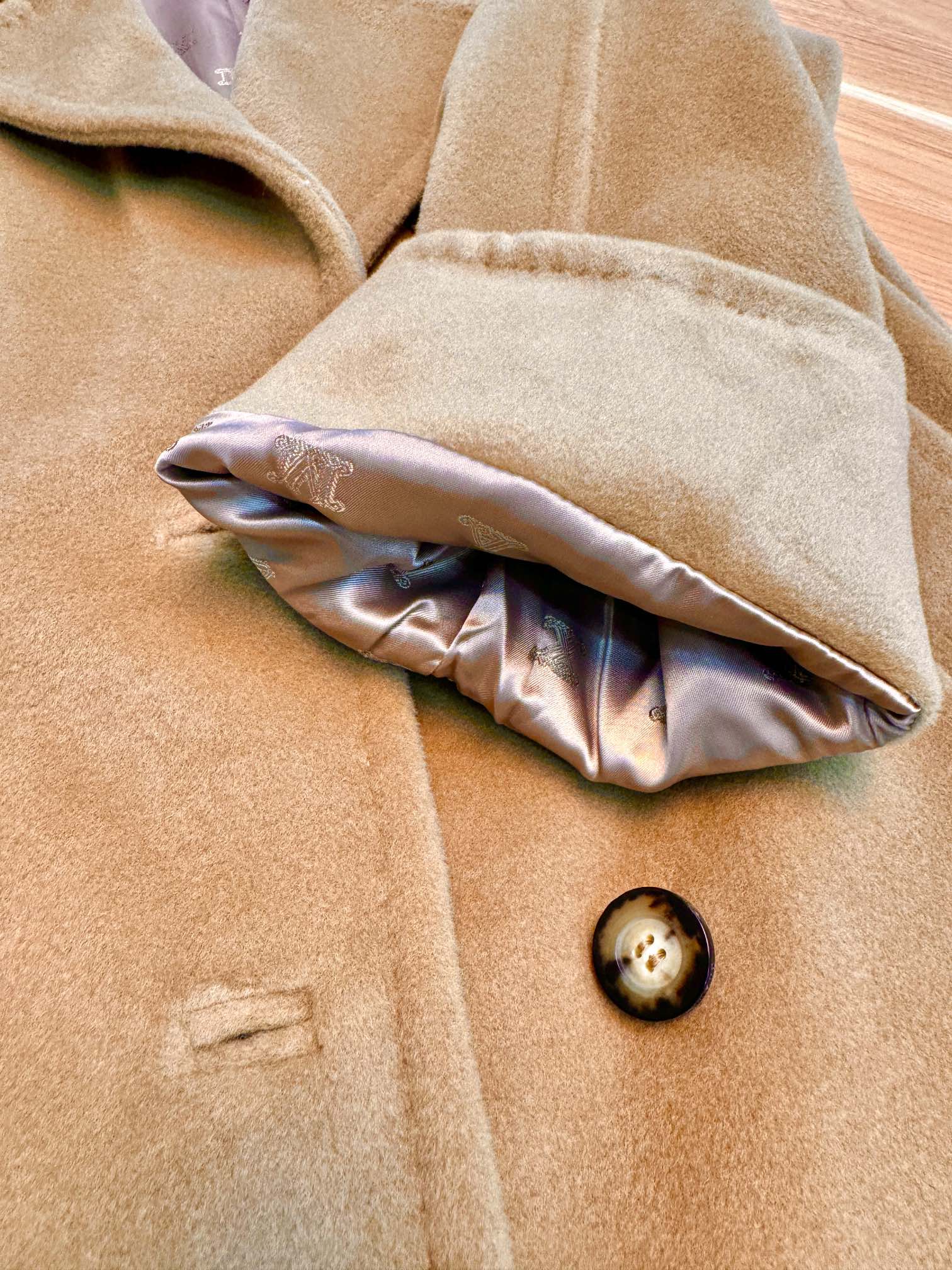 Details: Classic short camel coat, sizes 36 and 40, with hanger, tote bag and dust bag, 10% cashmere and 90% wool.