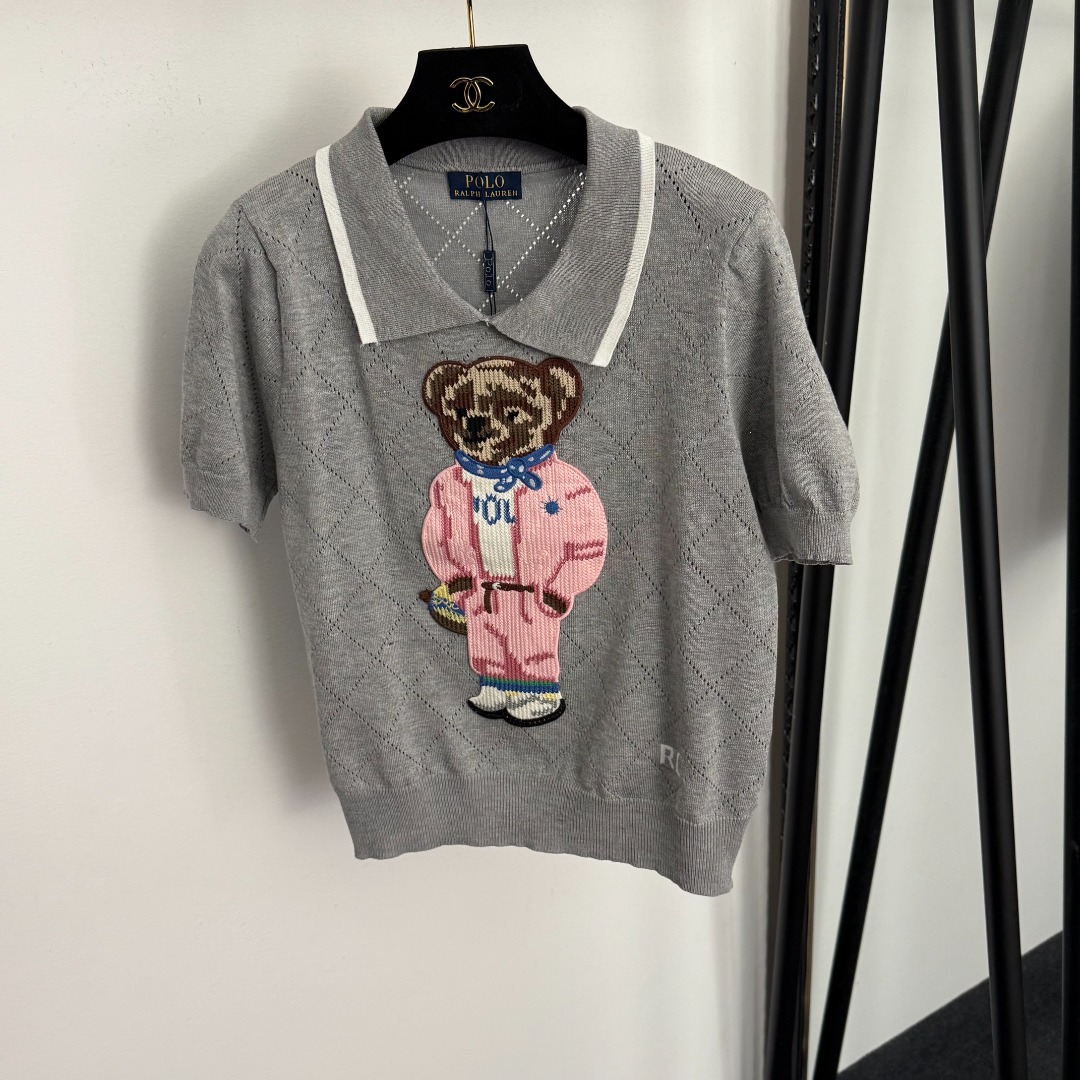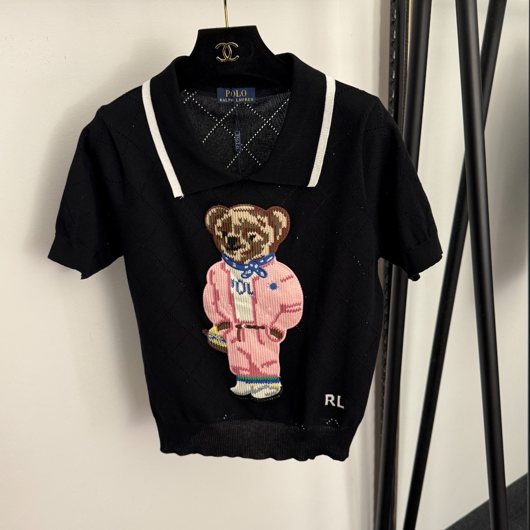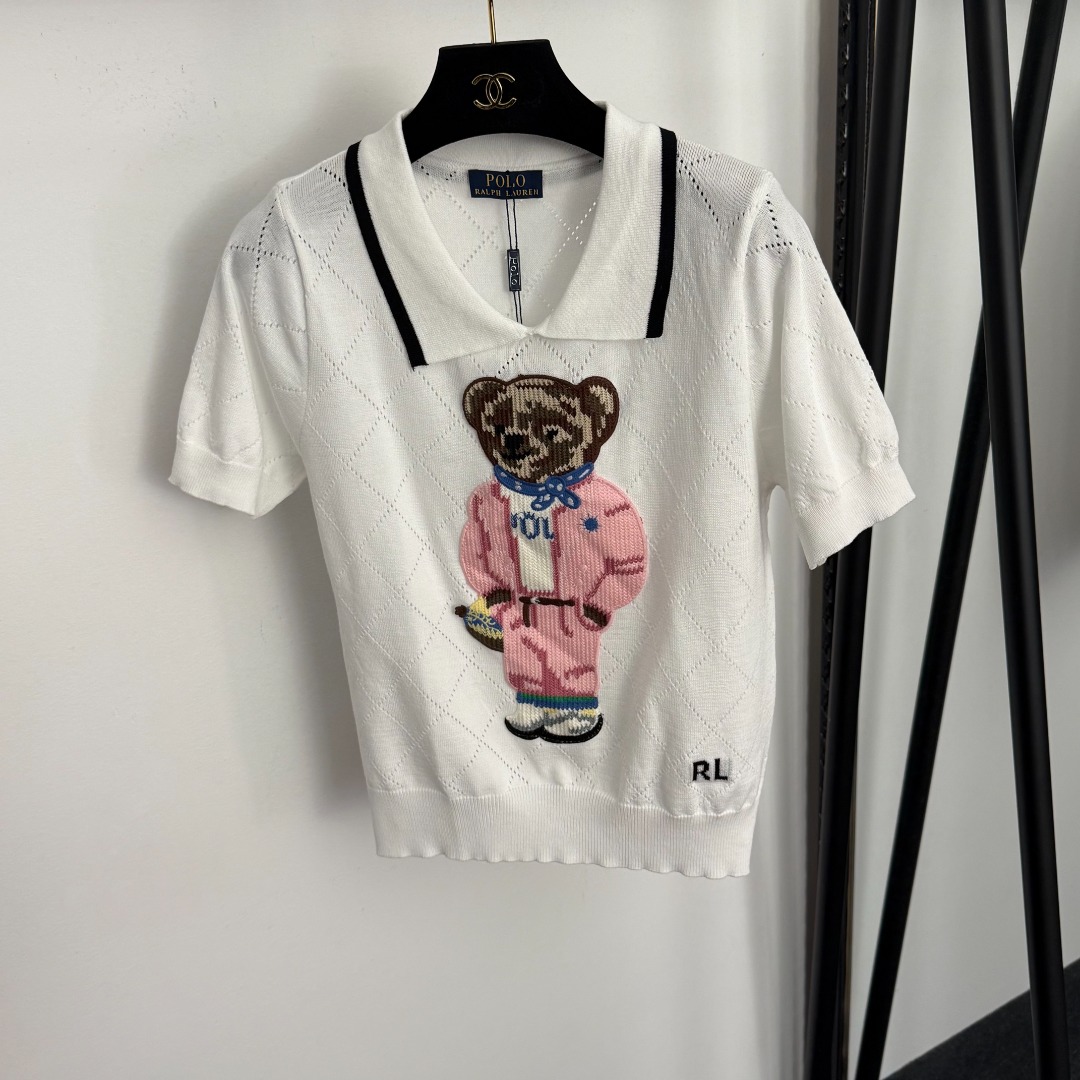 Details: Bear embroidered jacquard turn-down collar short-sleeved knit top in white, pink, navy, black & grey, one size