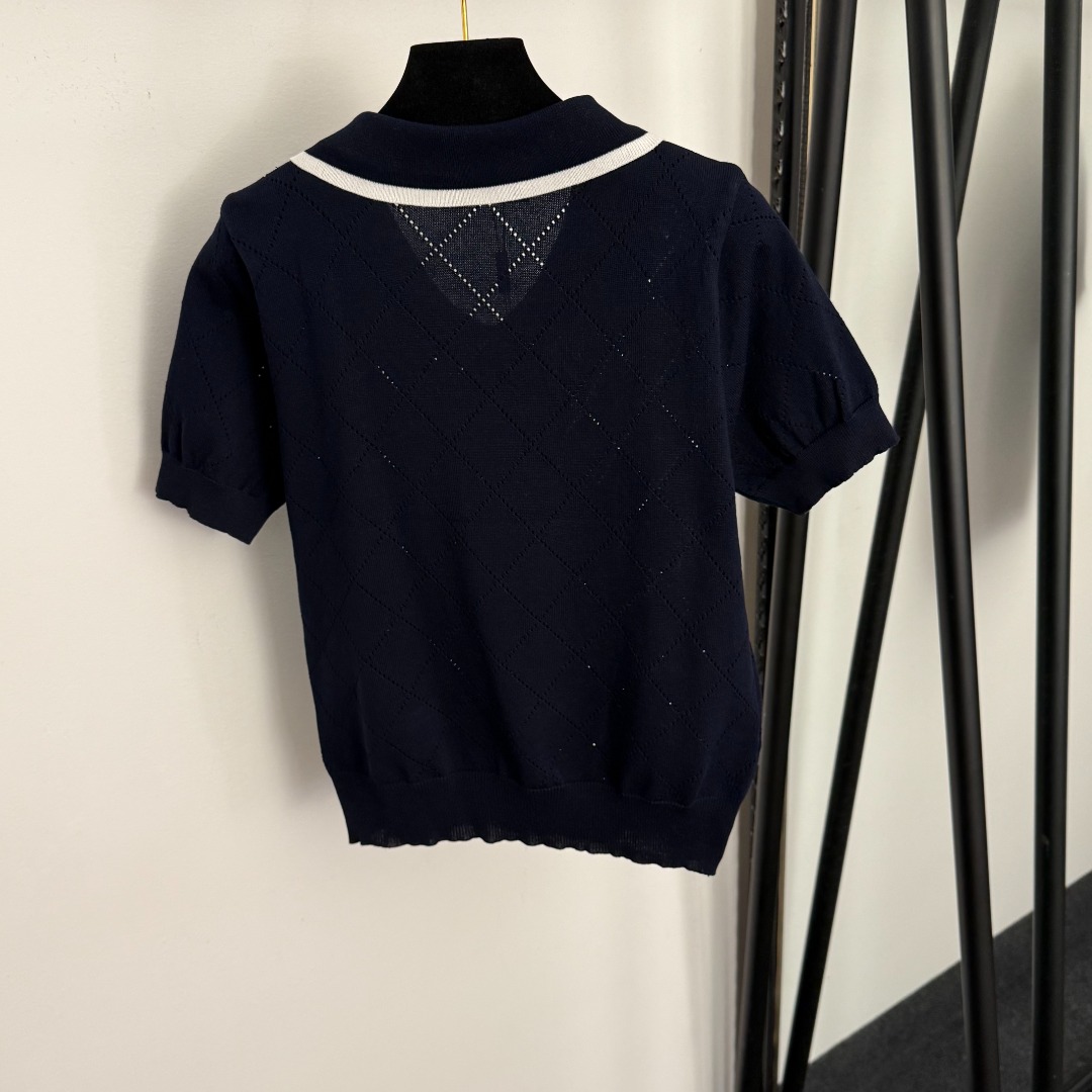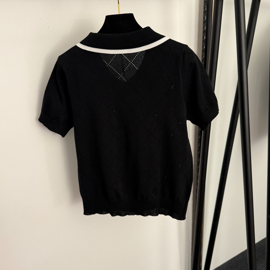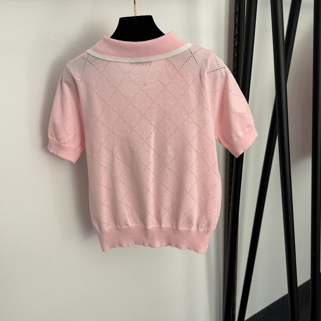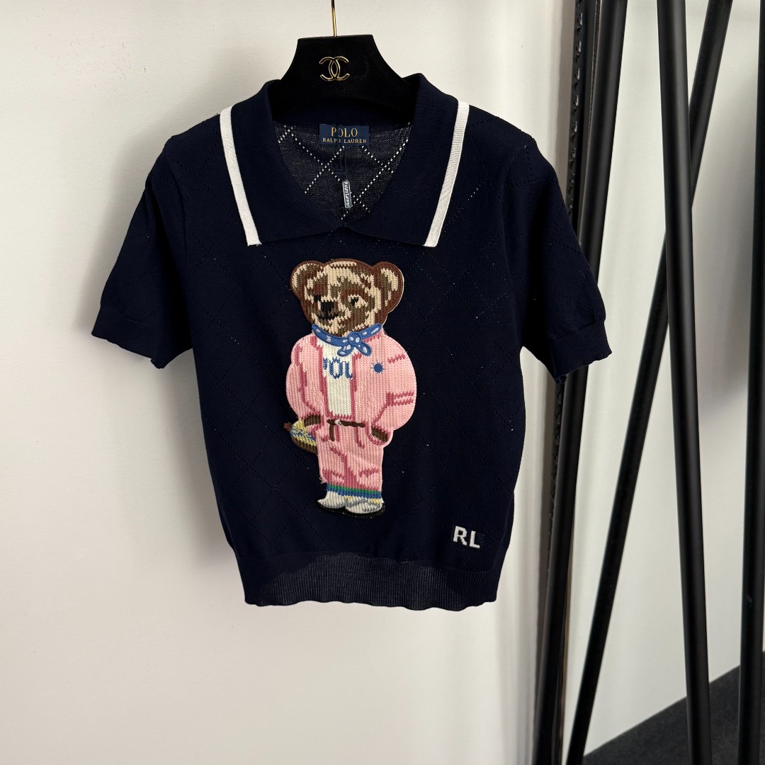 Details: Bear embroidered jacquard turn-down collar short-sleeved knit top in white, pink, navy, black & grey, one size