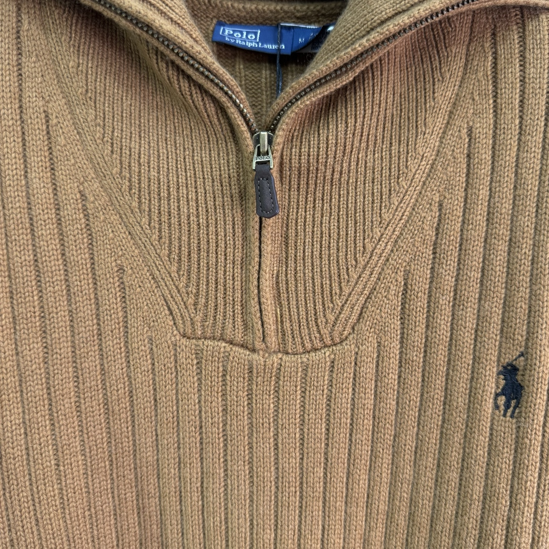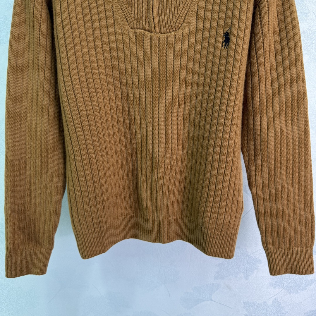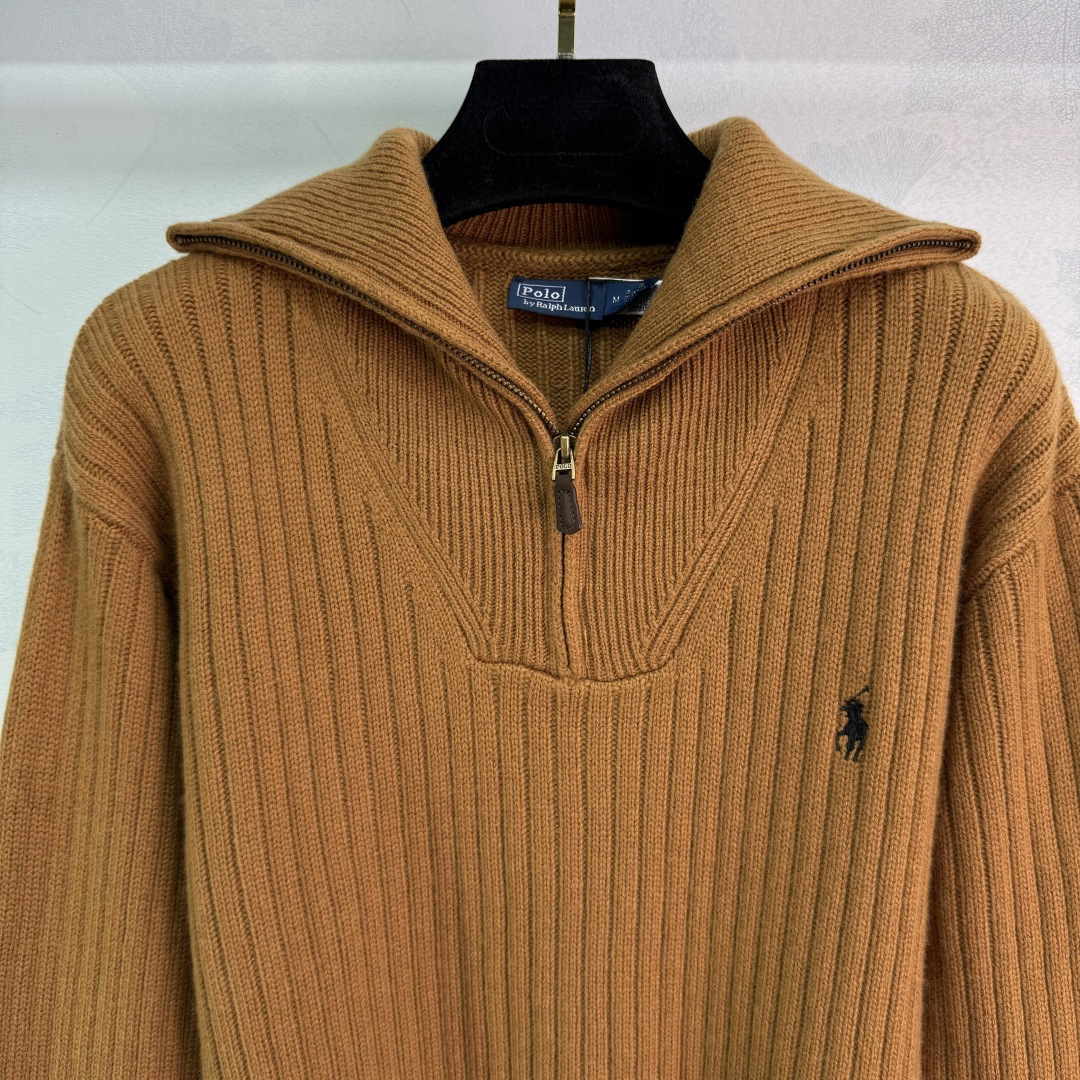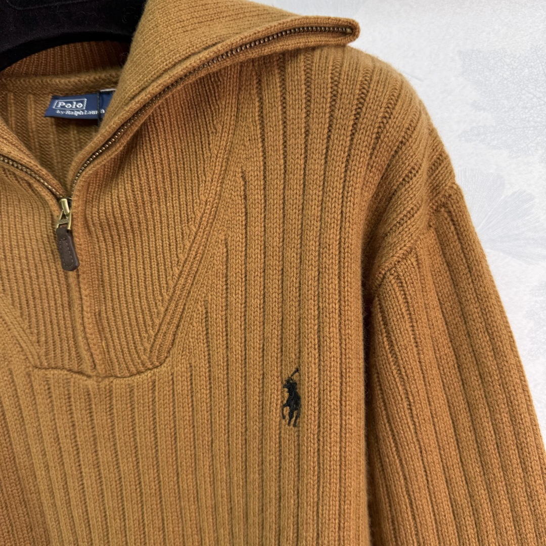 Details: Zippered knitted sweater with horse logo, made of custom yarn, fall fashion item.