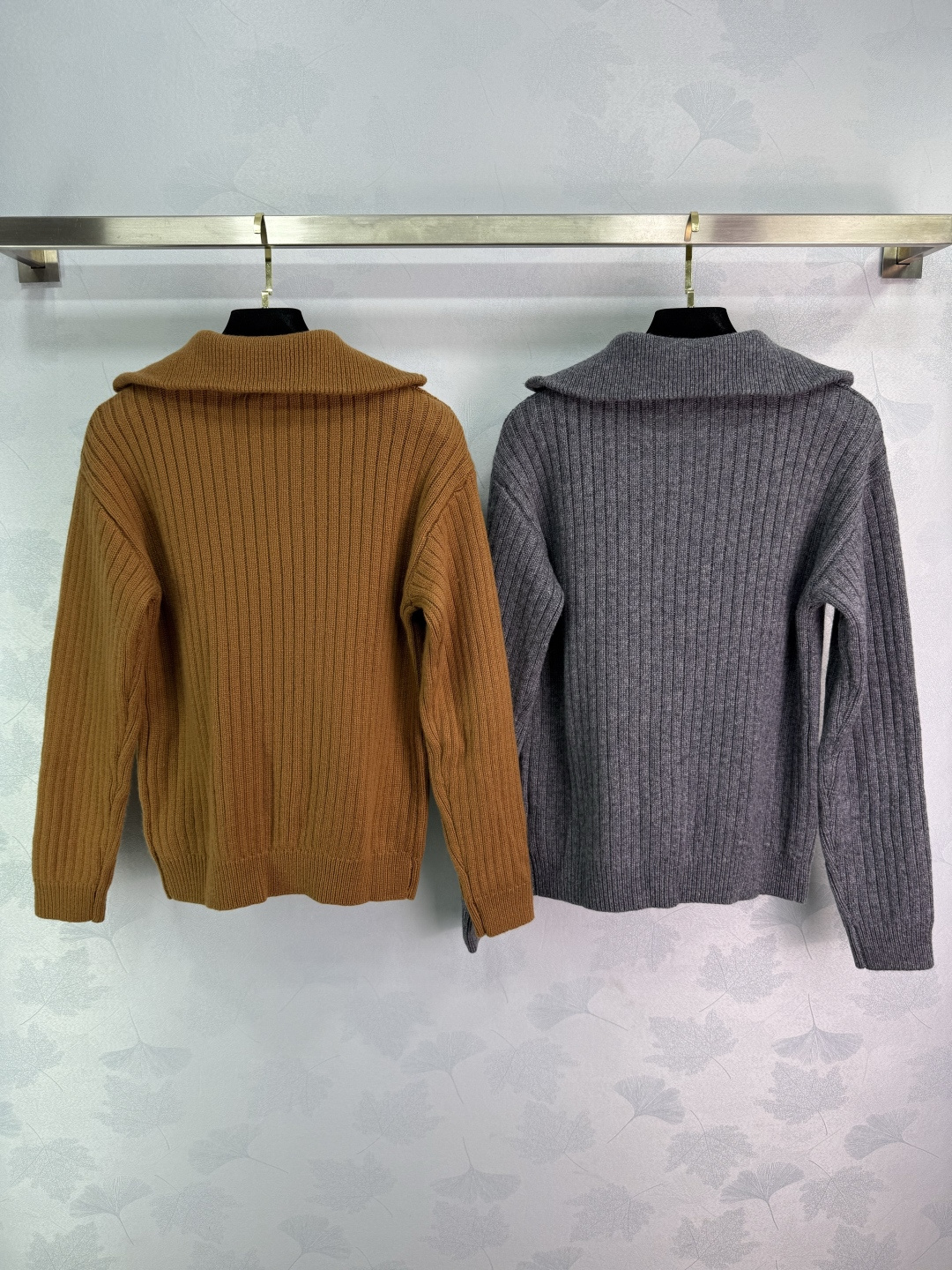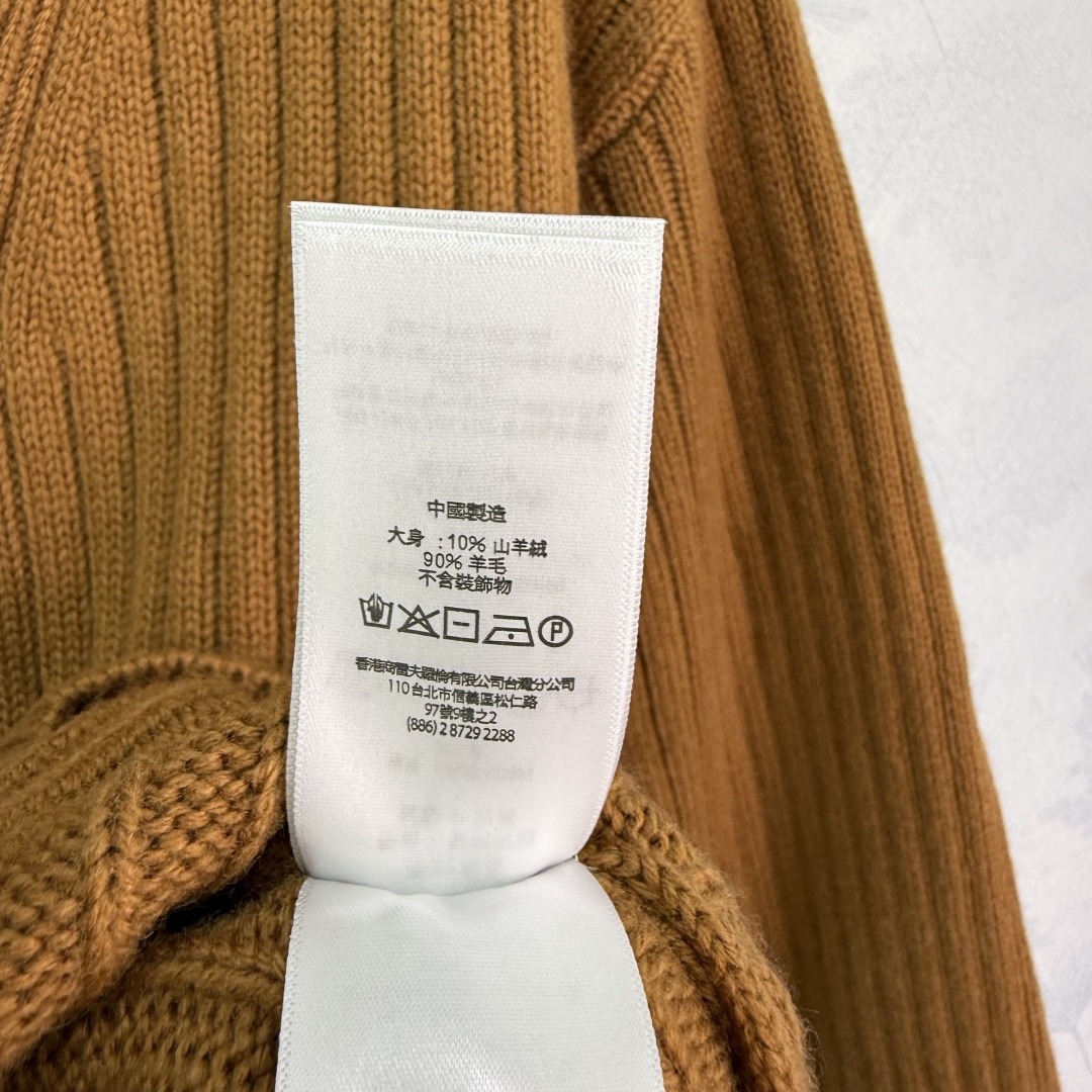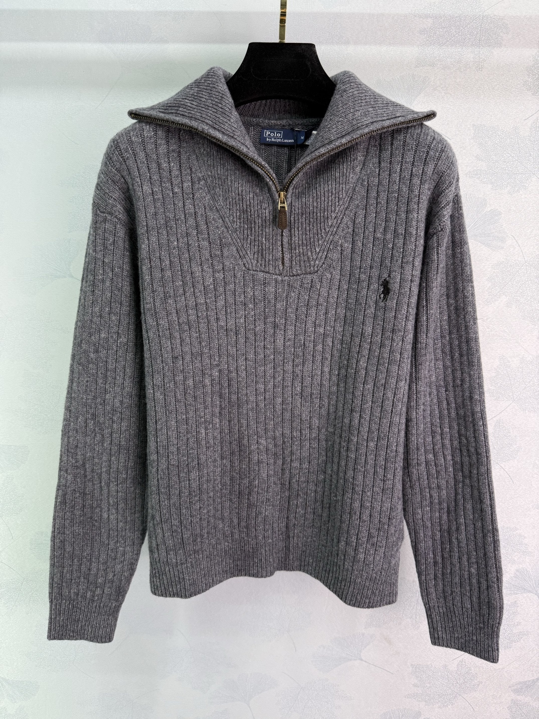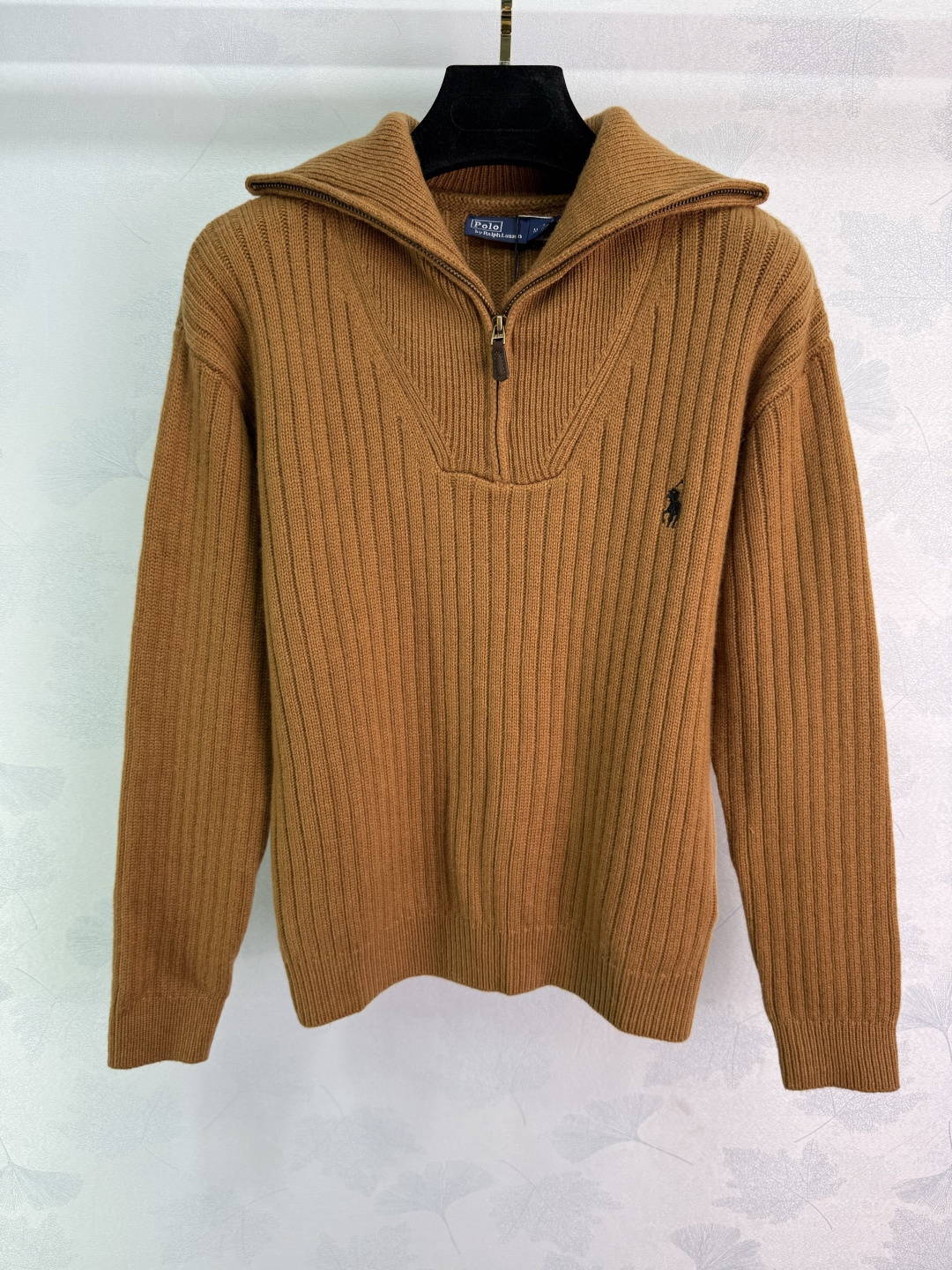 Details: Zippered knitted sweater with horse logo, made of custom yarn, fall fashion item.