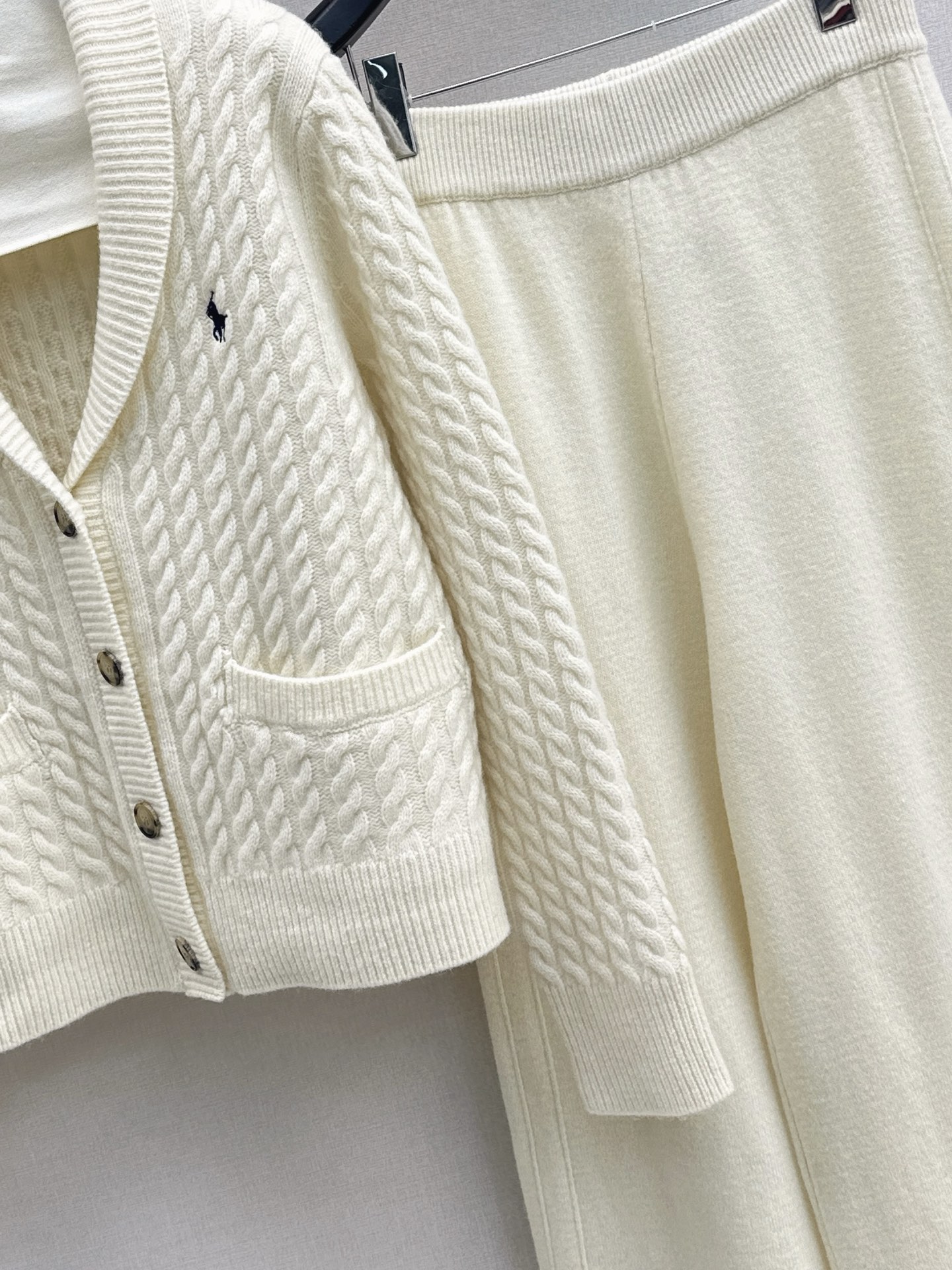 Details: Early spring knitted suit with V-neck cardigan and straight-leg pants, made of custom wool, elegant and easy to match.