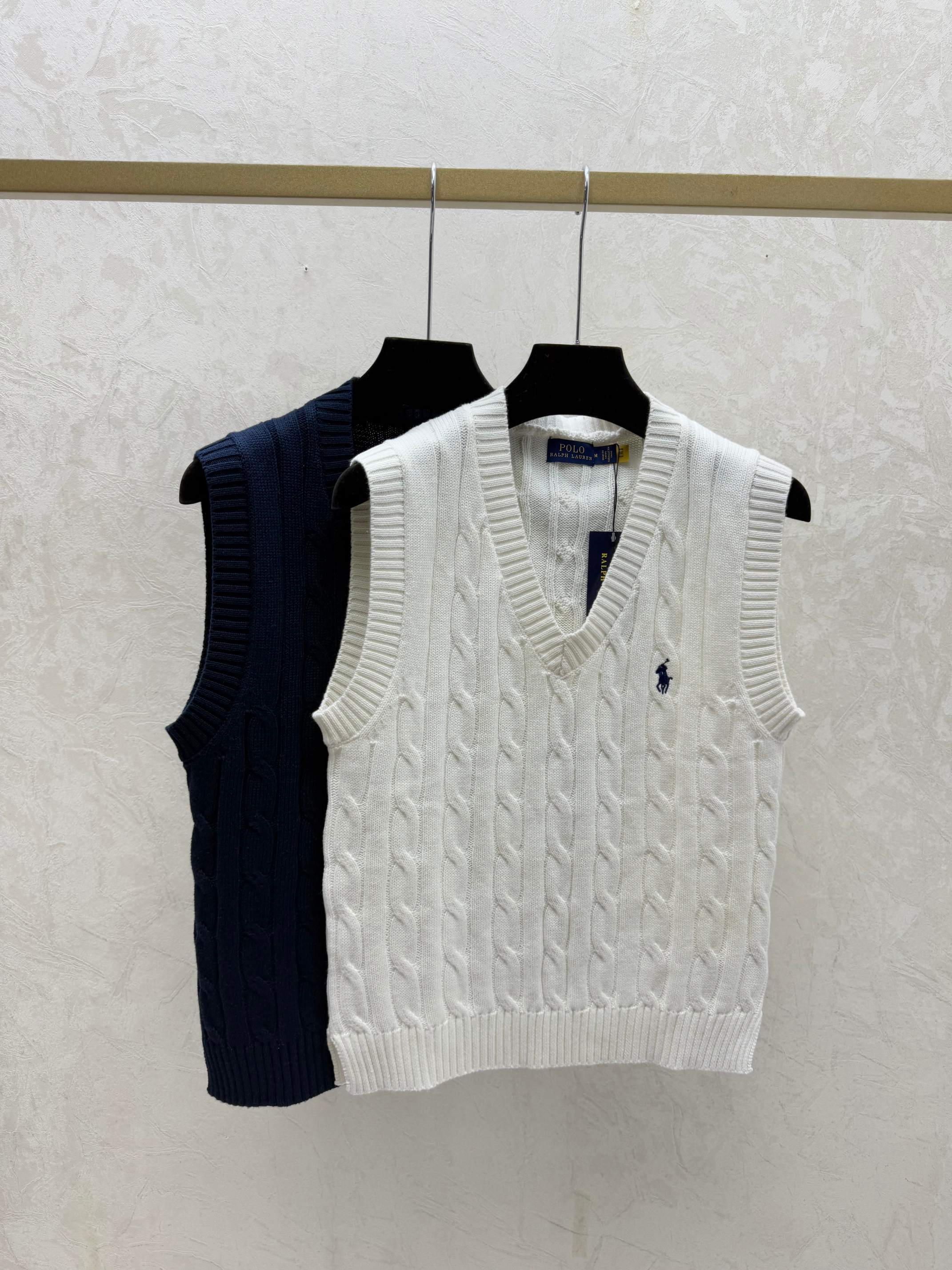 Details: Early spring solid-color V-neck knitted vest in white and sapphire blue, sizes 38, 40.