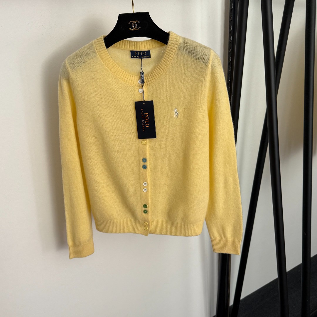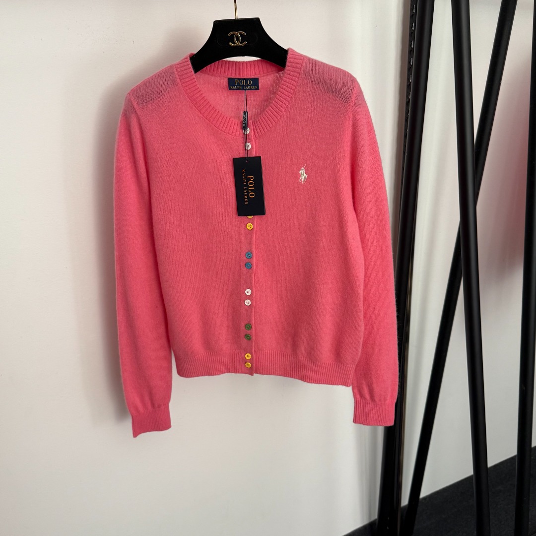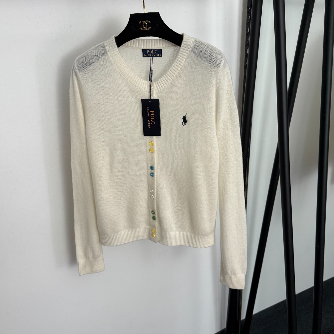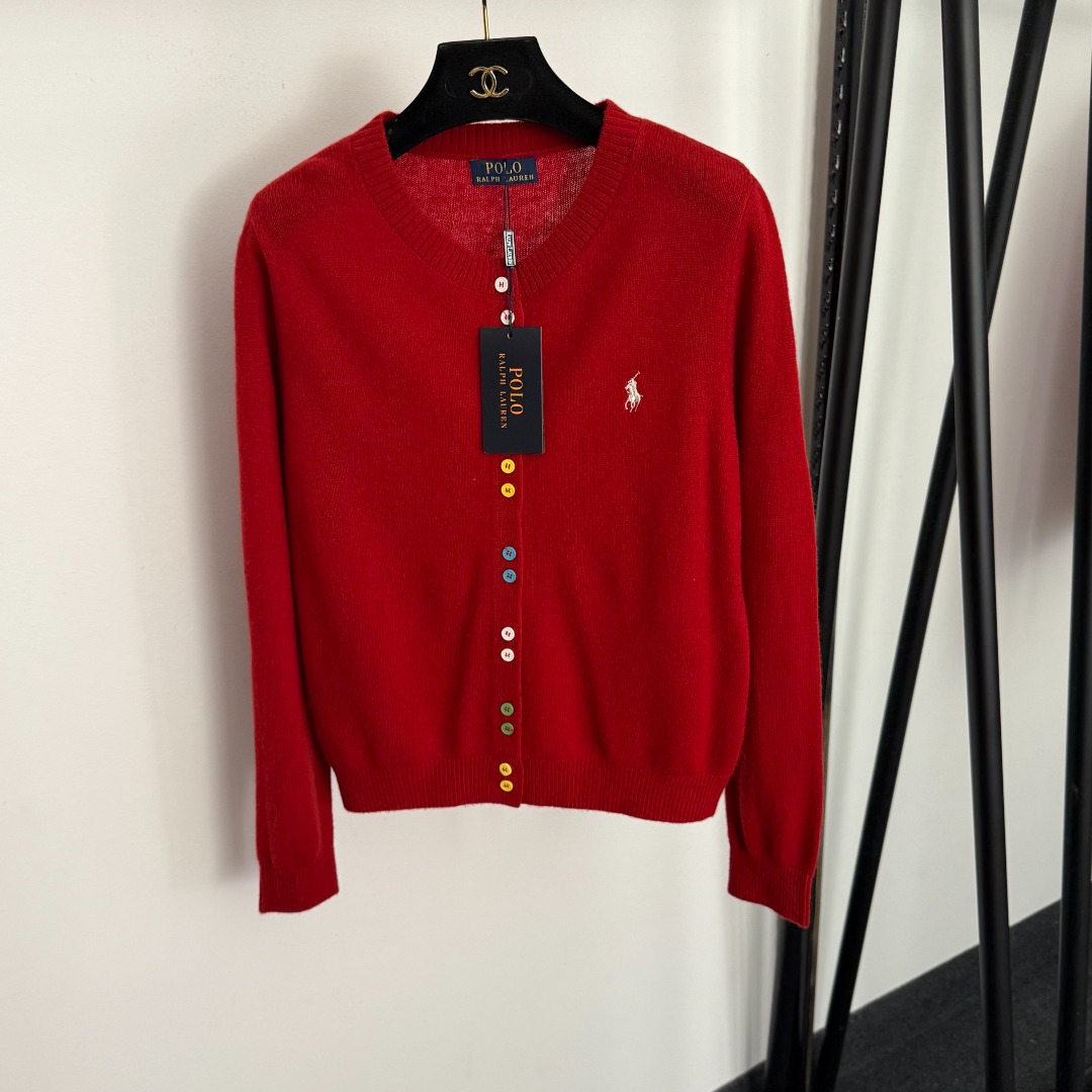 Details: Multi-color wool-cashmere knitted cardigan with polo embroidery and colored buttons, available in S, M, L sizes.