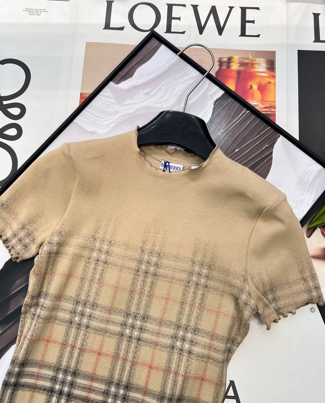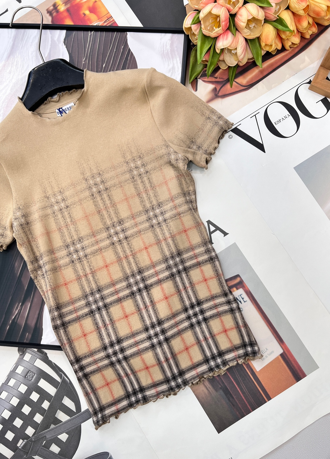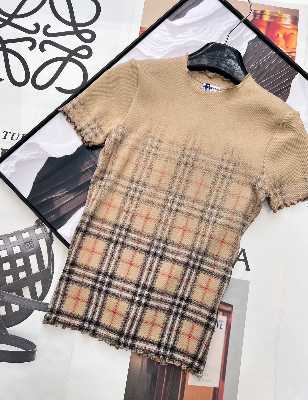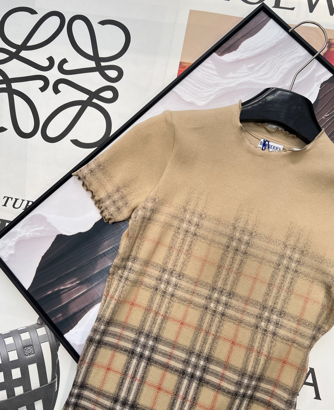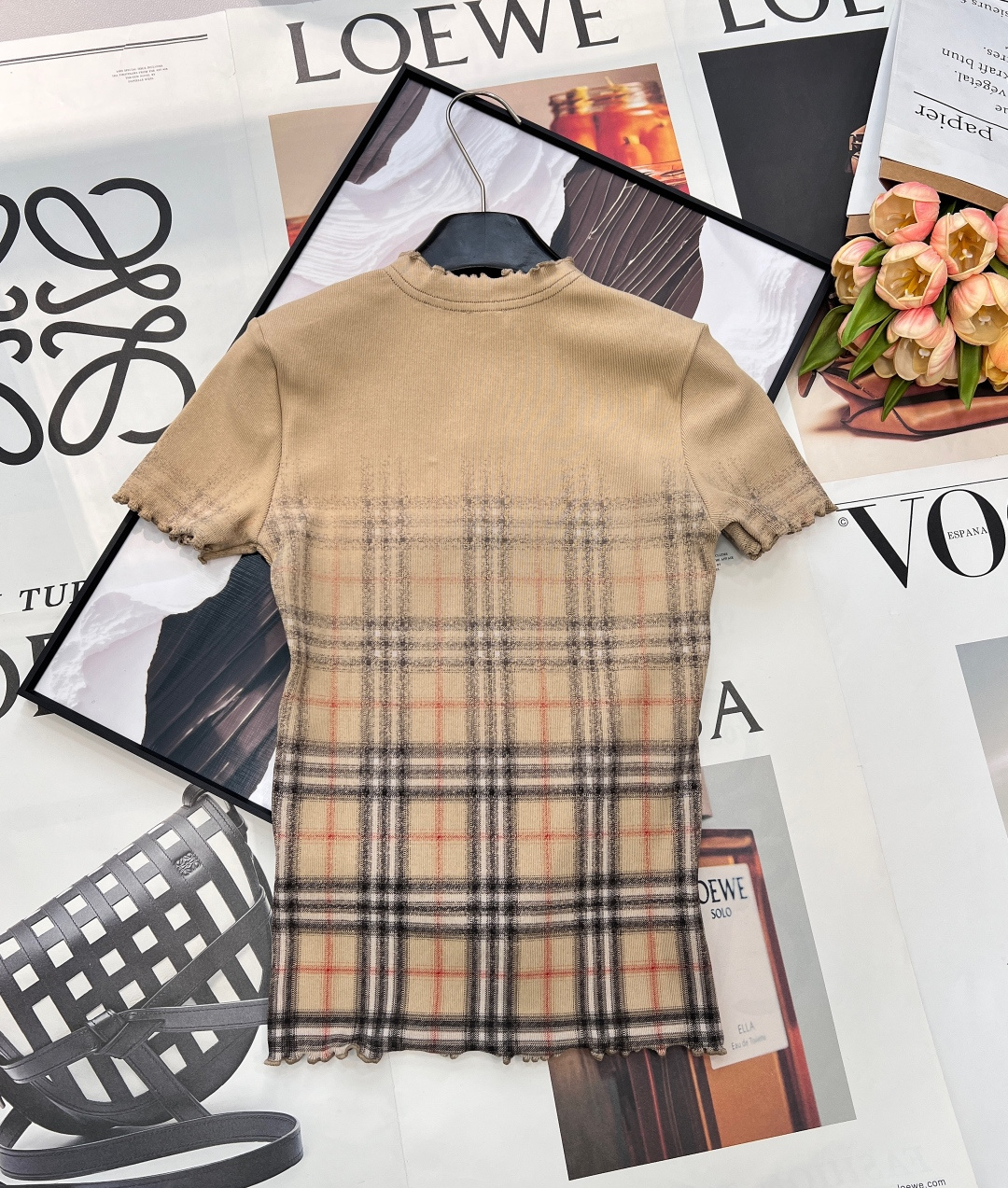 Details: Classic Khaki Tight Short-sleeved T-shirt with Gradient Tartan and Wave Edges, Versatile for Different Styles