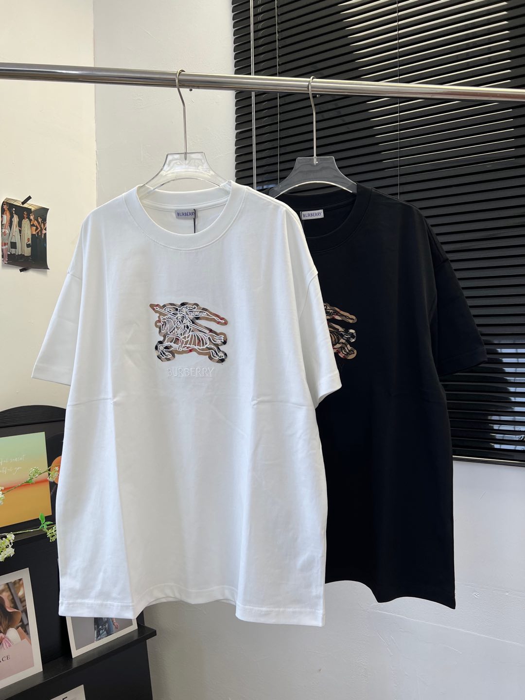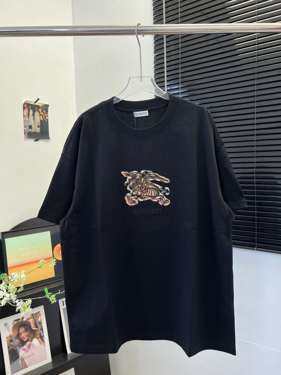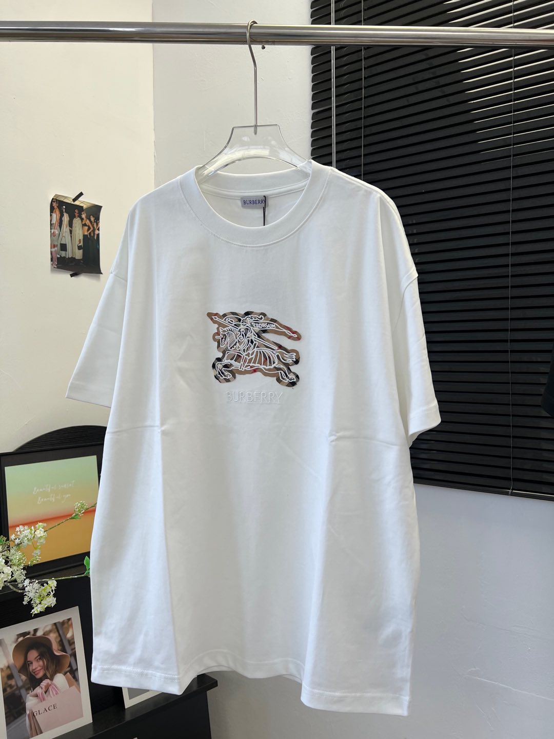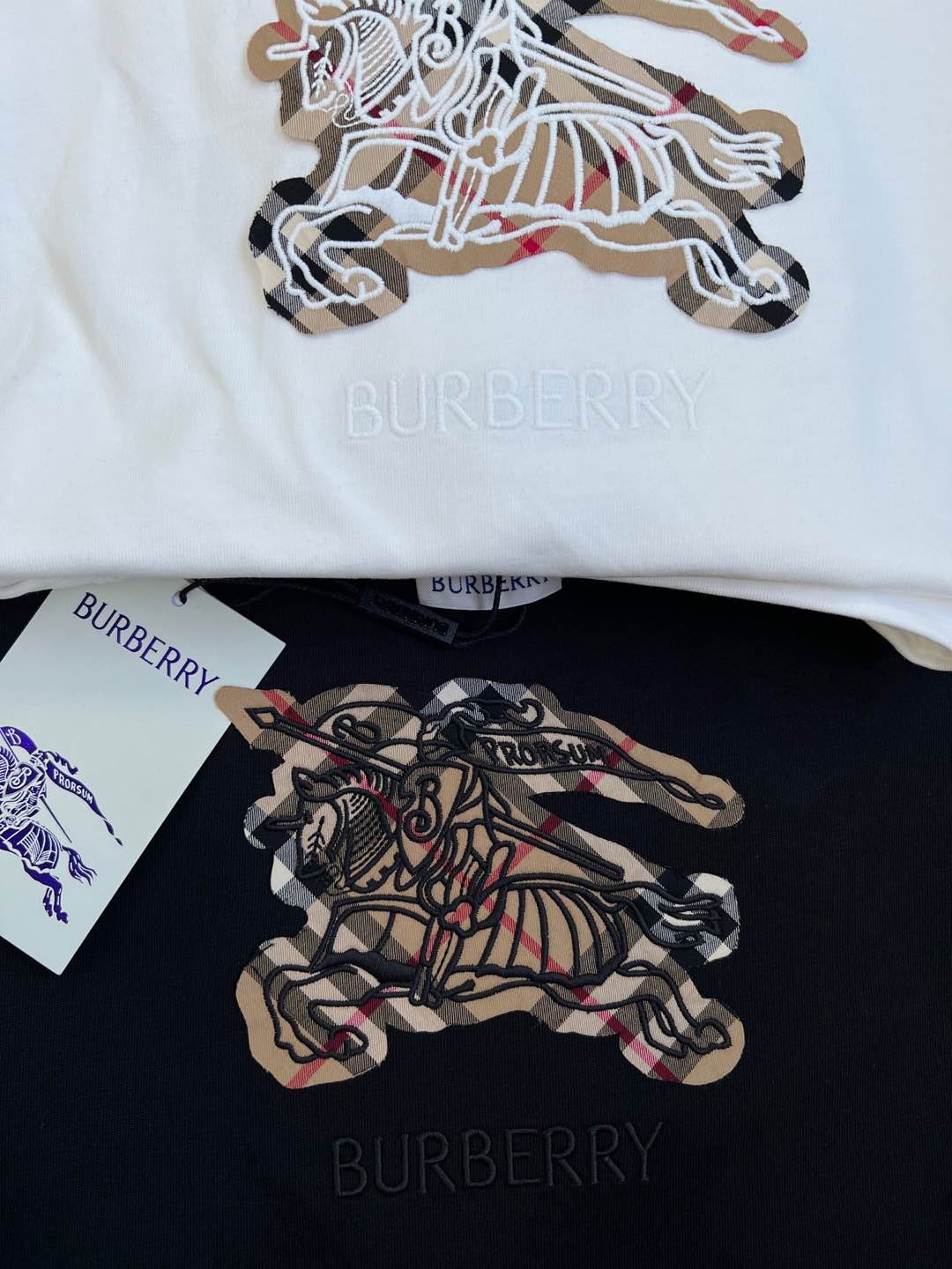 Details: Cotton short-sleeved T-shirt with check pattern and embroidered horse logo, unisex, high-end customization