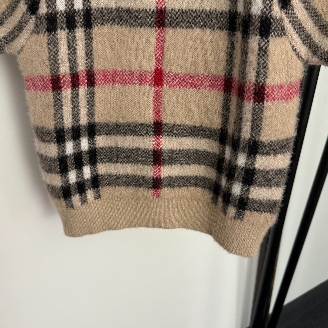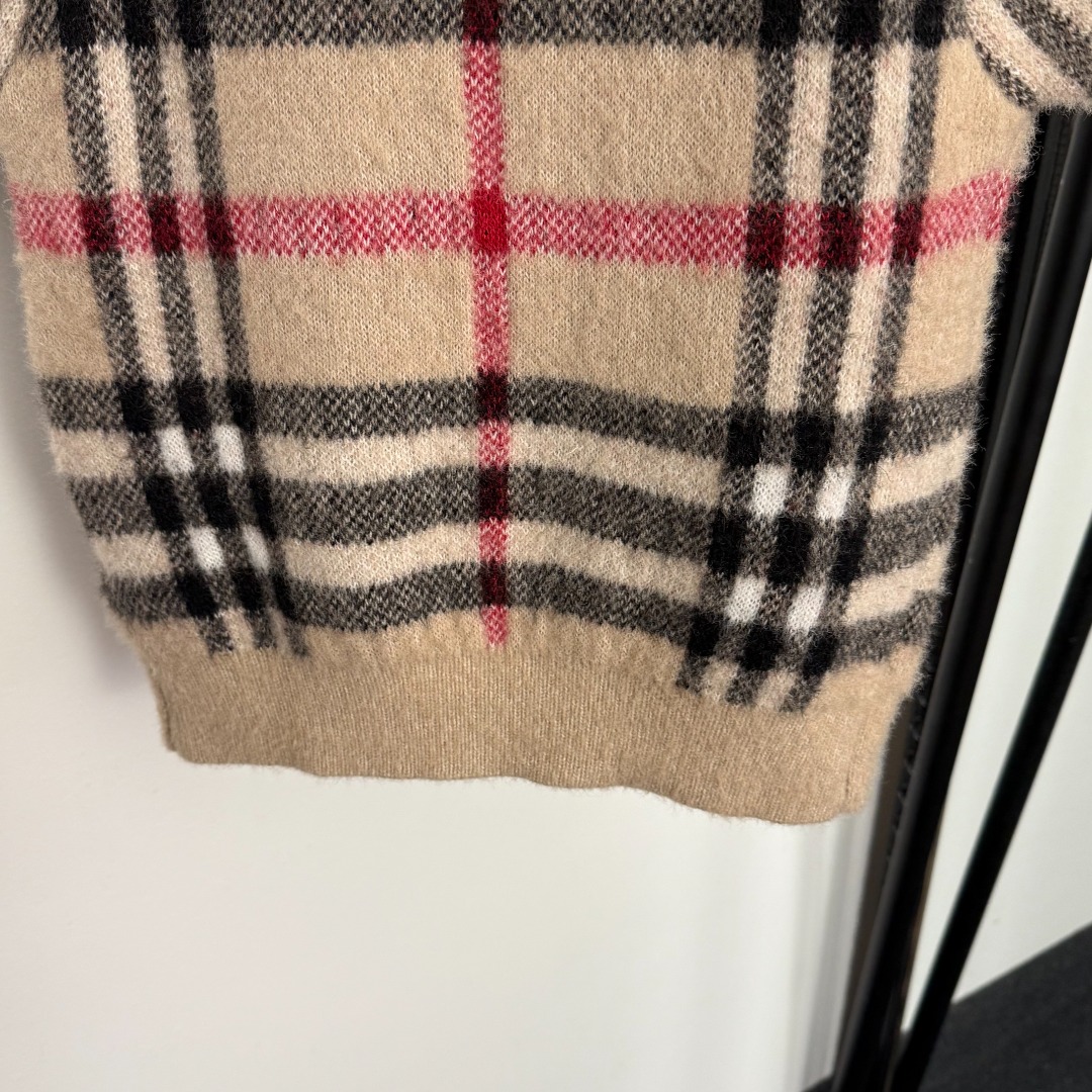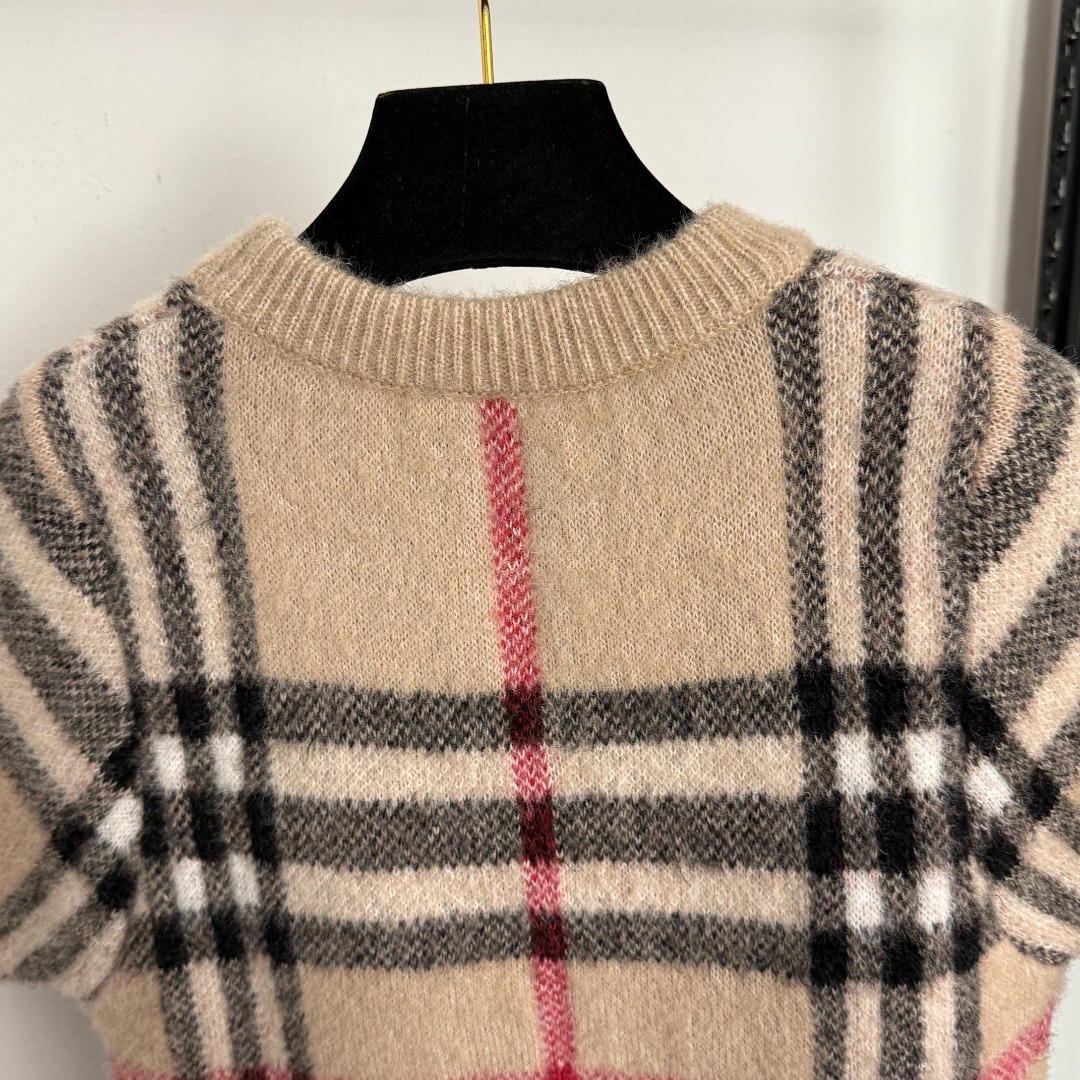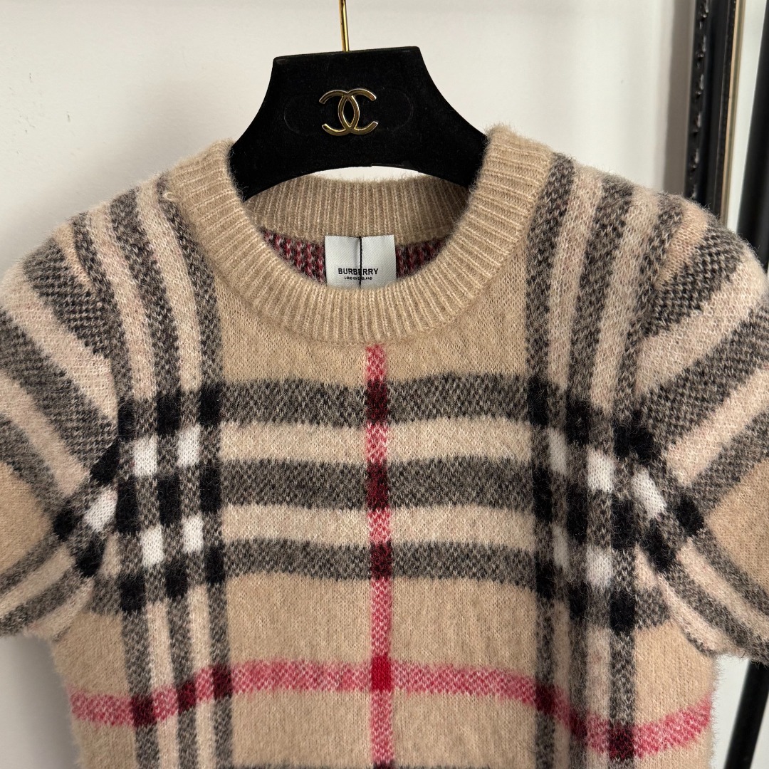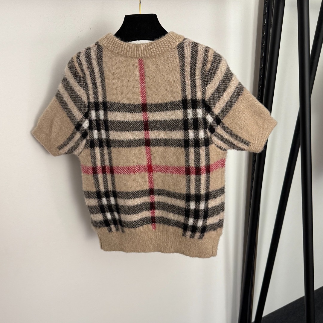 Details: New color-blocked plaid short-sleeved wool knitted top, khaki, available in S, M, L sizes.