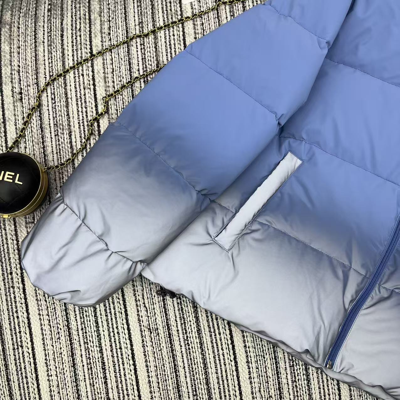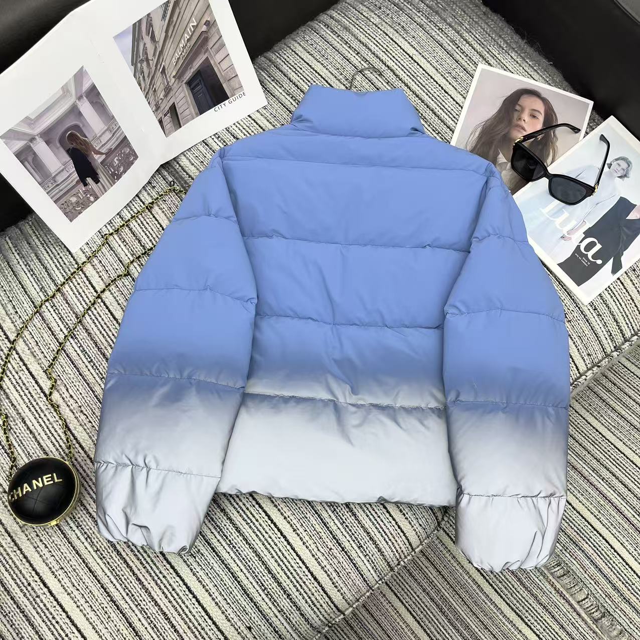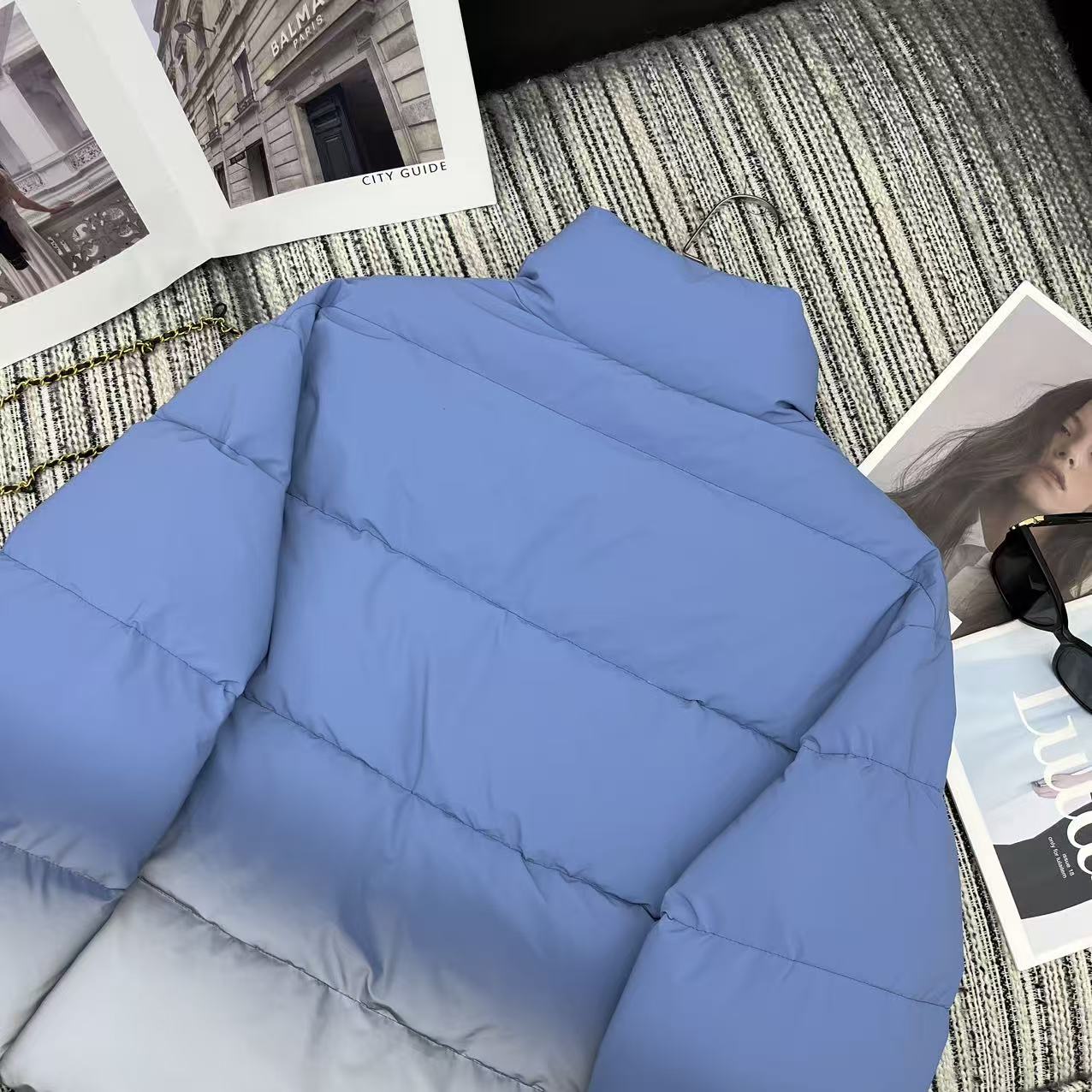 Details: Recommended autumn-winter short puffer jacket in blue-grey gradient, filled with 90% down, practical and stylish.