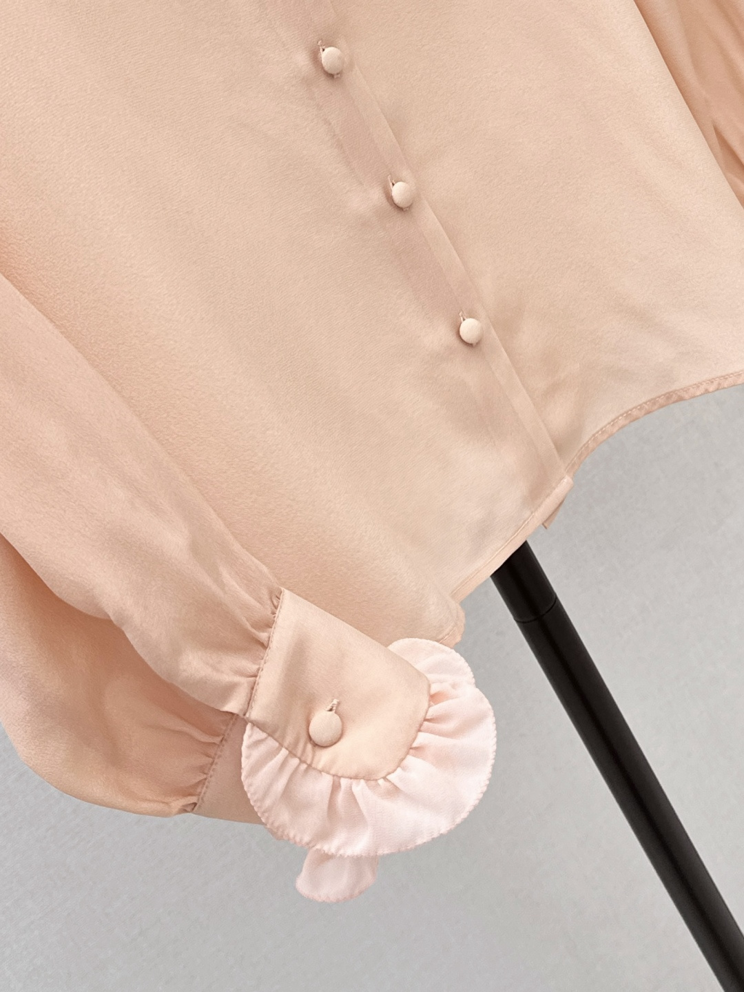 Details: Spring/Summer silk shirt with ruffled trim, elegant, slimming, and available in three colors.