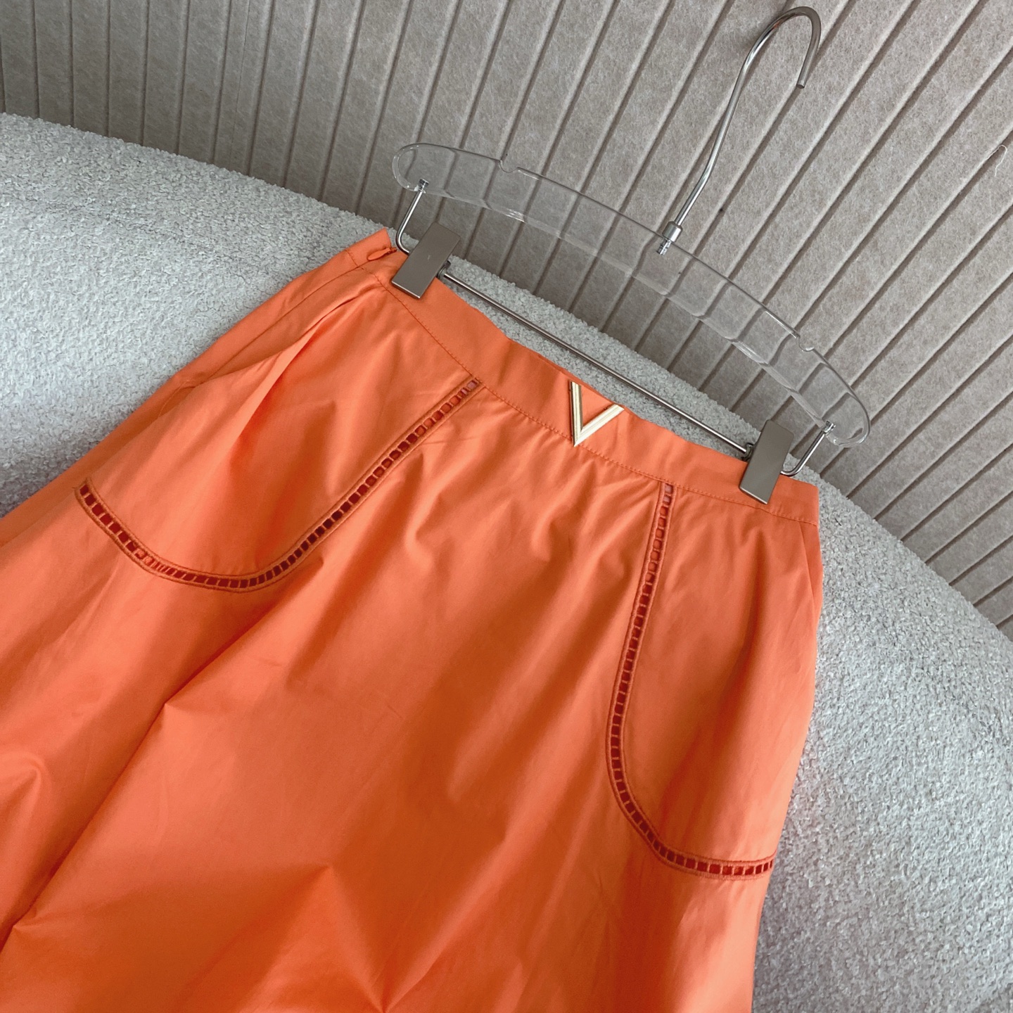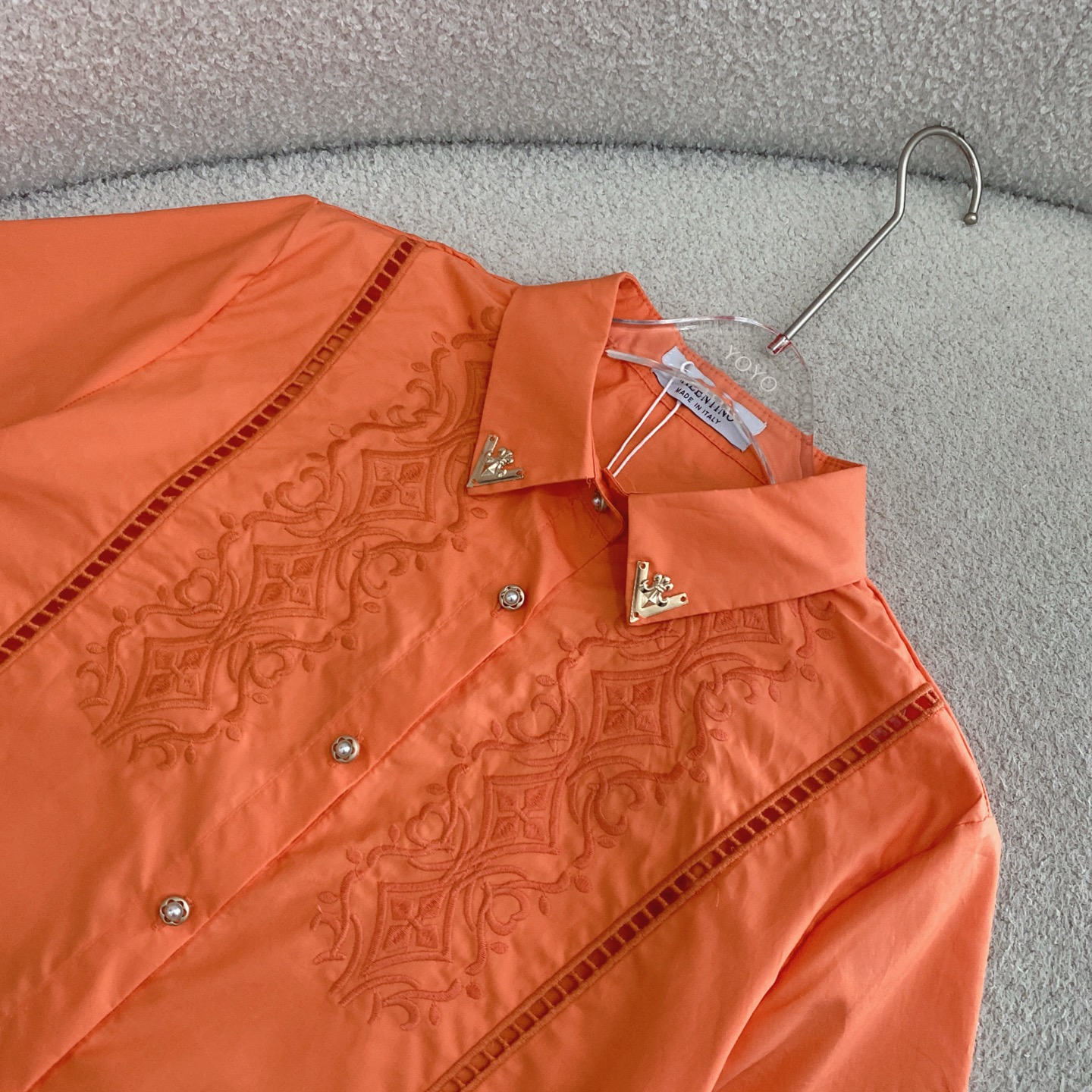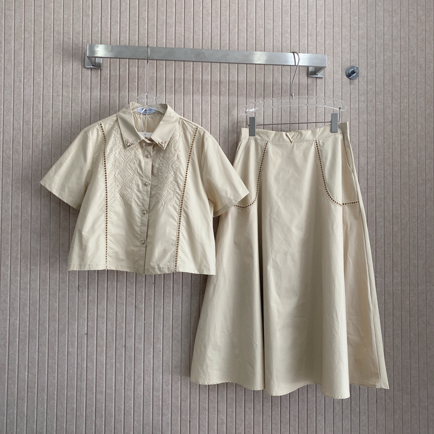 Details: Elegant commuter suit with gold buckle V-neck and hollow embroidery, high-end customization, fine workmanship