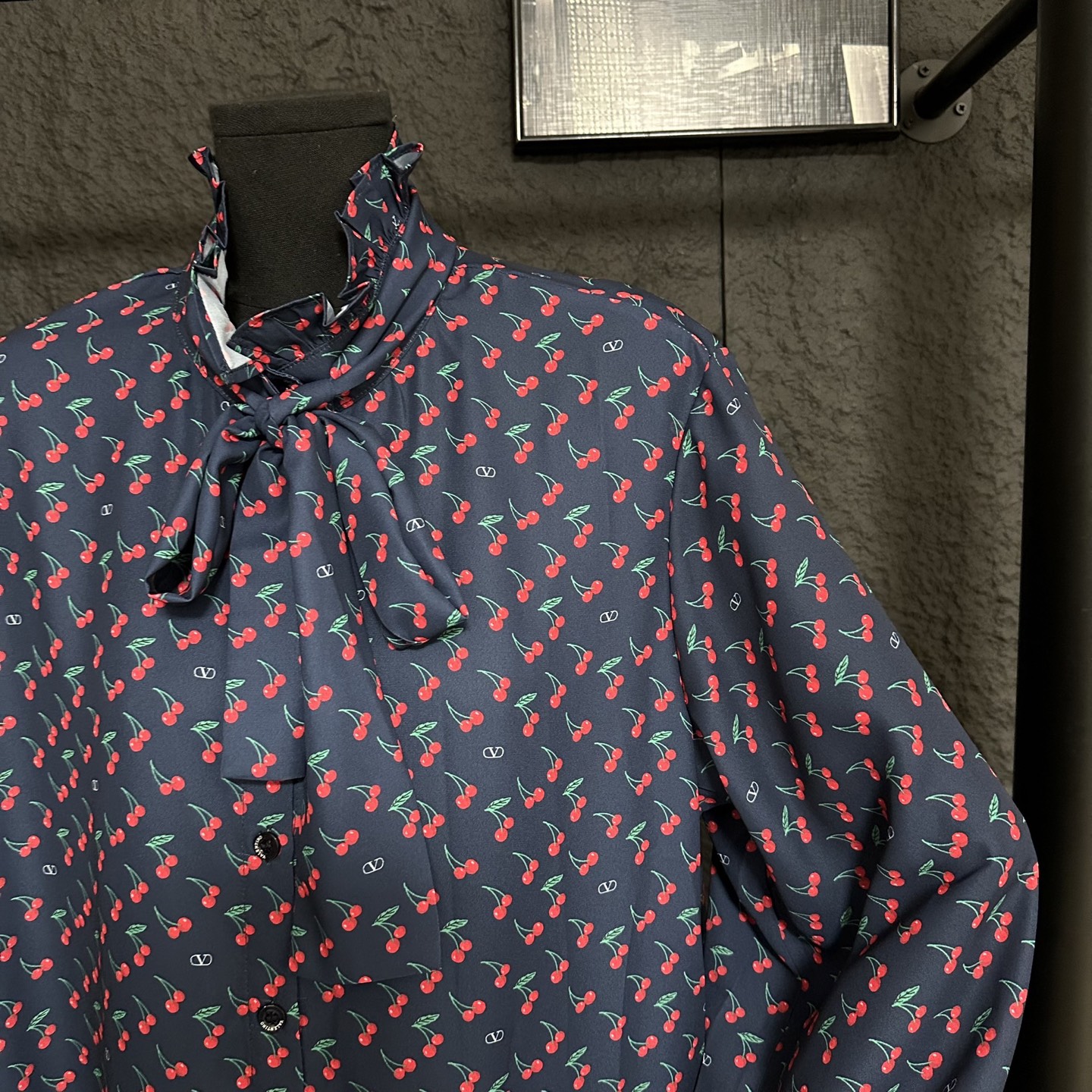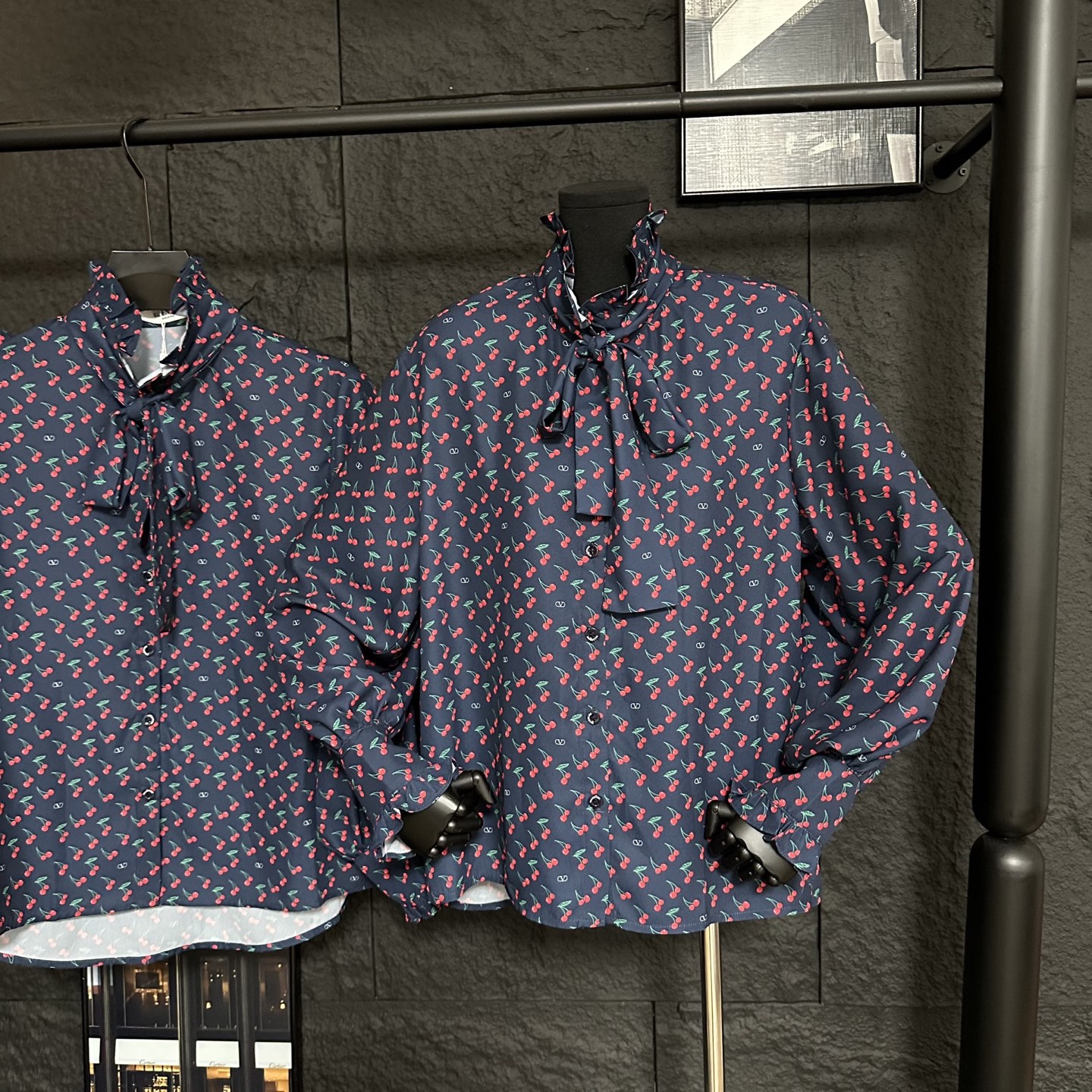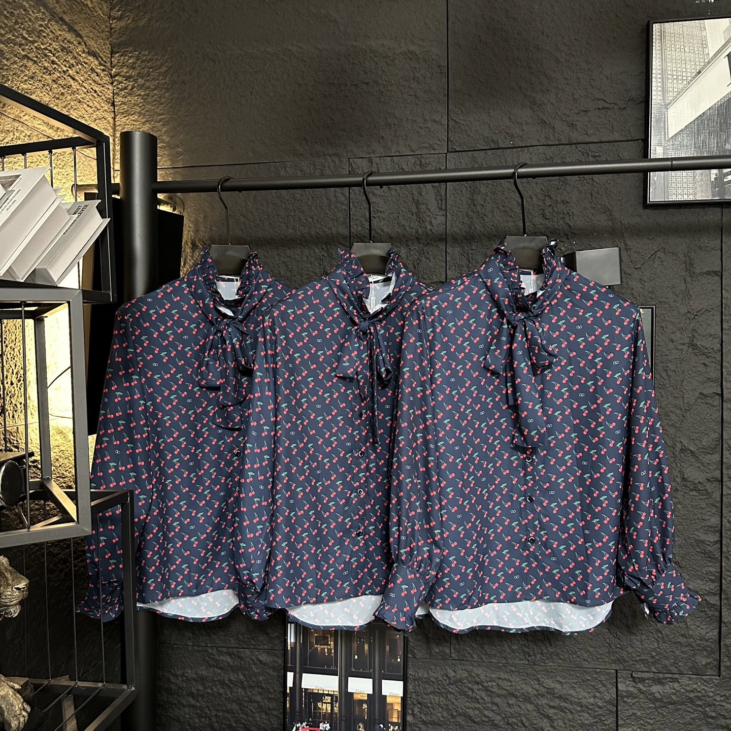 Details: Early autumn new long-sleeve shirt with cherry print, oversized design, detachable ribbon at the collar, blending elegance and freshness.