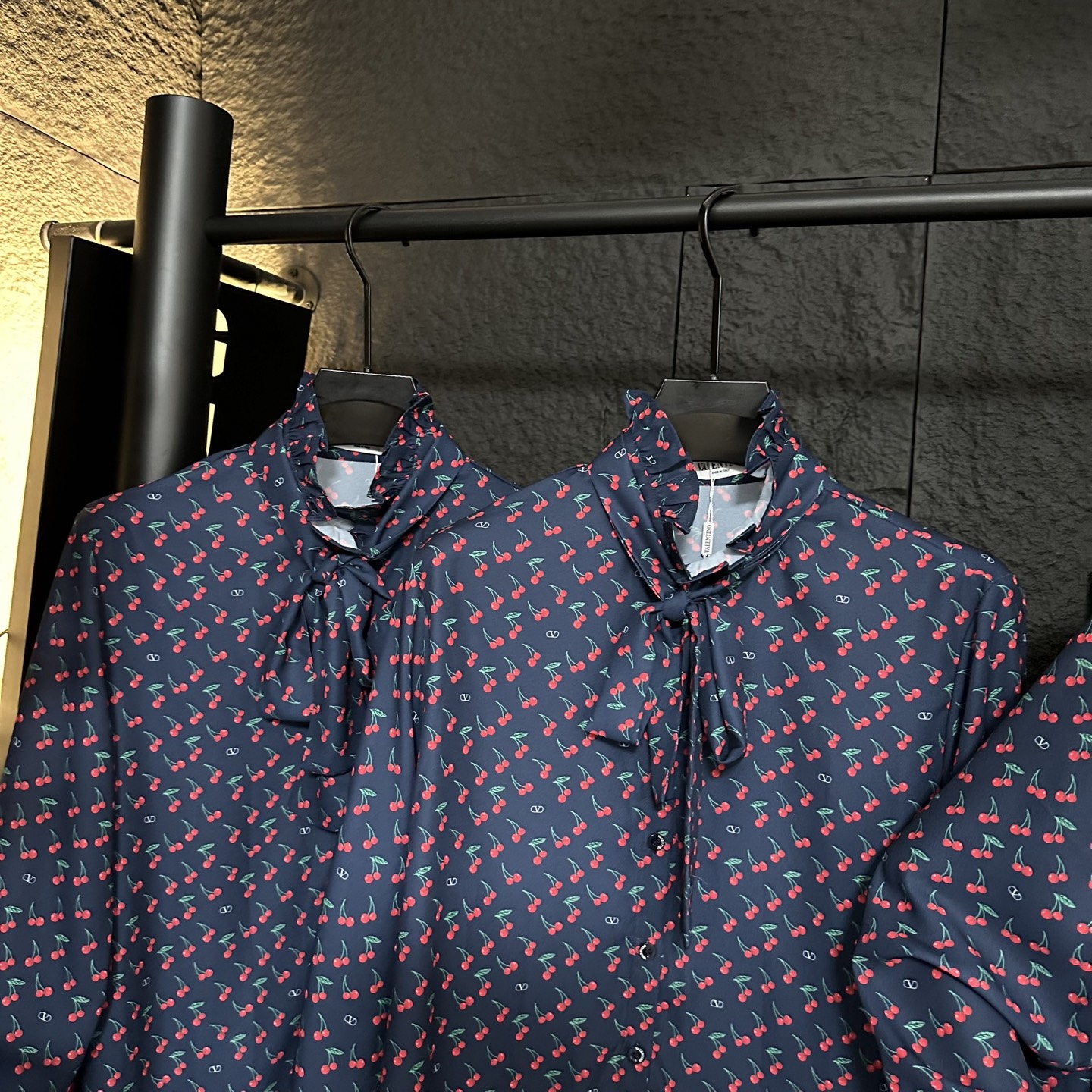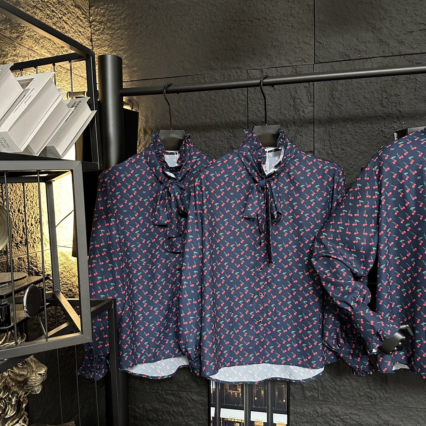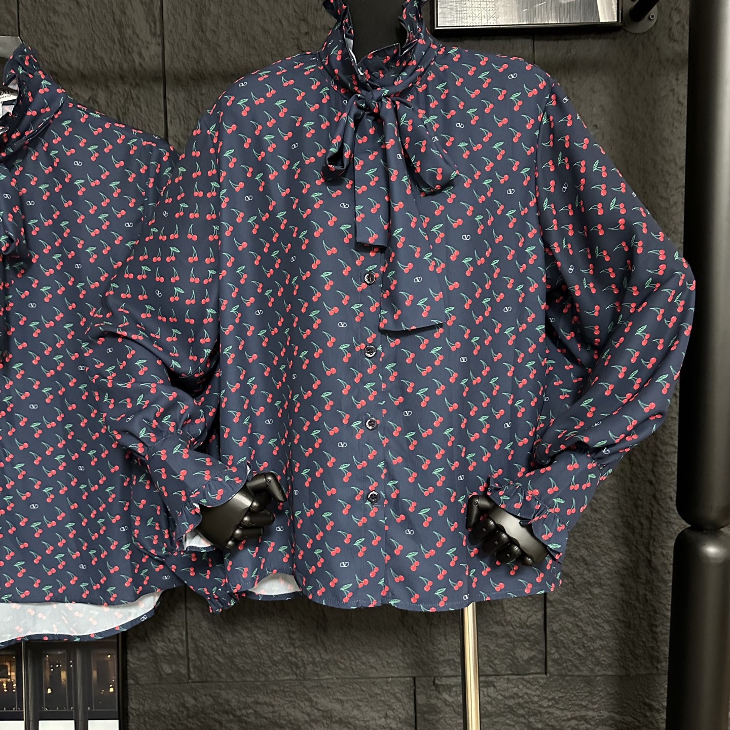 Details: Early autumn new long-sleeve shirt with cherry print, oversized design, detachable ribbon at the collar, blending elegance and freshness.