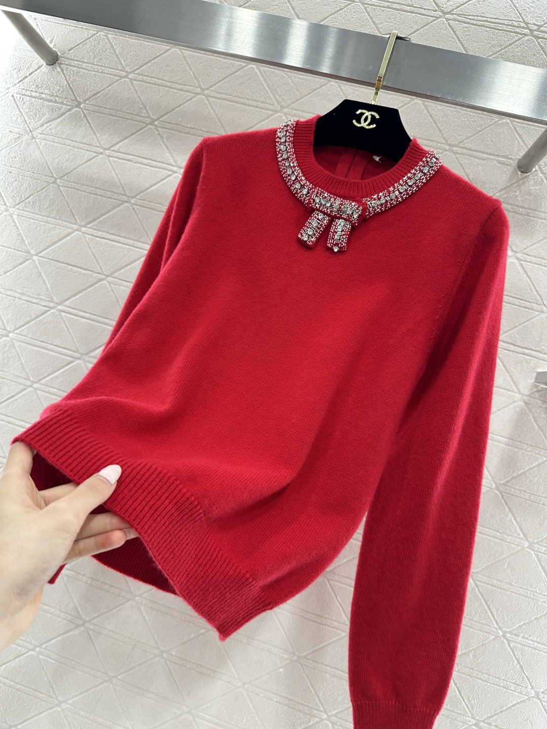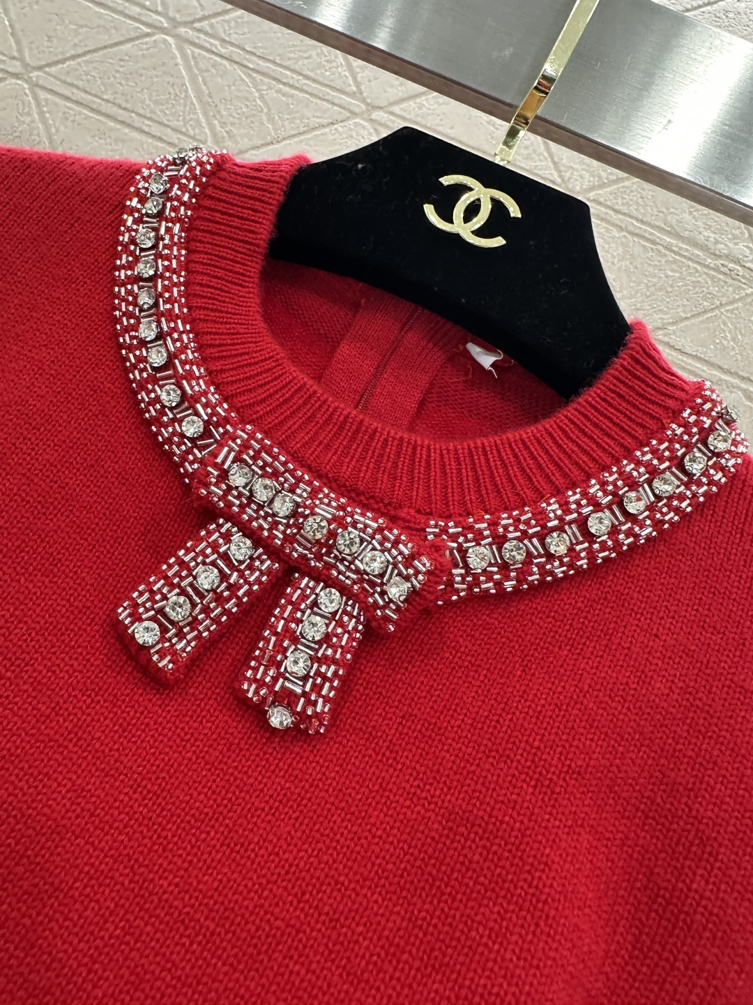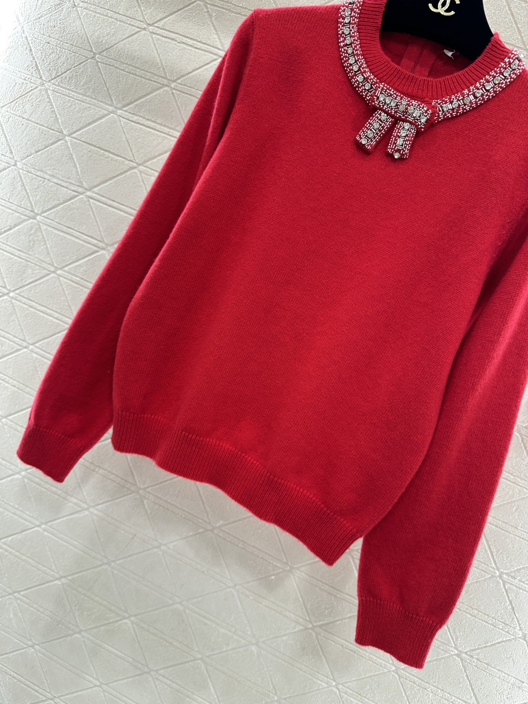 Details: Red Knit Sweater with Bow and Rhinestones, High-end Customization