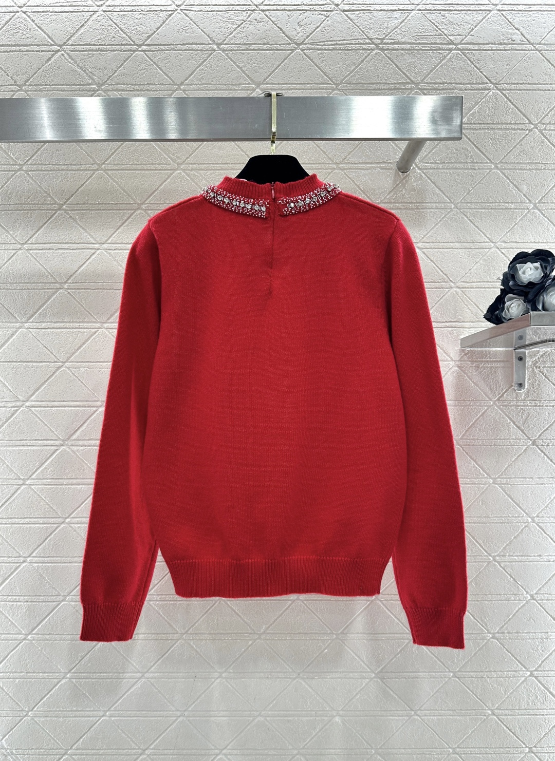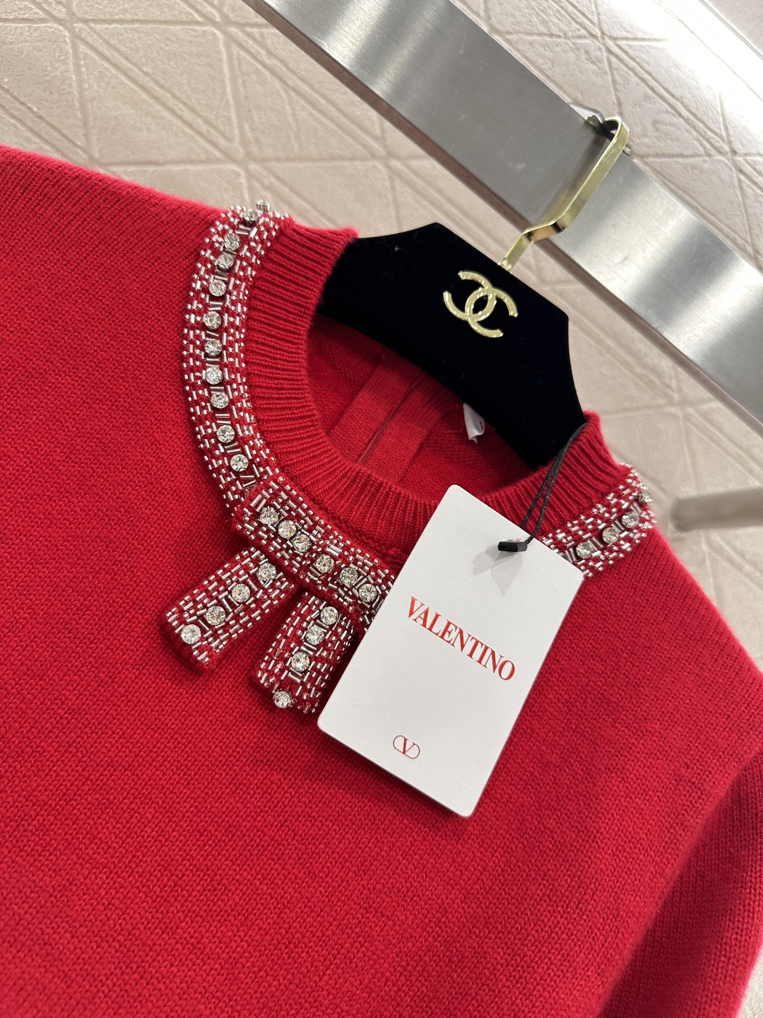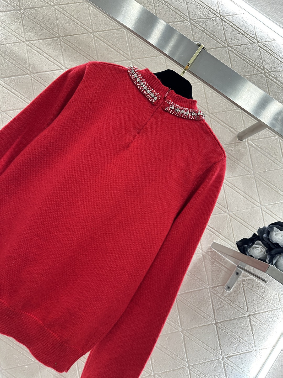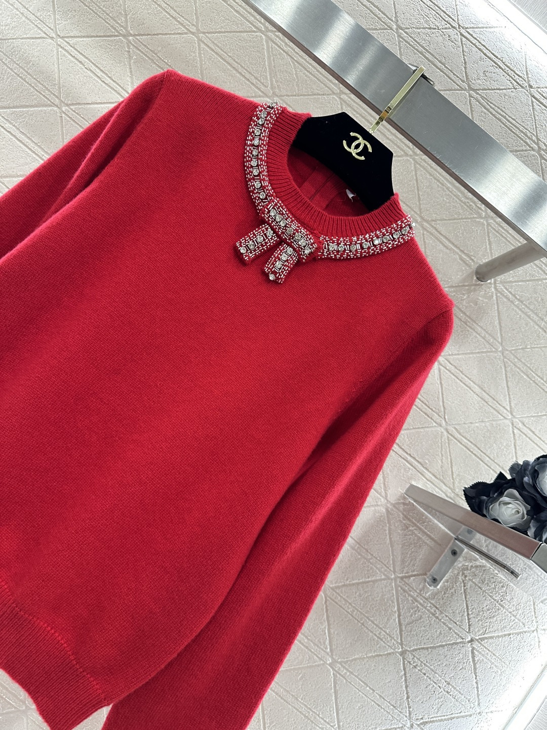 Details: Red Knit Sweater with Bow and Rhinestones, High-end Customization