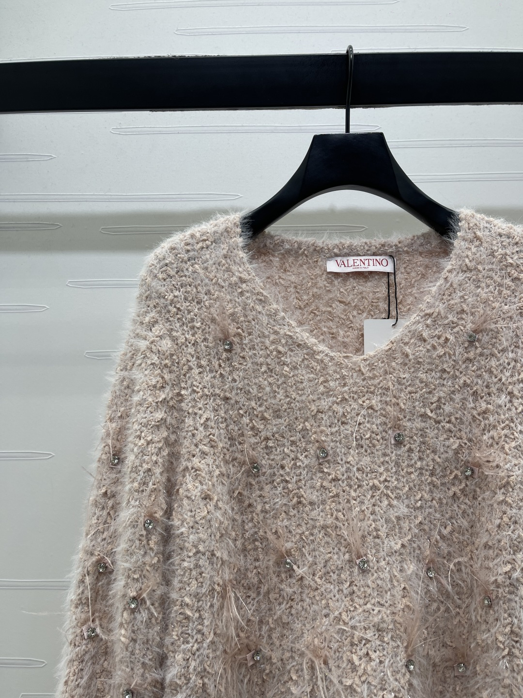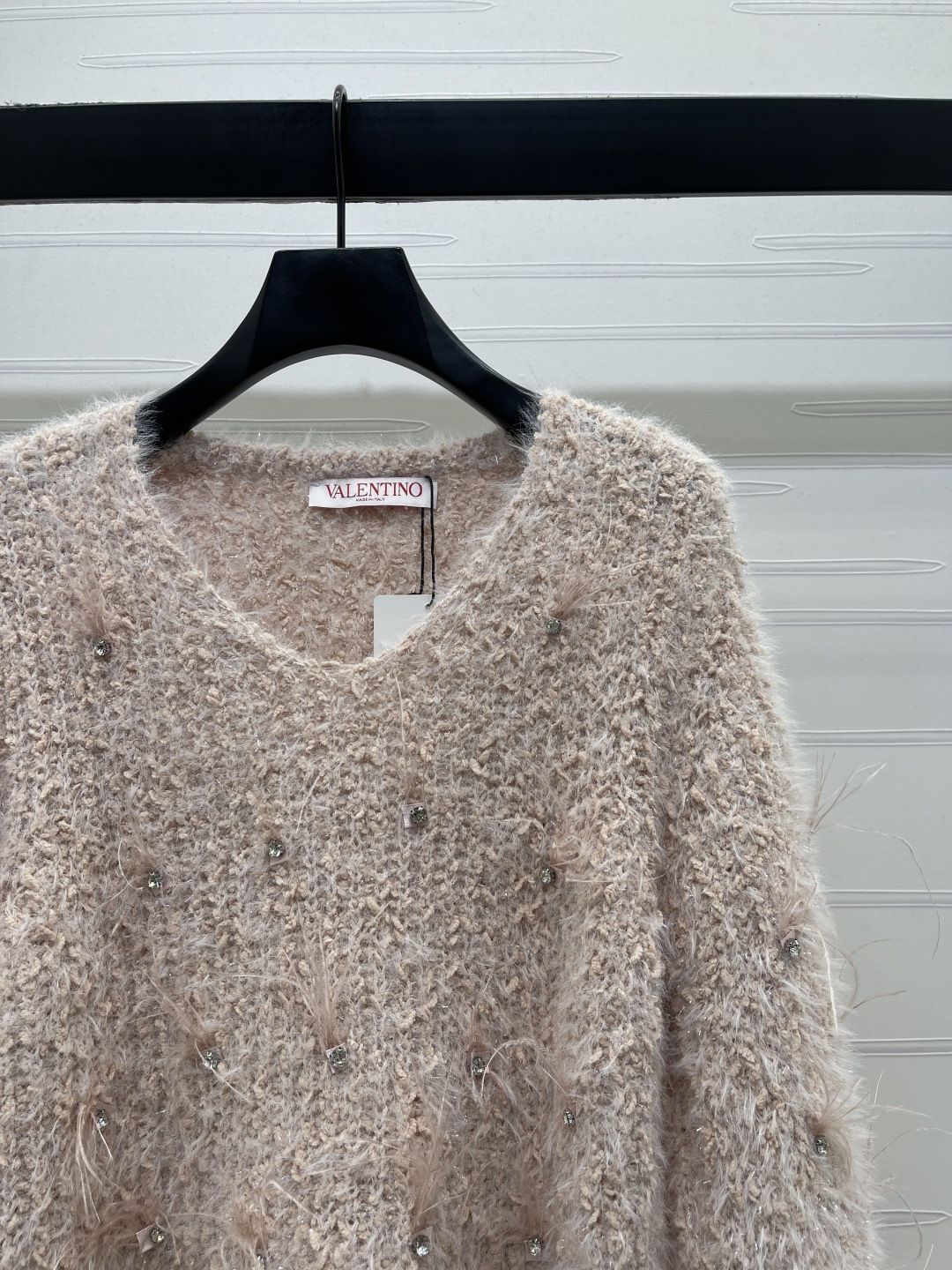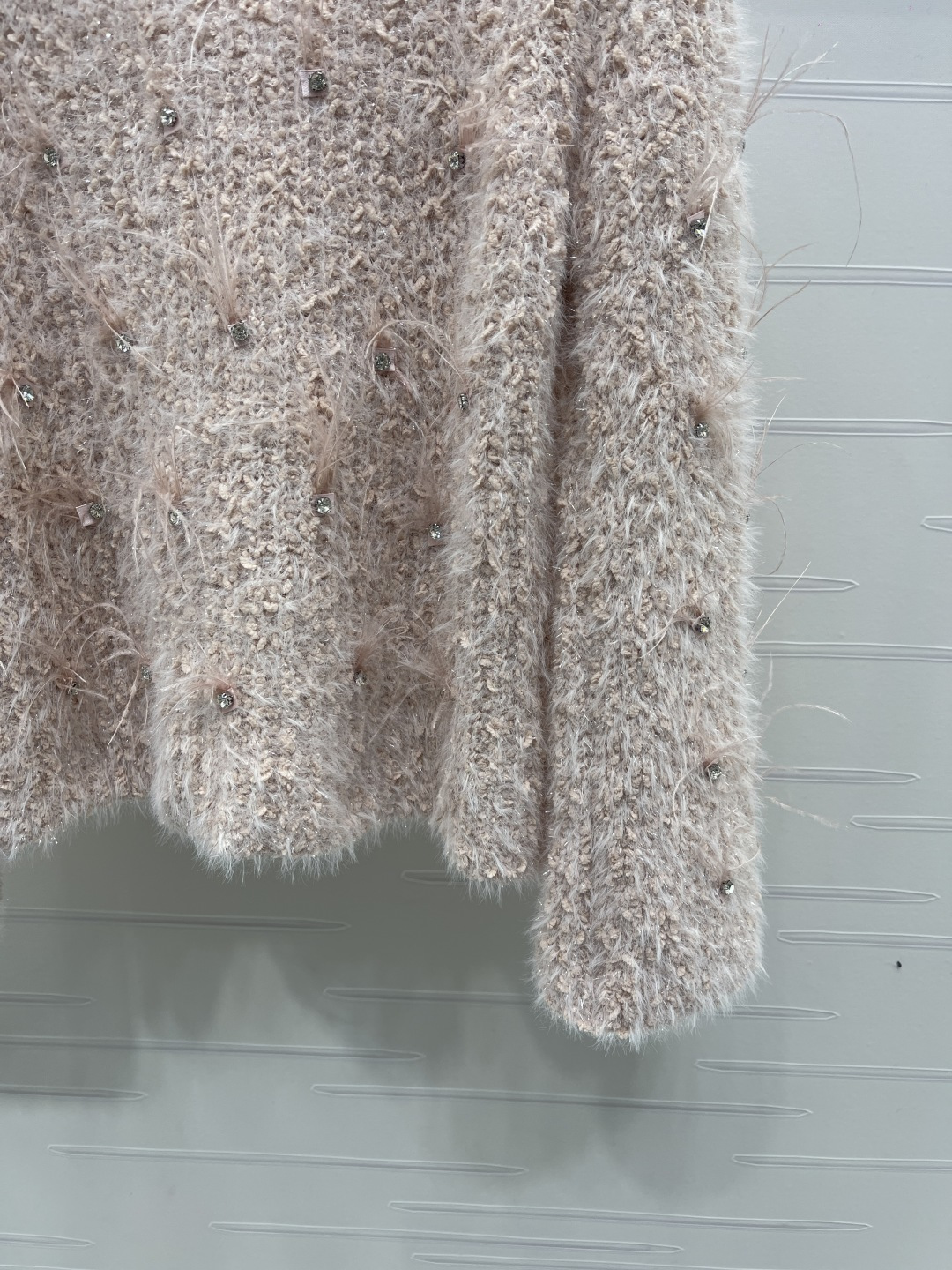 Details: Spring V-neck long-sleeved knitted top with diamond and feather embellishments, high-quality custom wool yarn, elegant and versatile, sweet and artistic.