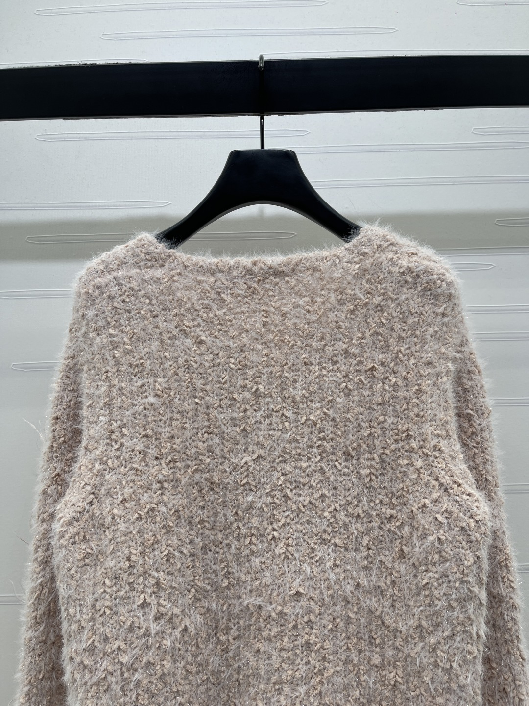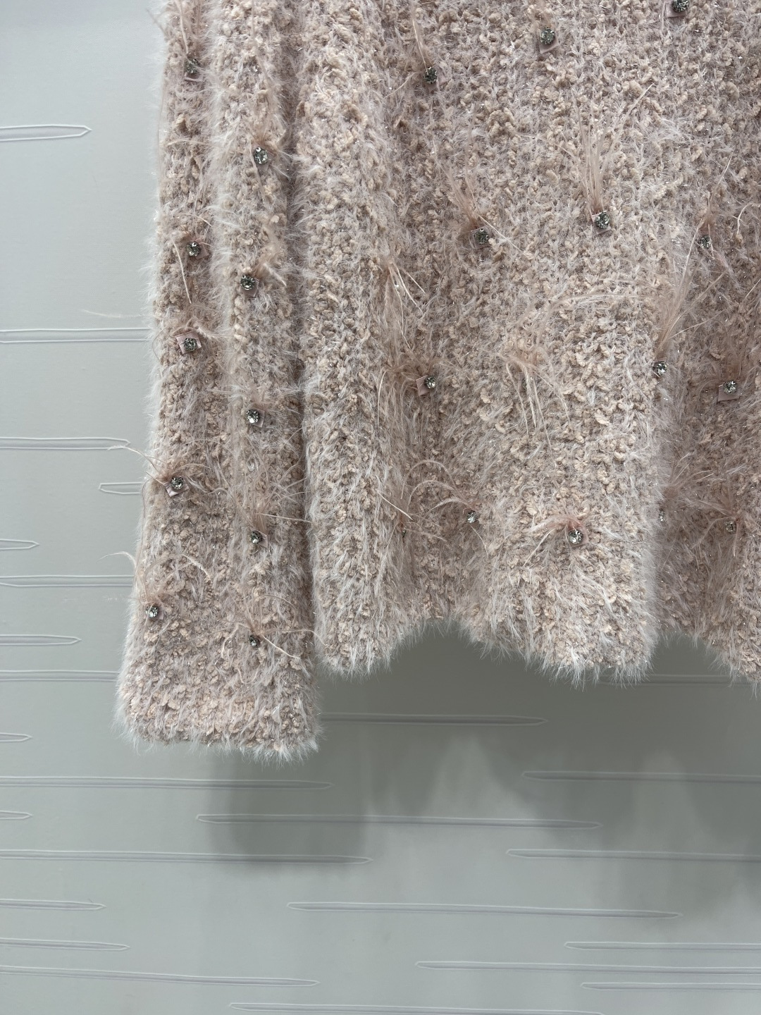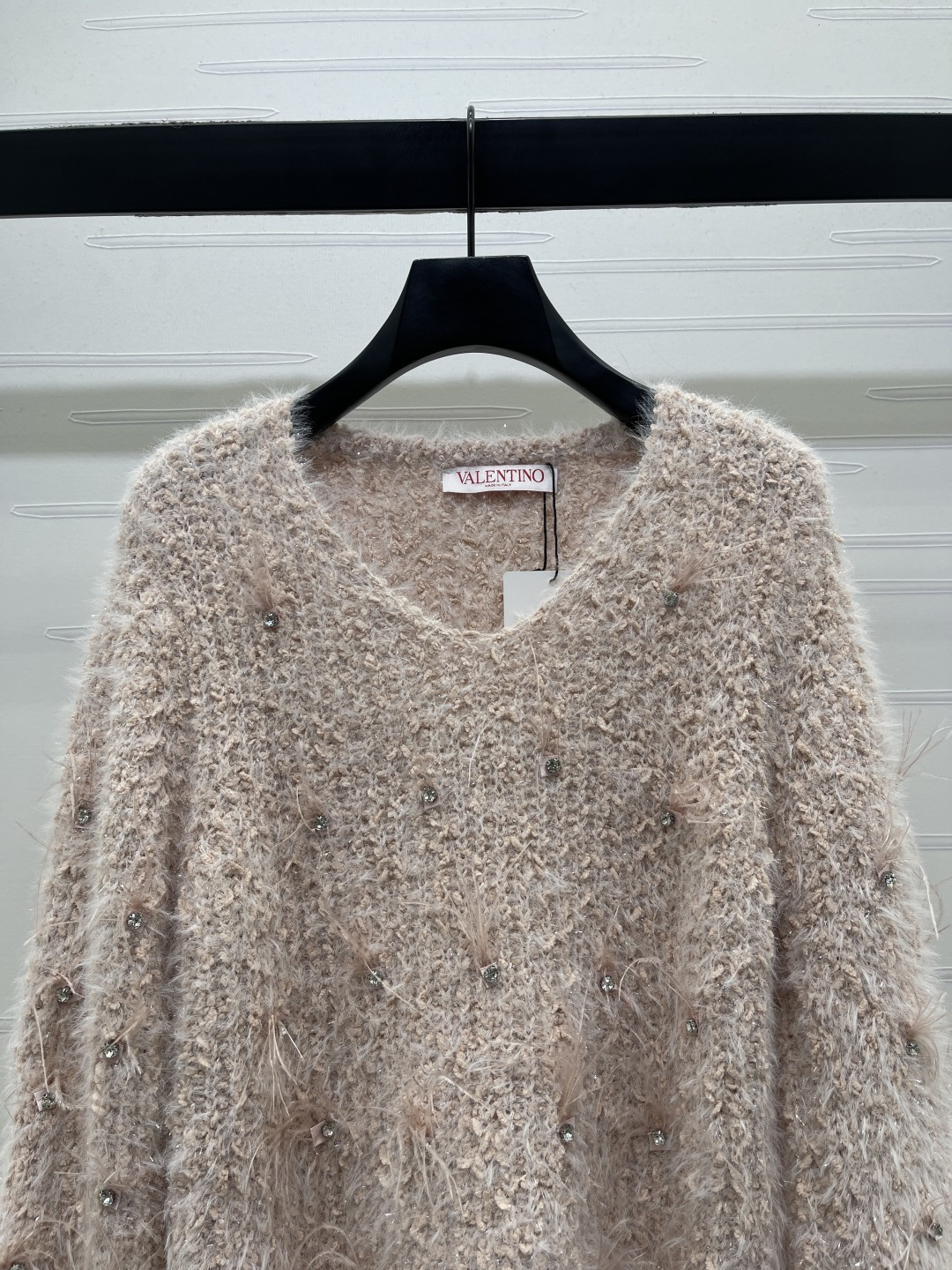 Details: Spring V-neck long-sleeved knitted top with diamond and feather embellishments, high-quality custom wool yarn, elegant and versatile, sweet and artistic.