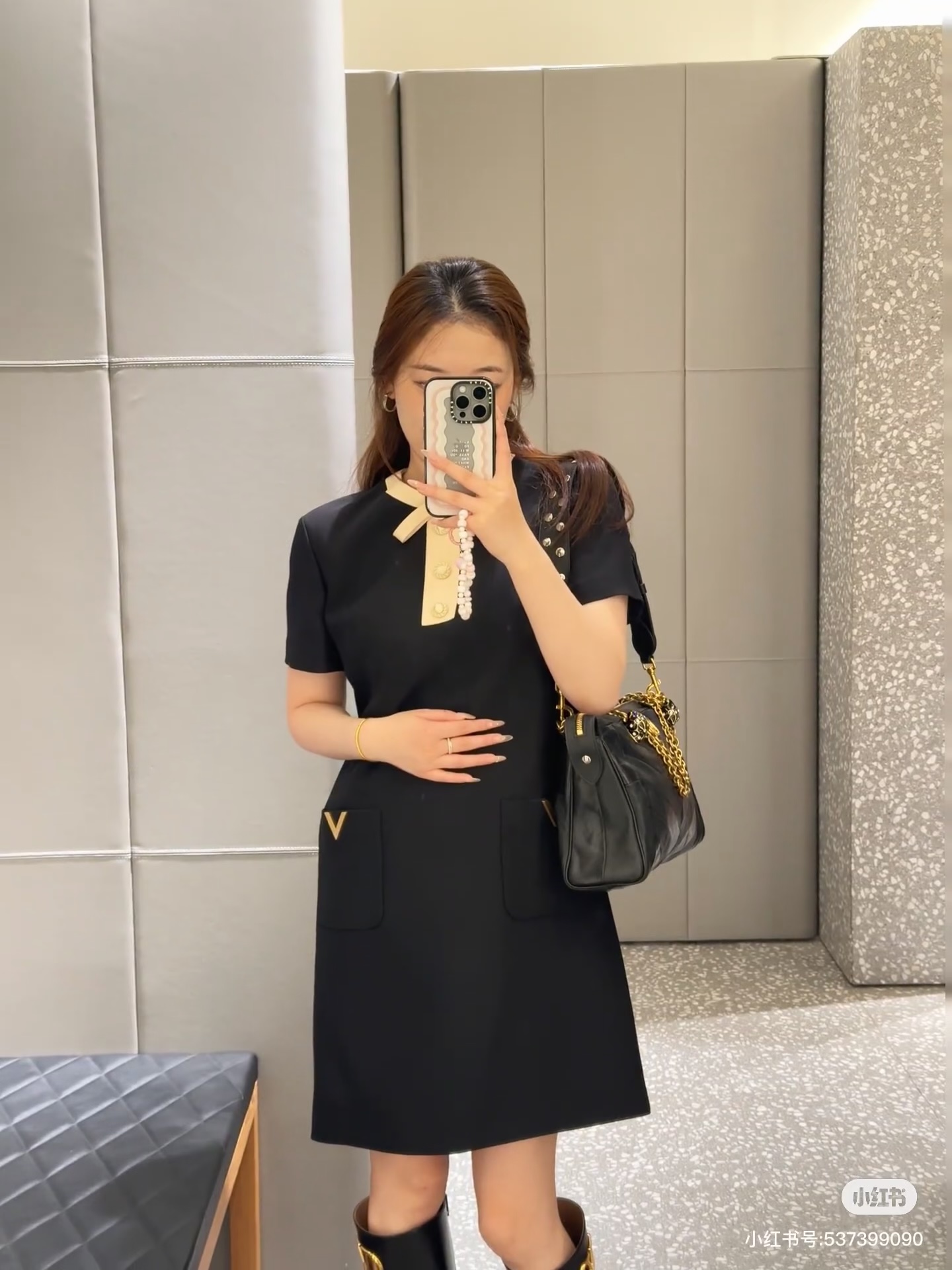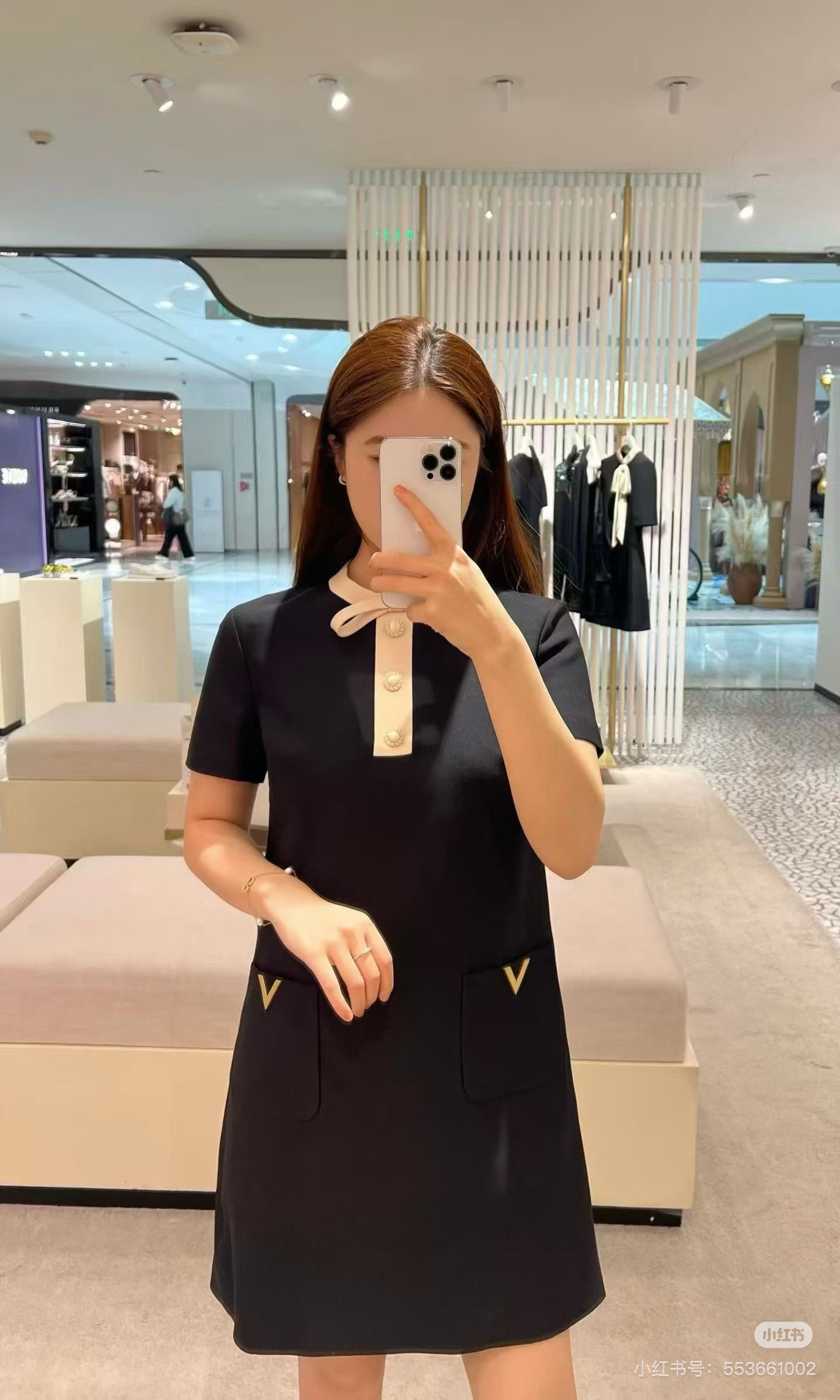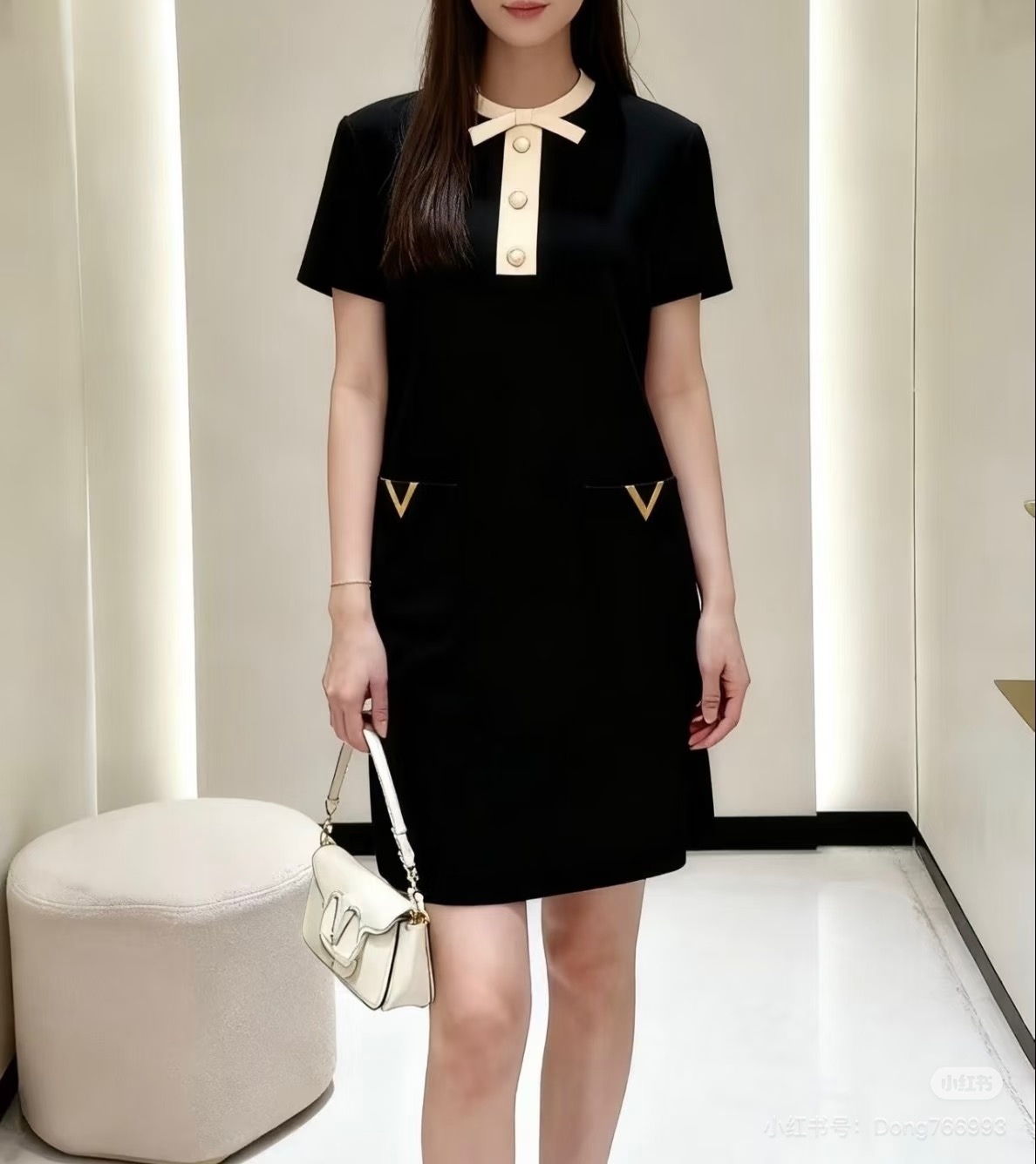 Details: High-end custom, well-crafted V-neck short-sleeved dress with bowknot and metal accents, available in black, red, and pink.