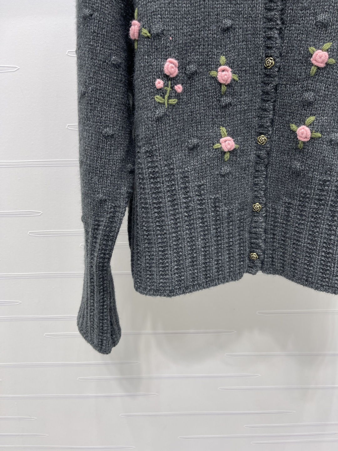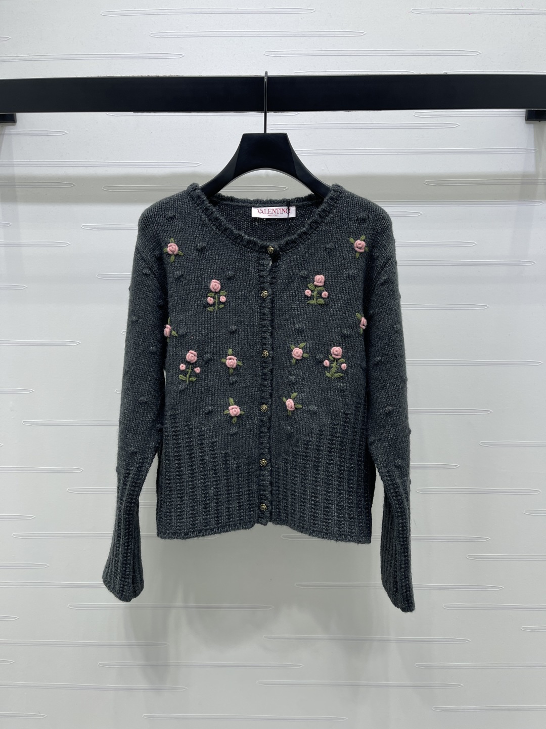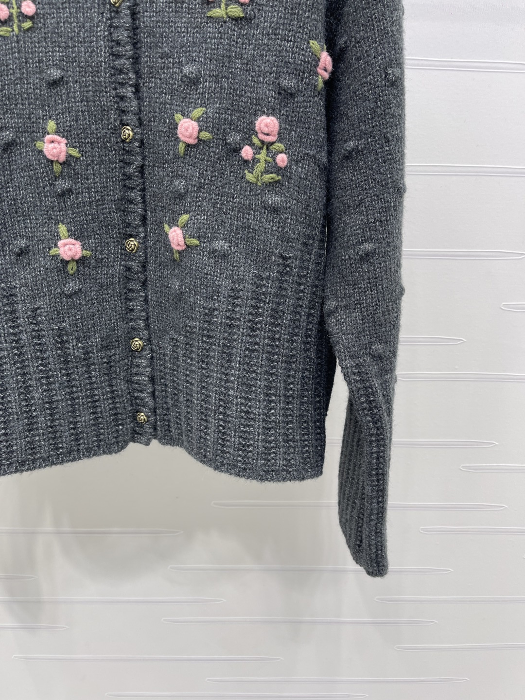 Details: Delicate floral embroidered round-neck knit cardigan in custom wool, featuring a soft texture, scalloped collar, and intricate floral embroidery, exuding a sweet and gentle forest-style charm, suitable for daily wear in autumn and winter, available in two colors and sizes S, M, L. High-end customization, exquisite craftsmanship
