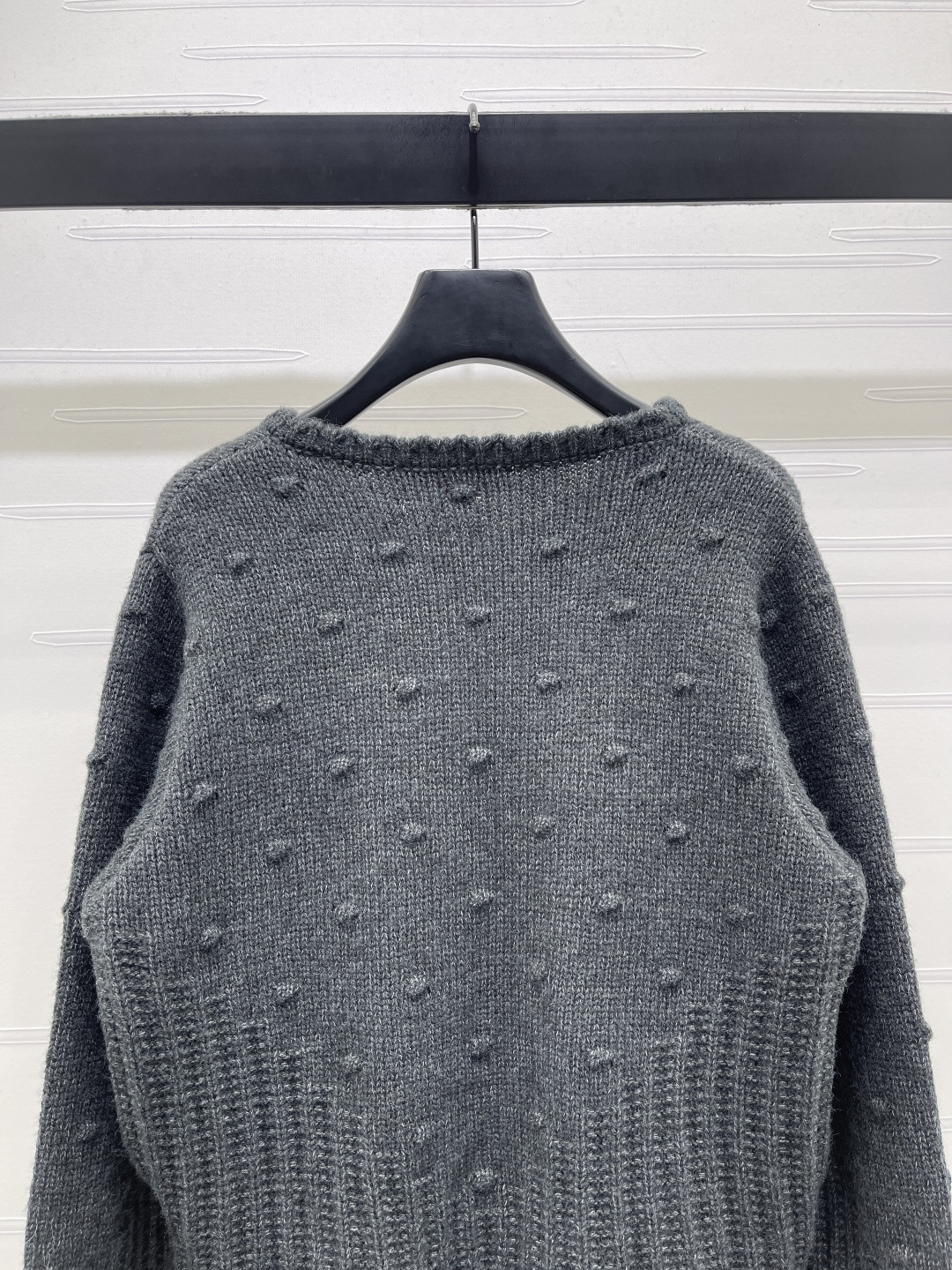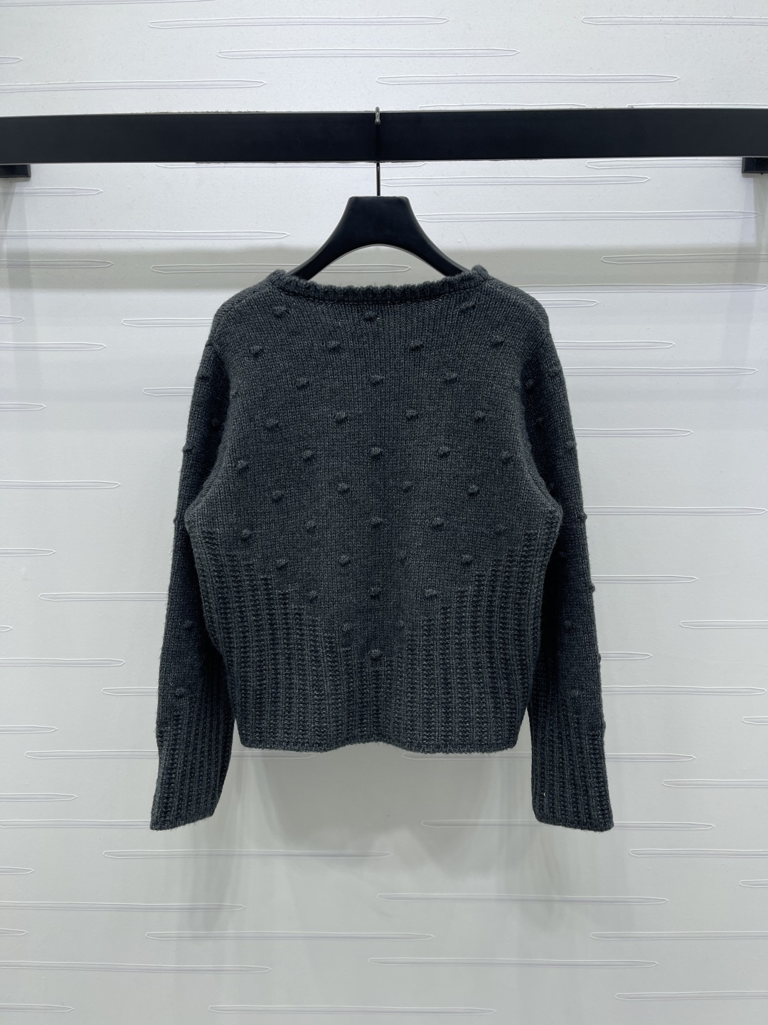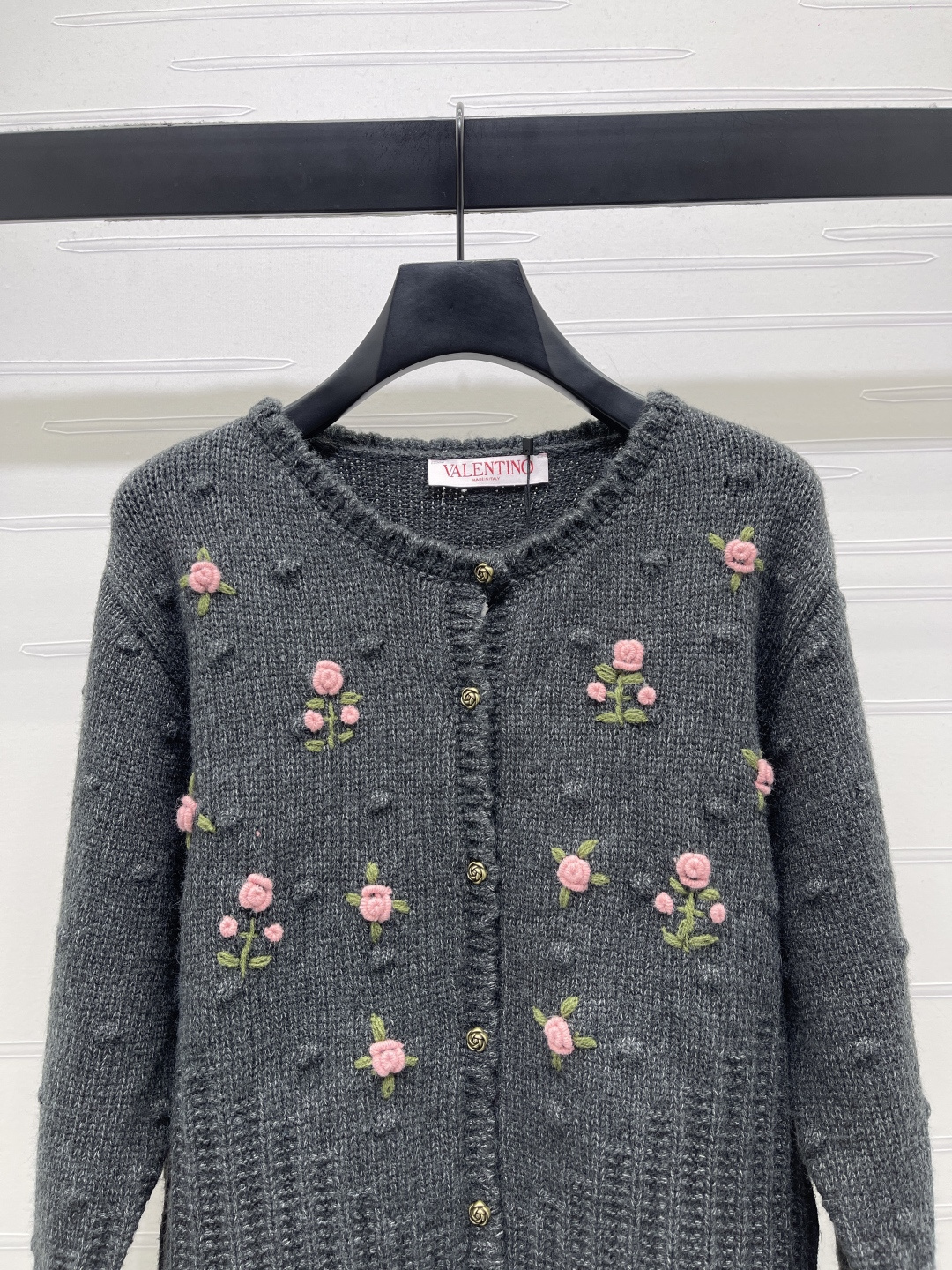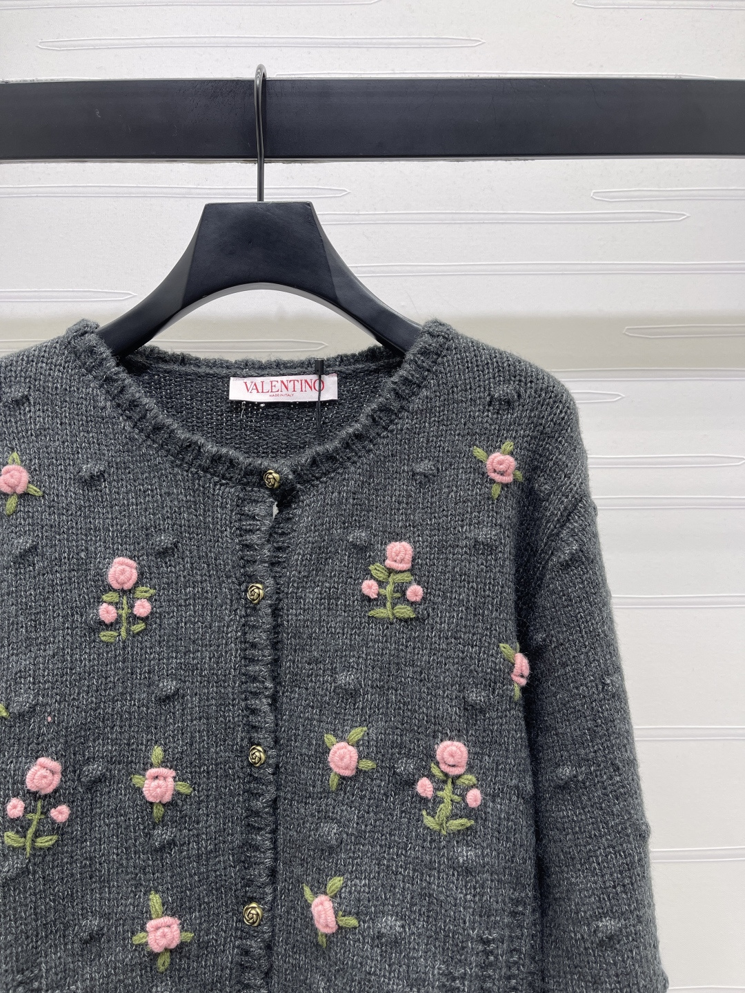 Details: Delicate floral embroidered round-neck knit cardigan in custom wool, featuring a soft texture, scalloped collar, and intricate floral embroidery, exuding a sweet and gentle forest-style charm, suitable for daily wear in autumn and winter, available in two colors and sizes S, M, L. High-end customization, exquisite craftsmanship