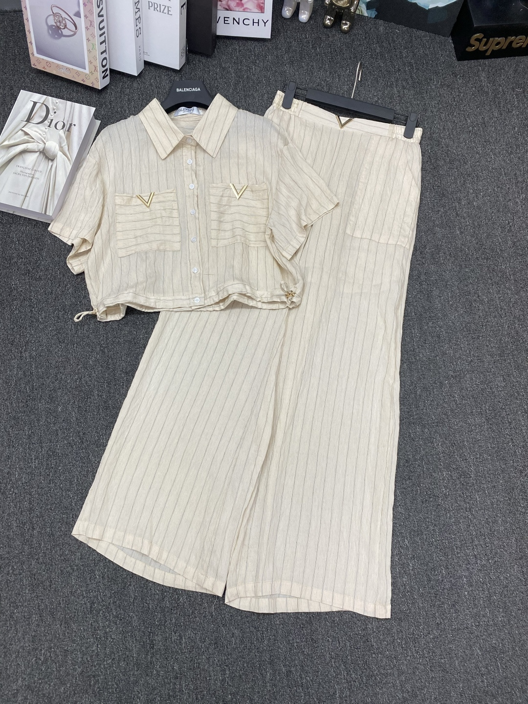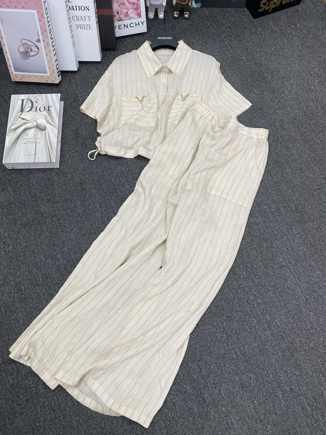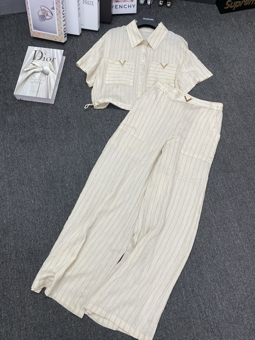 Details: New suit paired with metal V - letter striped shirt and wide - leg pants. It s slimming and comes in three colors. Premium customization and fine workmanship, with 1:1 original quality.