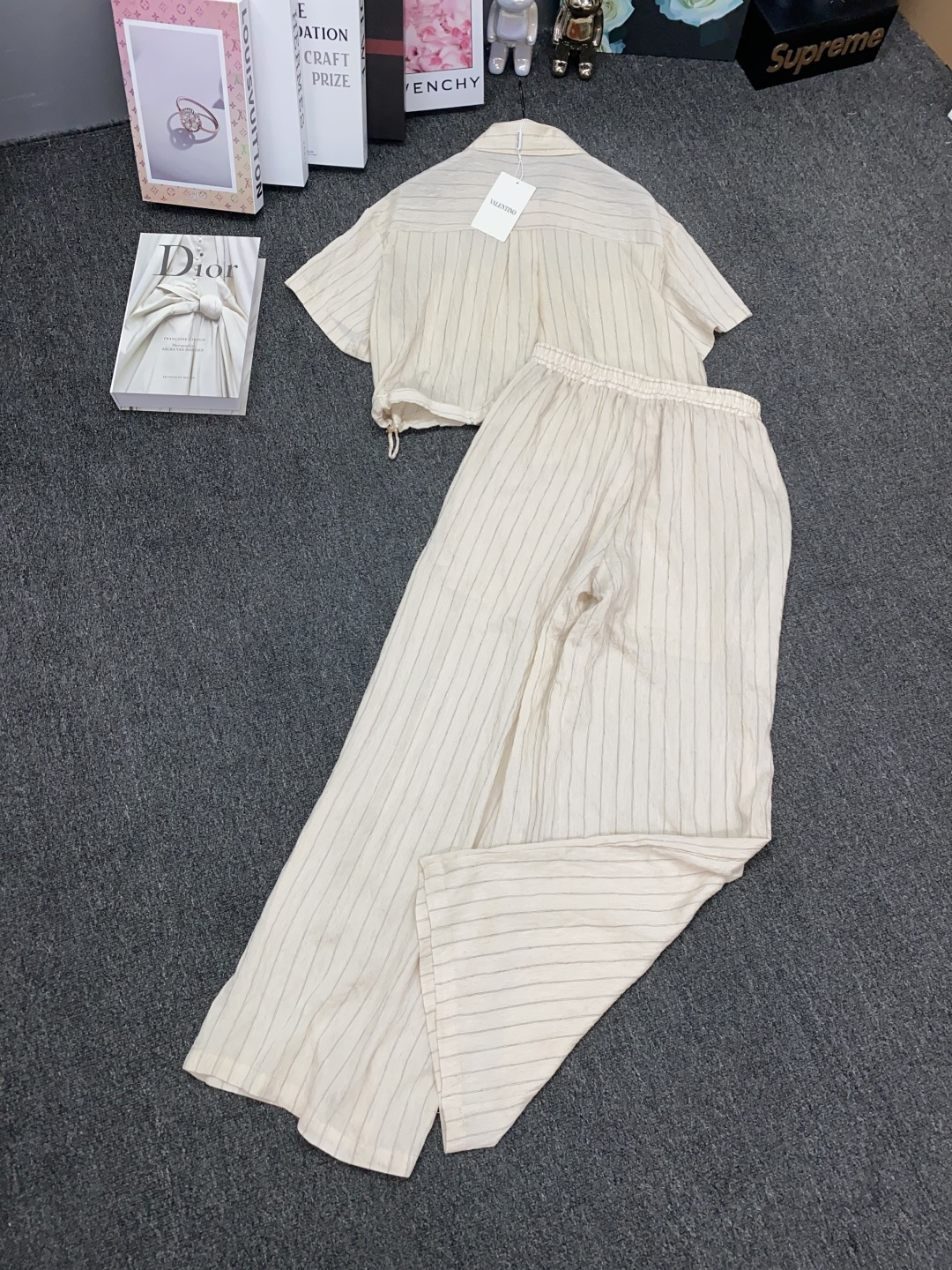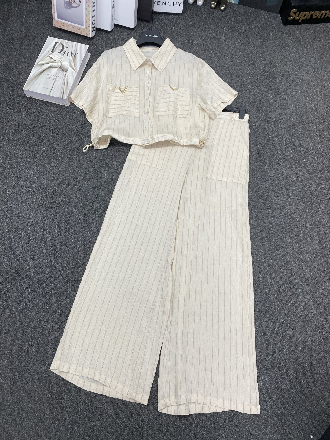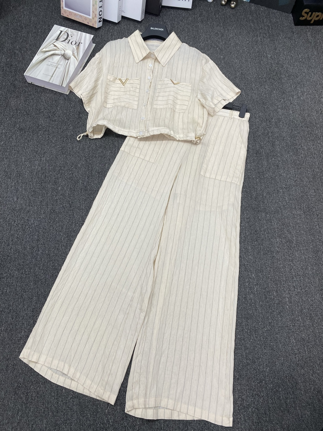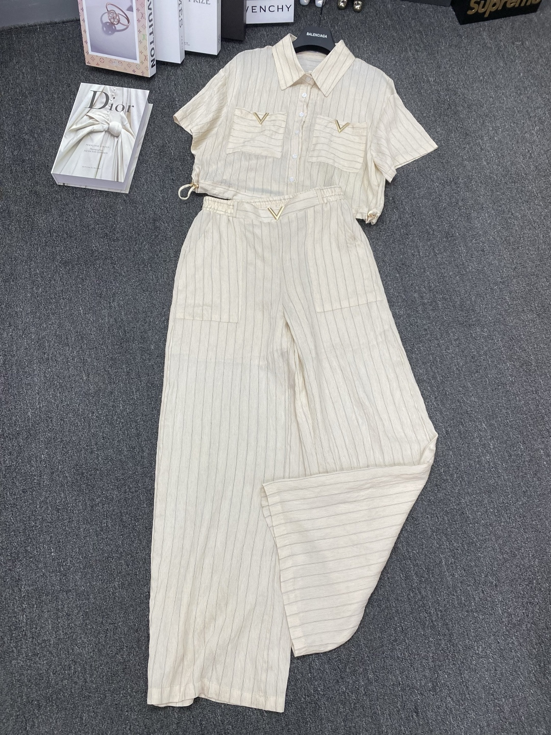 Details: New suit paired with metal V - letter striped shirt and wide - leg pants. It s slimming and comes in three colors. Premium customization and fine workmanship, with 1:1 original quality.