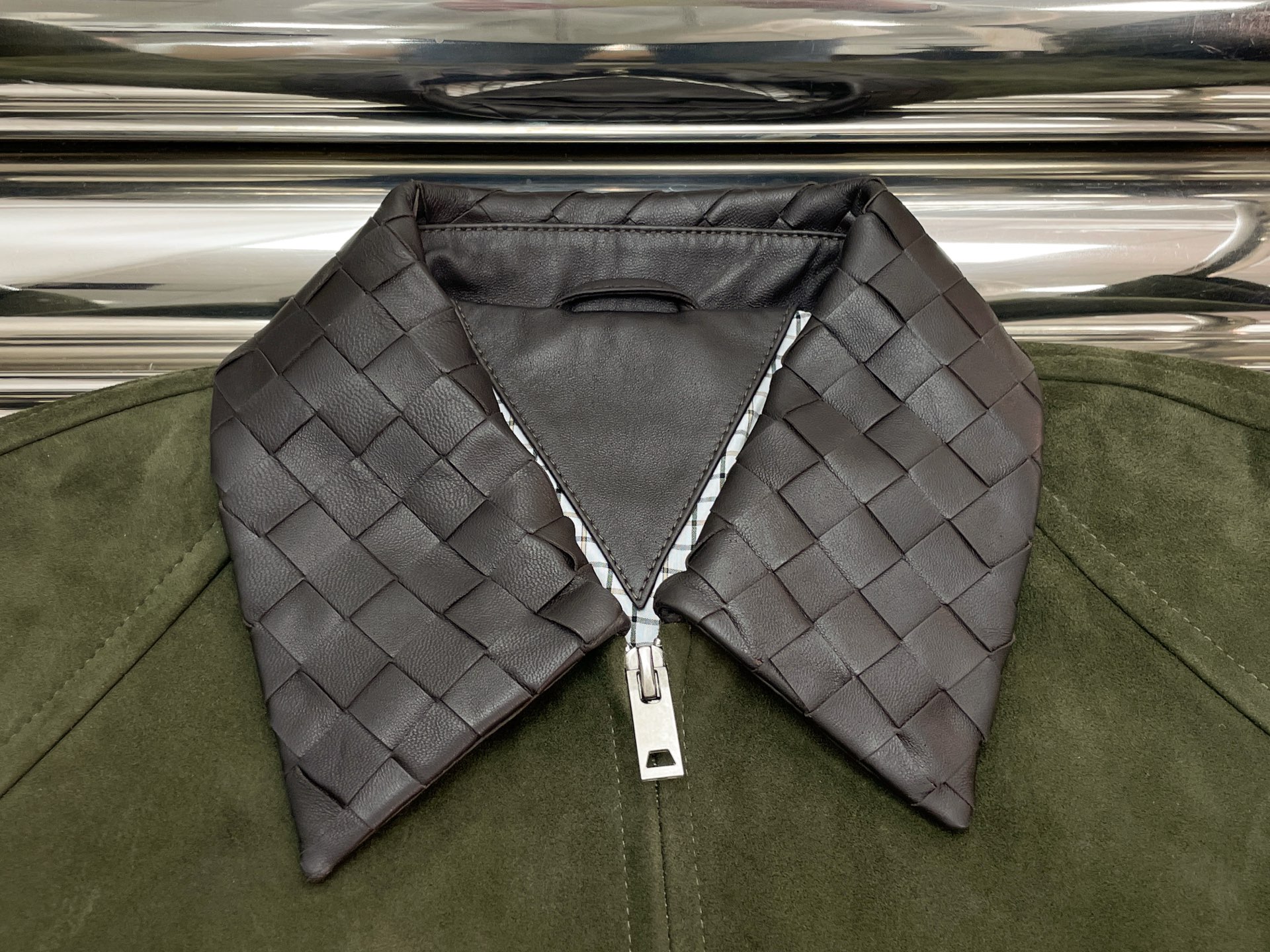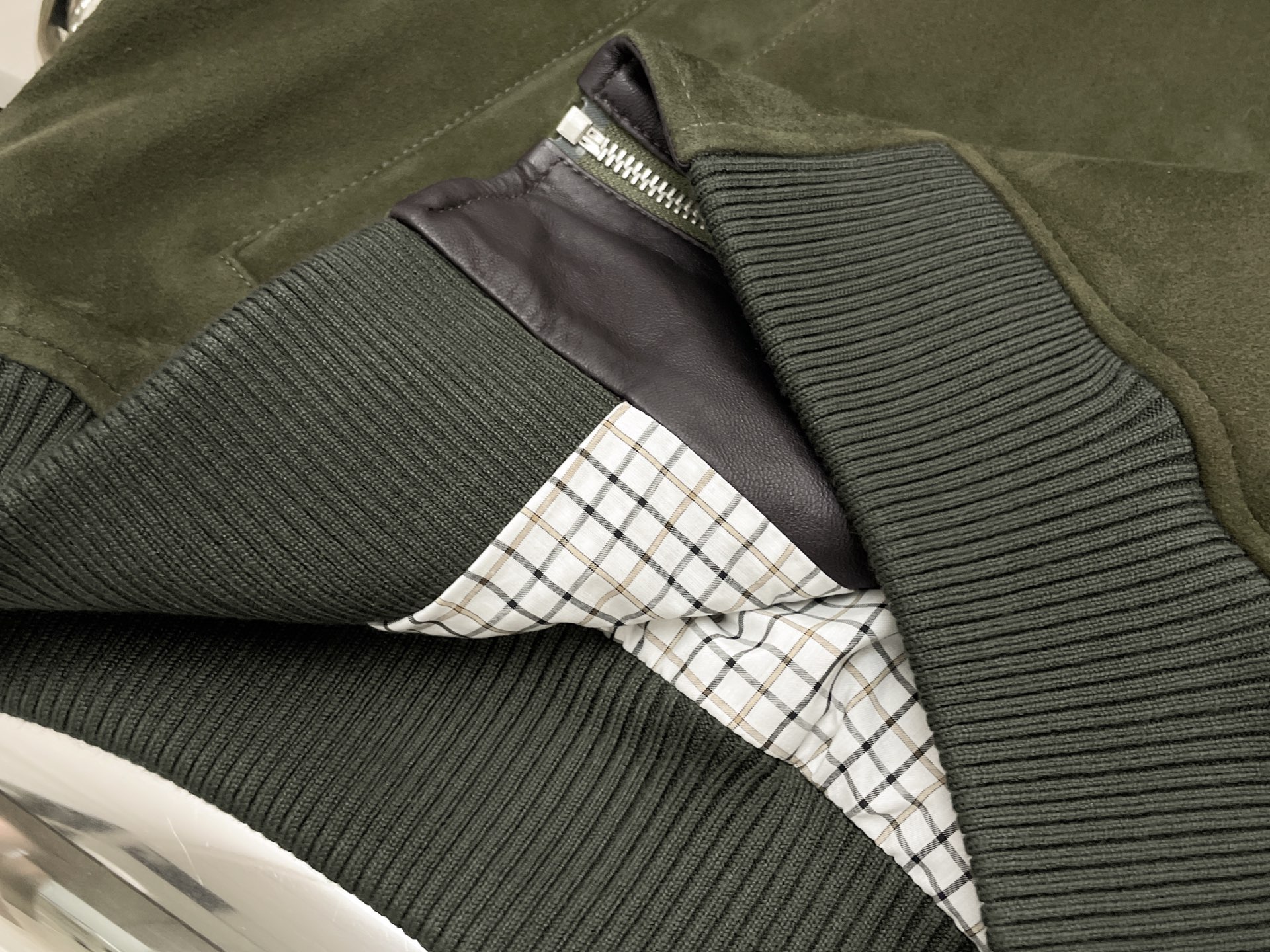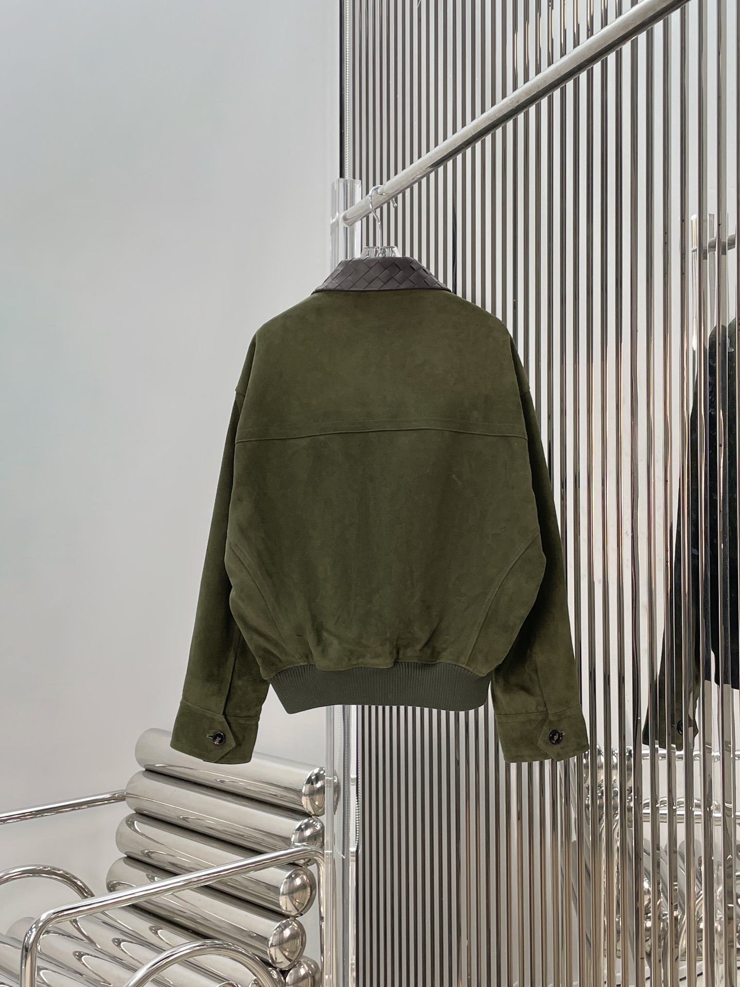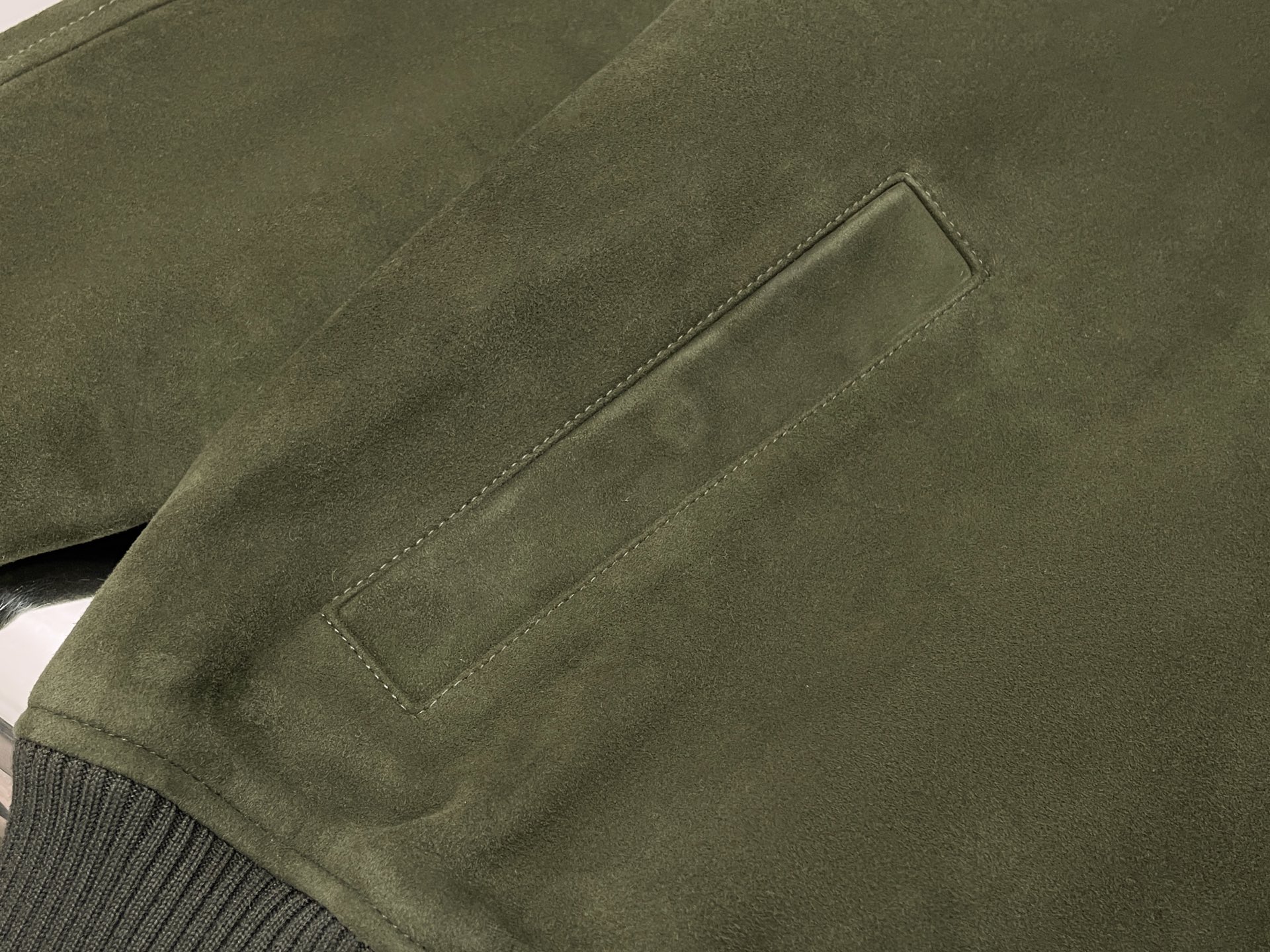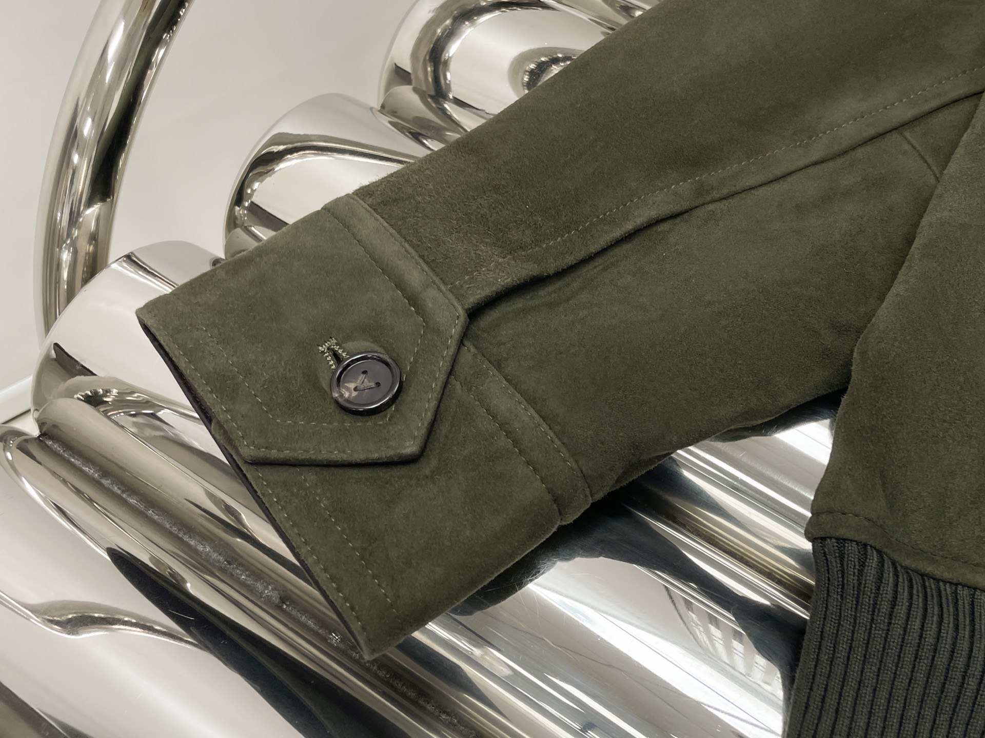 Details: New knitted leather collar dark green suede jacket, sizes SML.