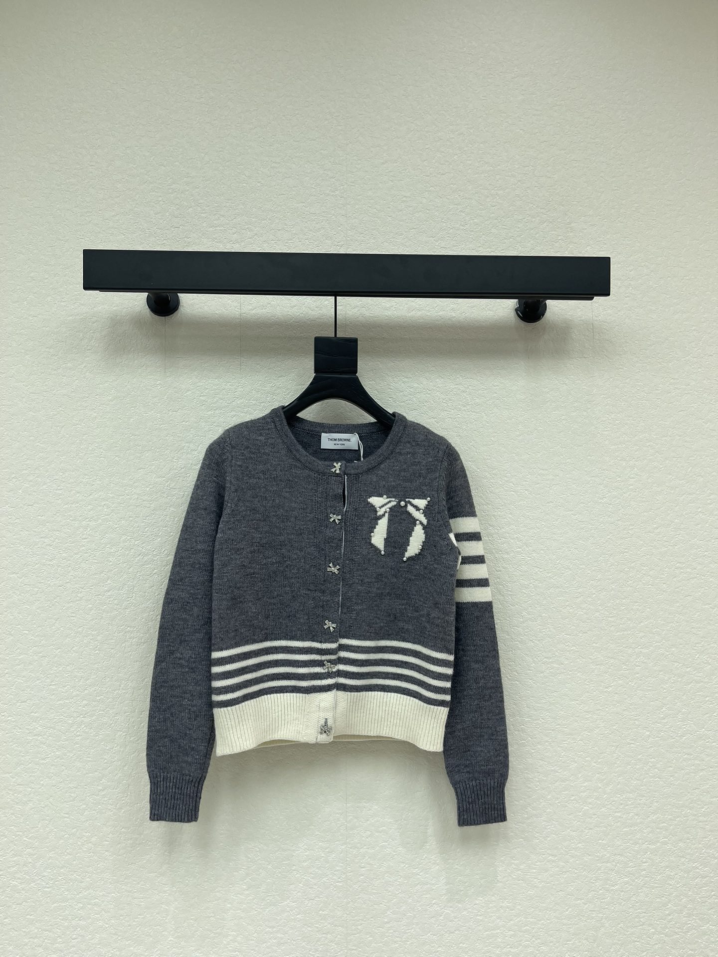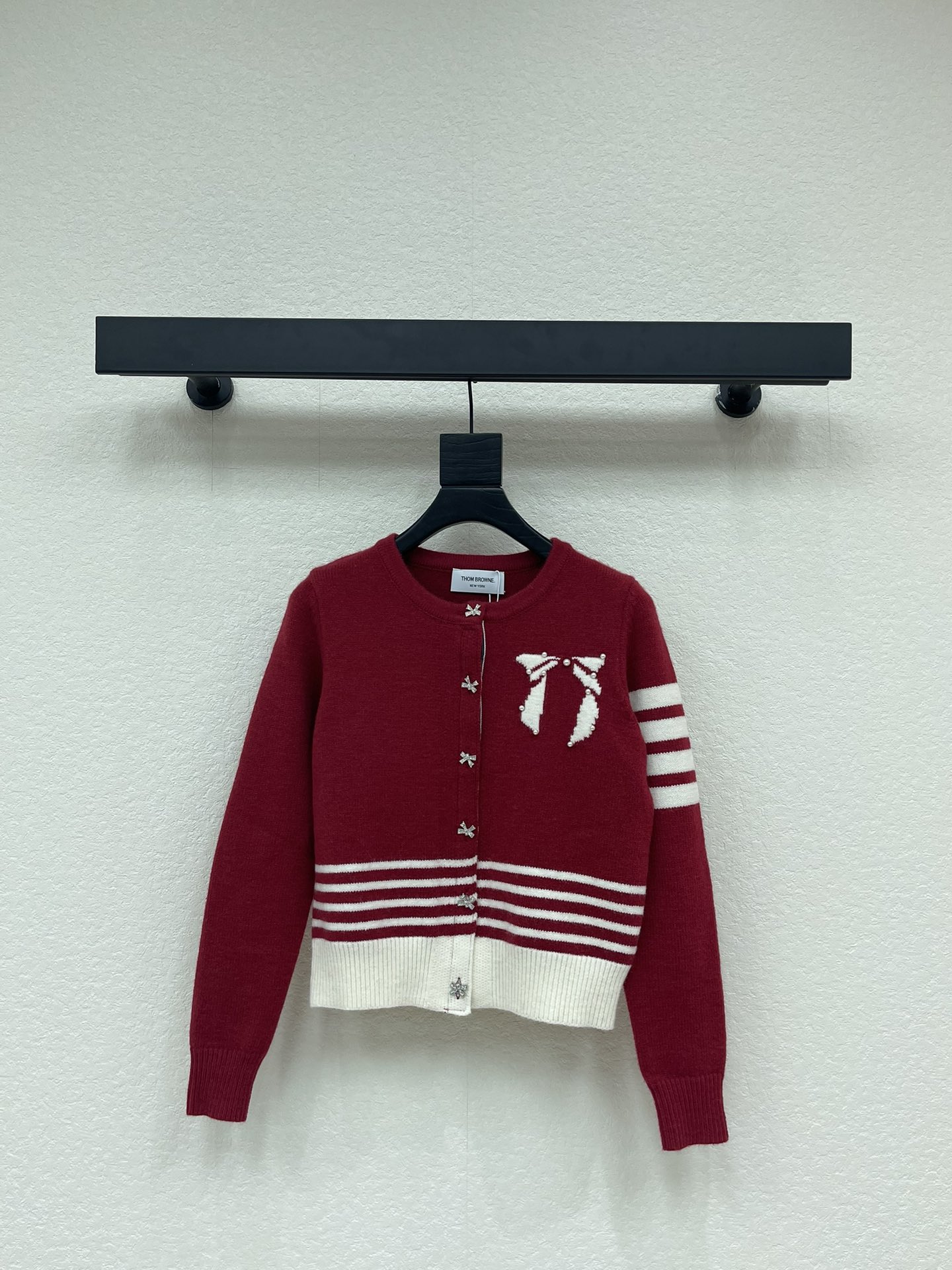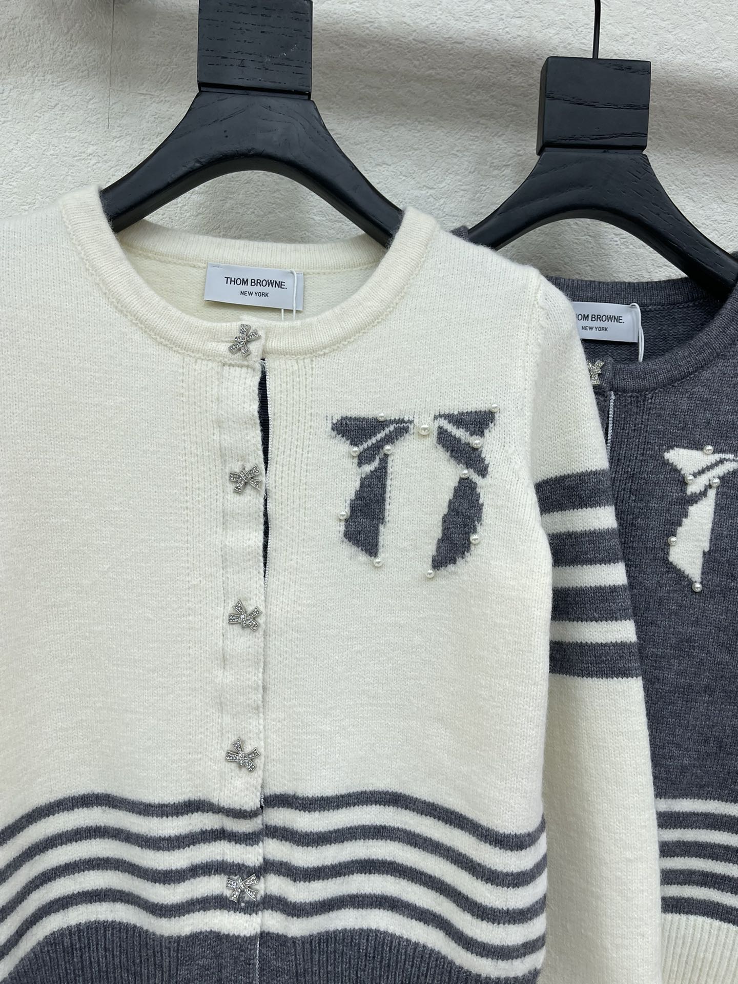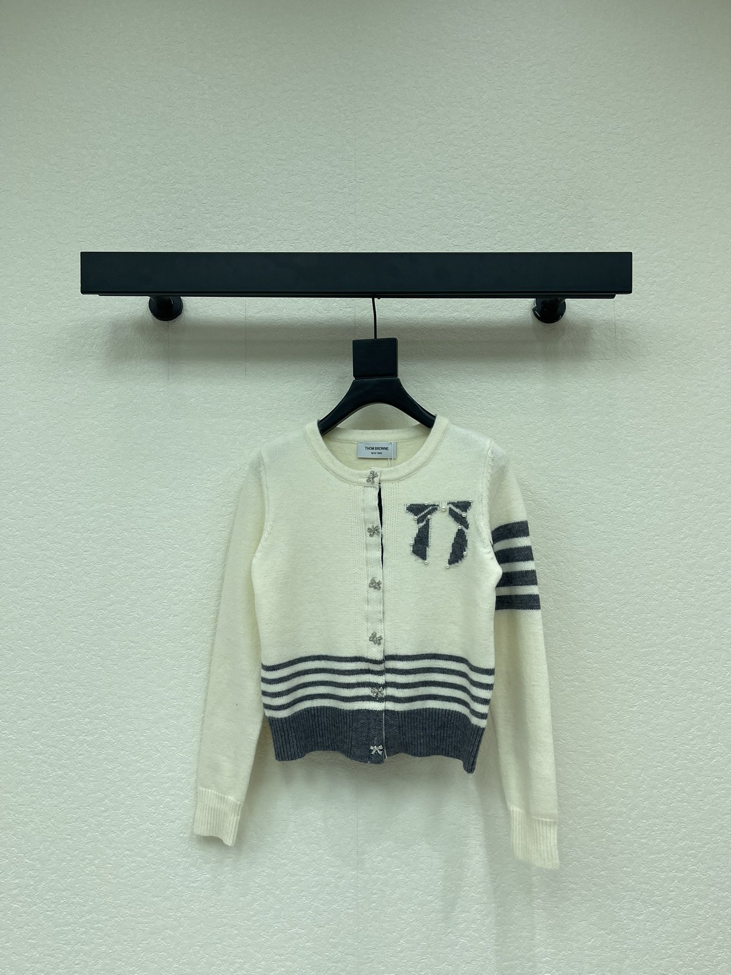 Details: Early spring s new round-neck cardigan with pearl-embellished bow, crafted from wool blend, featuring contrasting stripes and diamond-encrusted buttons, presenting a high-end and stylish appearance.