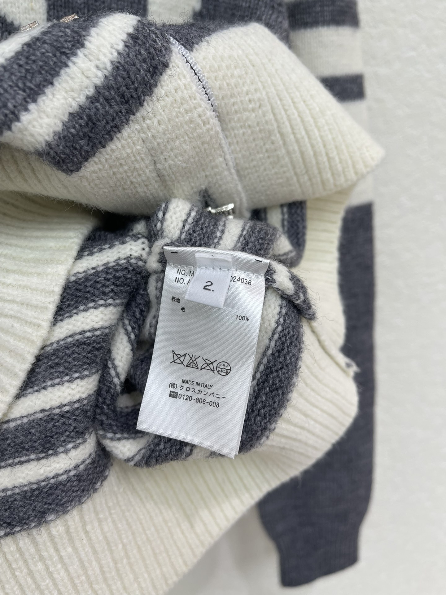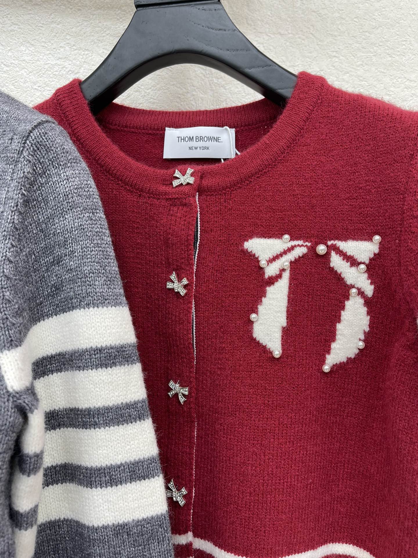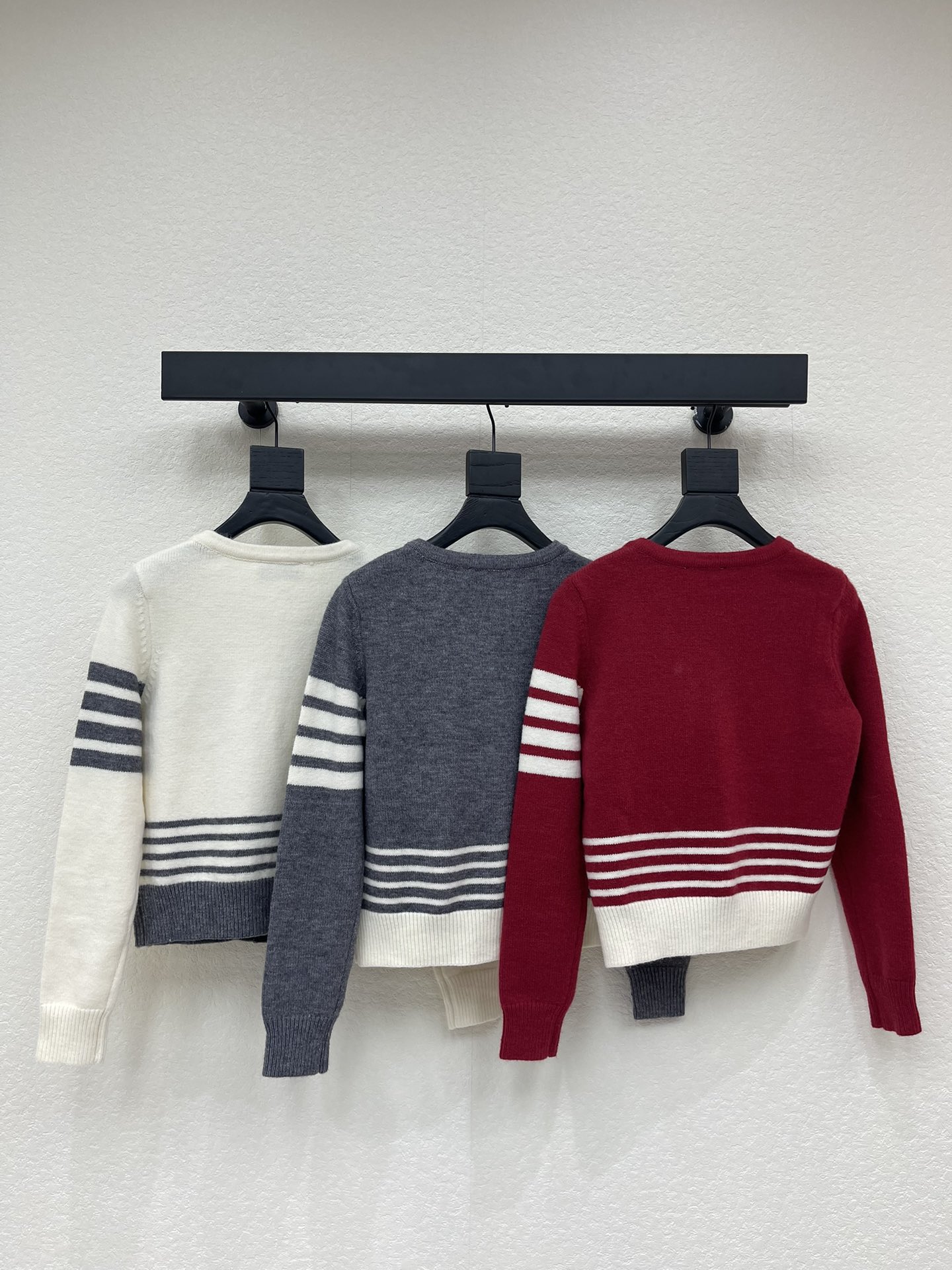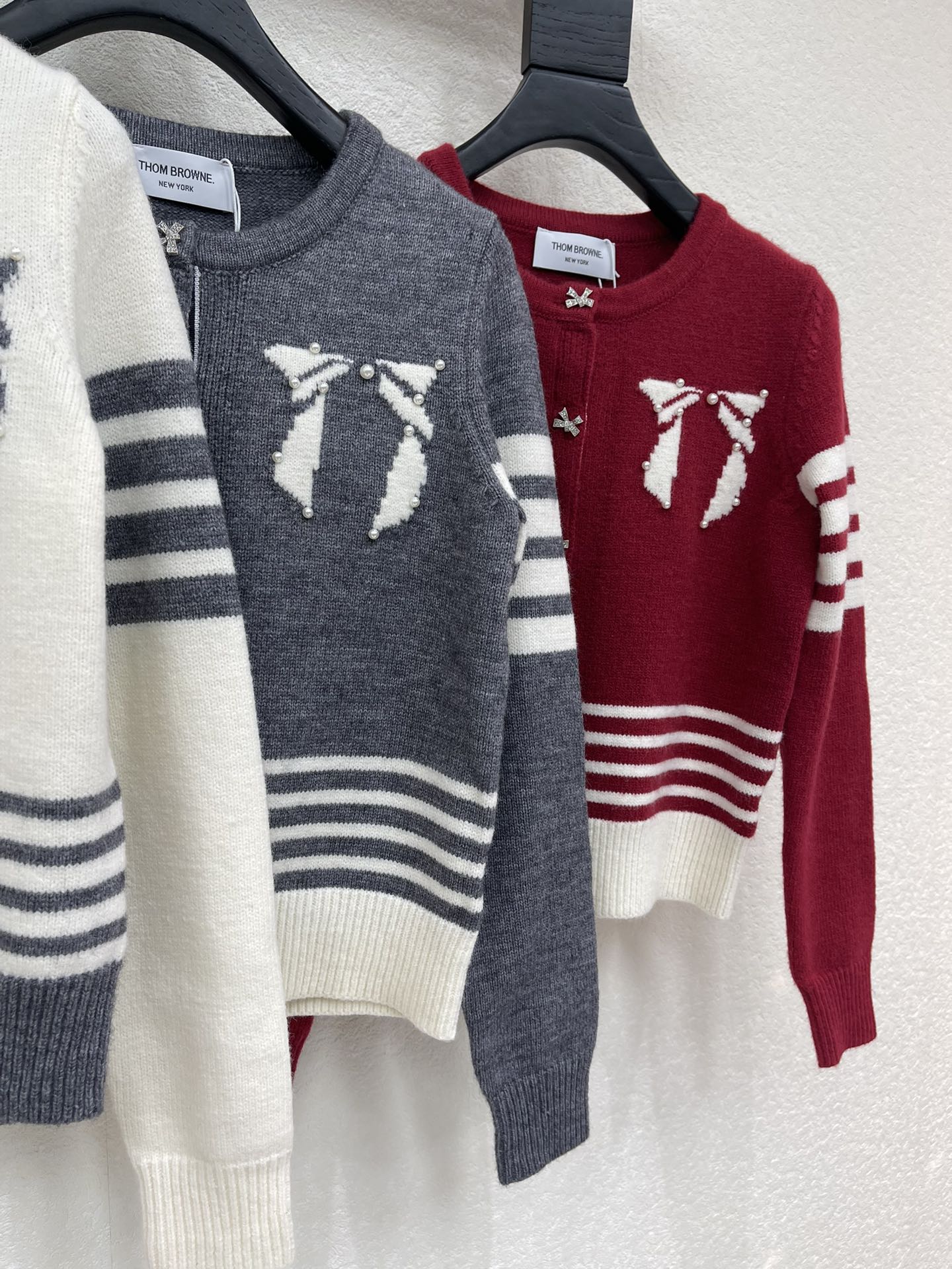 Details: Early spring s new round-neck cardigan with pearl-embellished bow, crafted from wool blend, featuring contrasting stripes and diamond-encrusted buttons, presenting a high-end and stylish appearance.
