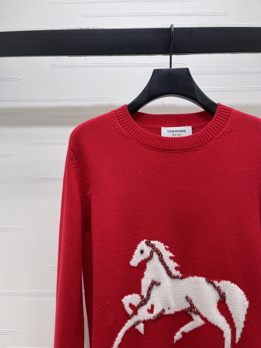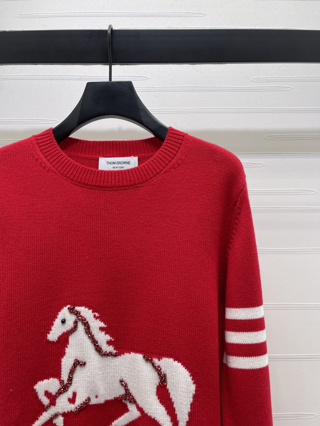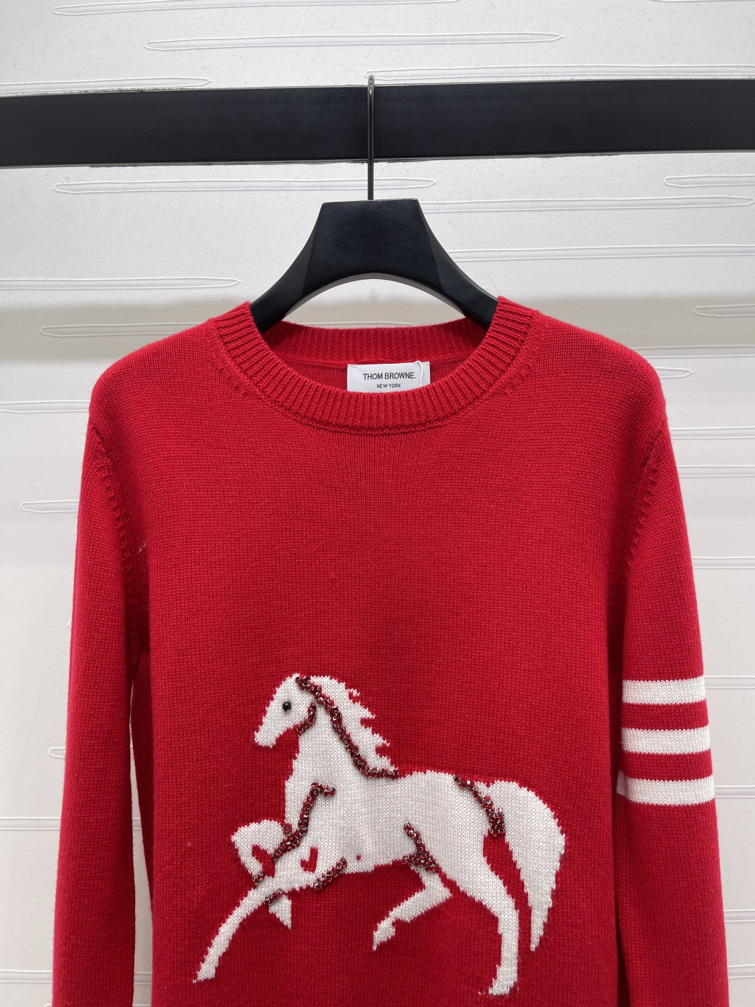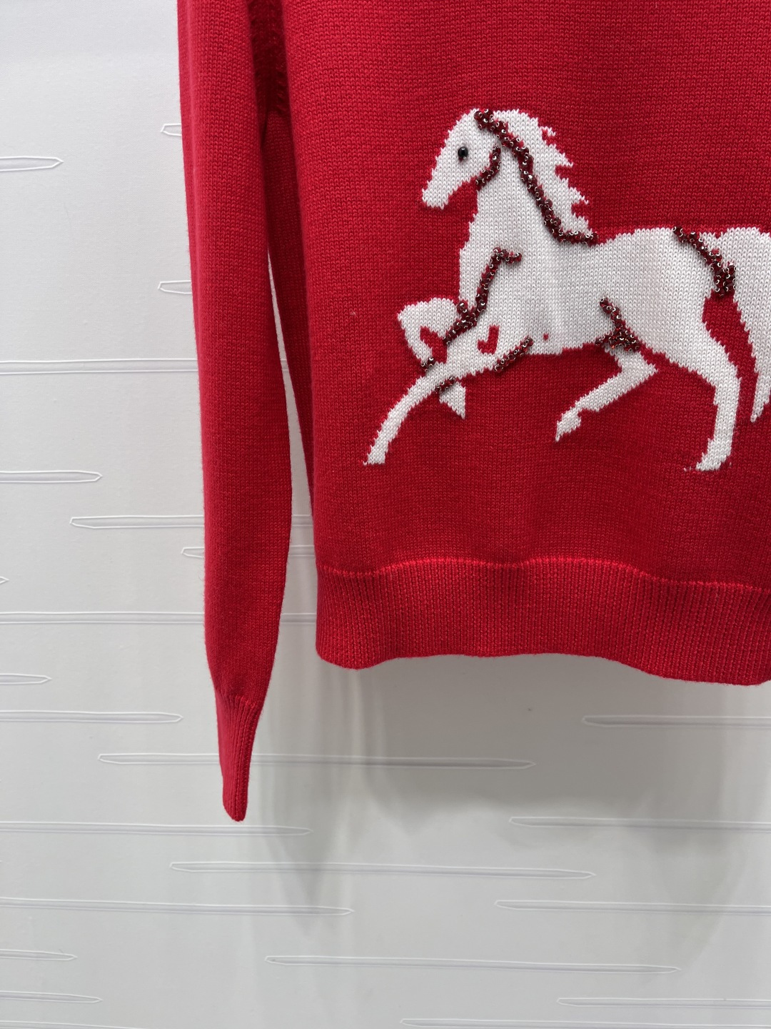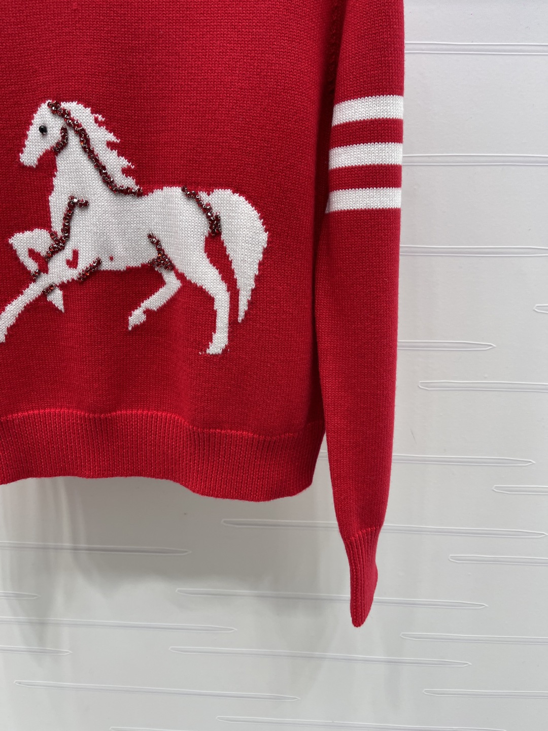 Details: early spring new arrival, contrast horse intarsia knit sweater made of premium wool blend, soft and comfortable, featuring three-stripe sleeve, diamond-encrusted horse intarsia and round neck, stylish design.