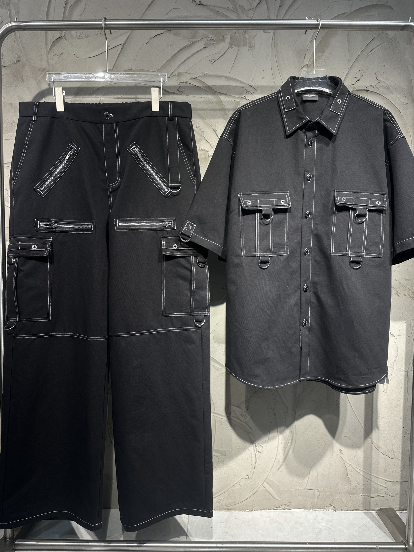 Details: Heavy metal buckle suit, shirt and pants, in black.