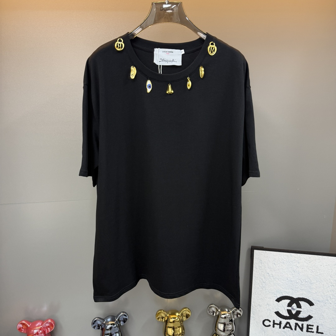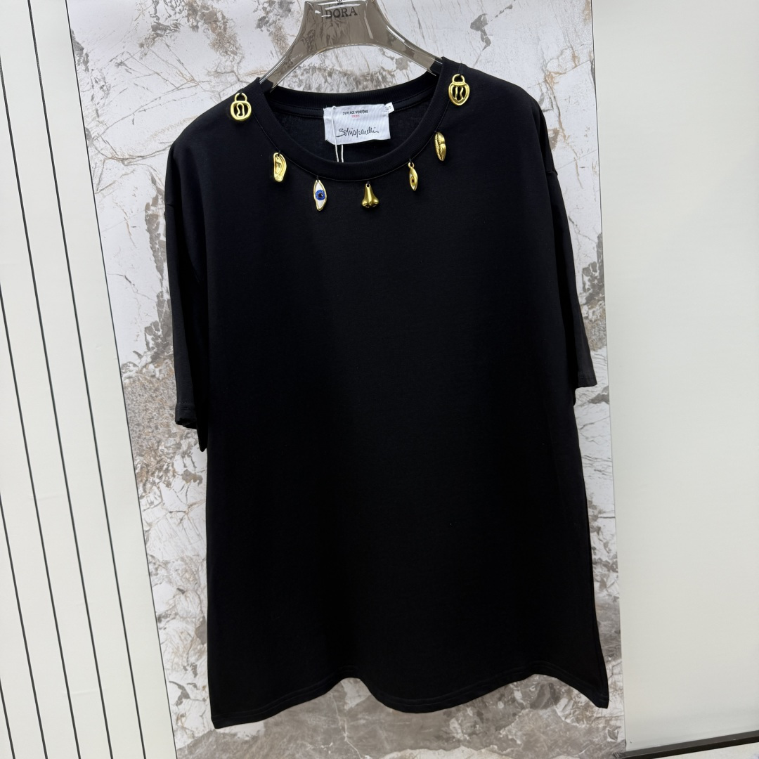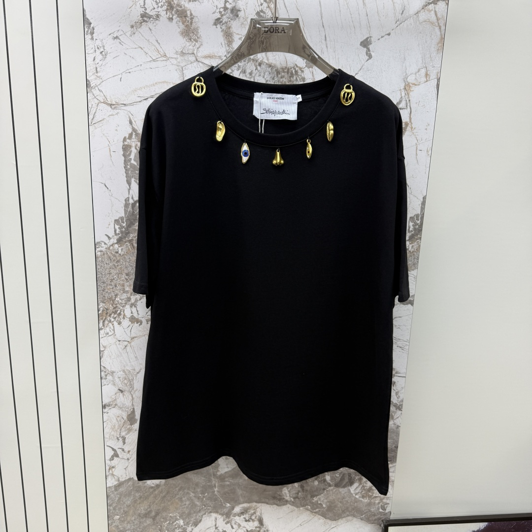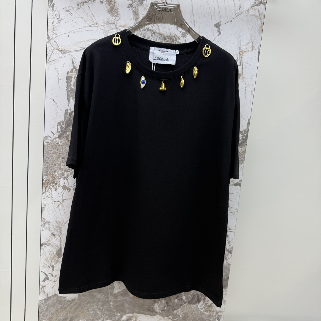 Details: Black, white, or brown tops with golden neck hardware, match jeans.